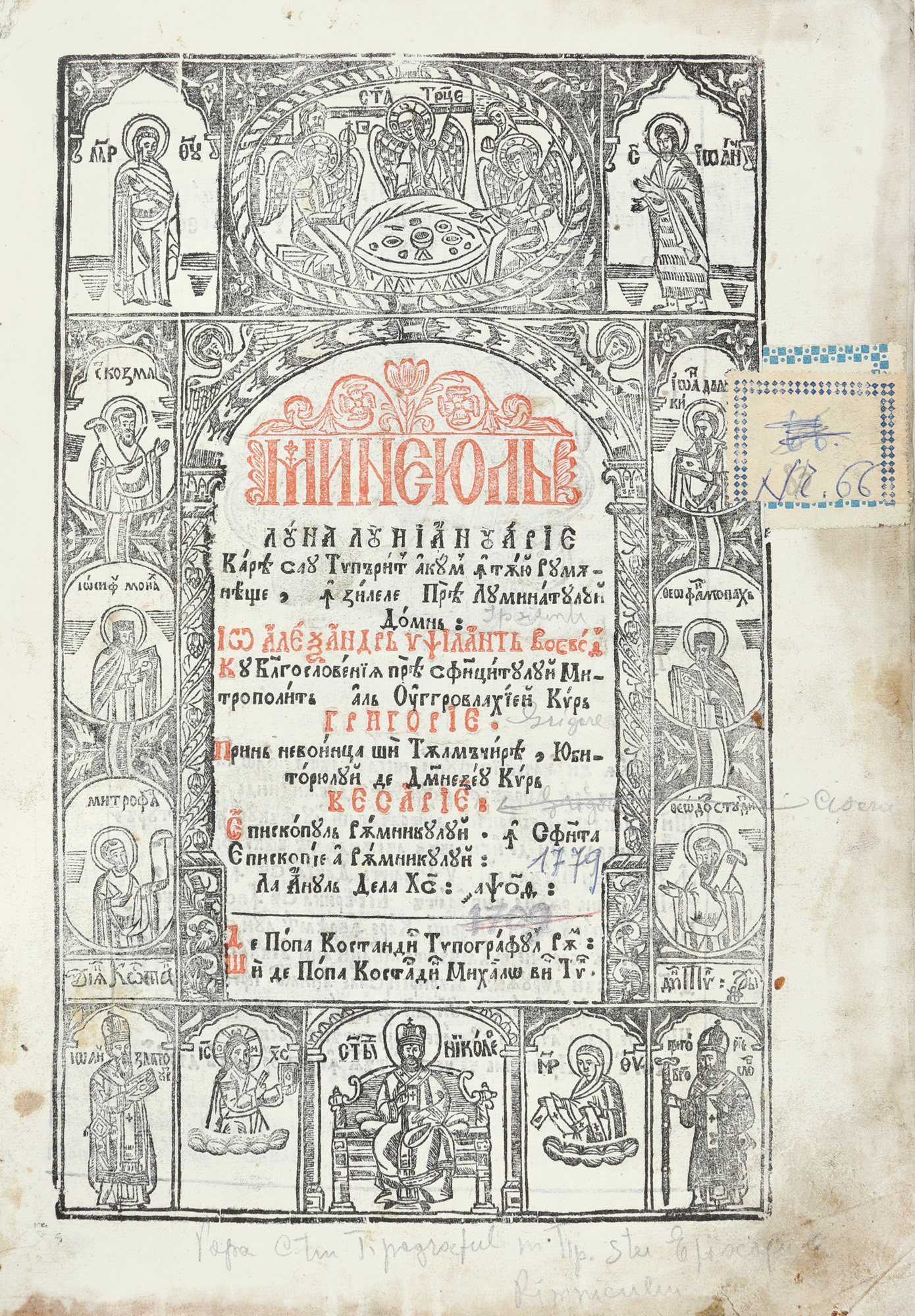 12. ”Minei pentru luna Ianuarie”, traducere de Episcopul Cesarie, tipărit în vremea domnitorului Alexandru Ipsilanti, Râmnic, 1779