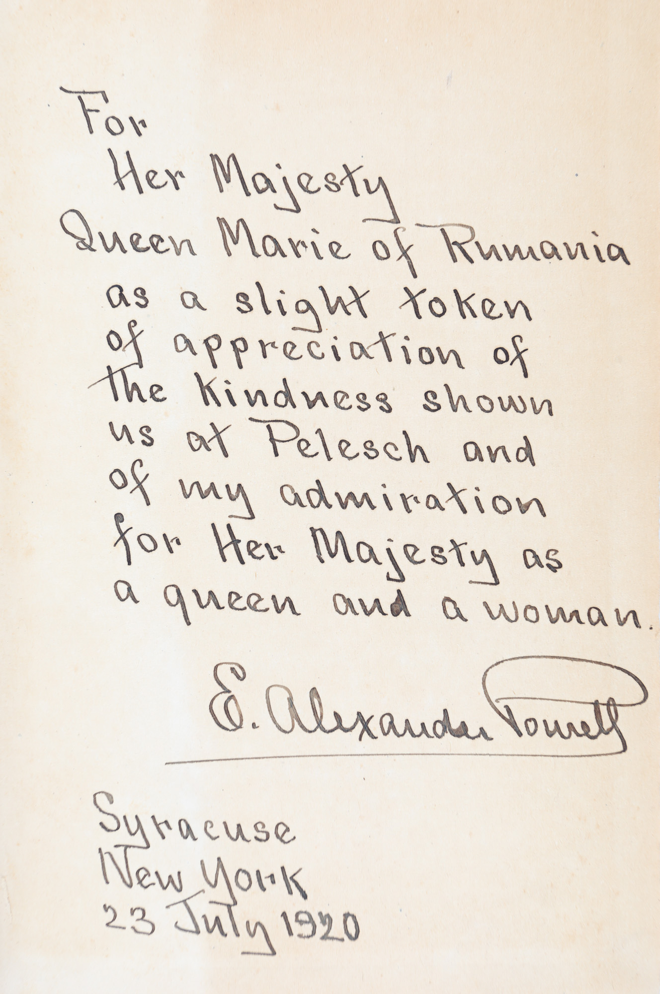 Regina Maria l-a cunoscut pe Edward Alexander Powell (1879-1957) în timpul Primului Război Mondial când acesta era corespondent de război. La începutul perioadei interbelice Powell o vizitează pe regină în România, la Peleș, și îi oferă exemplarul de față drept amintire, cu o frumoasă dedicație olografă.