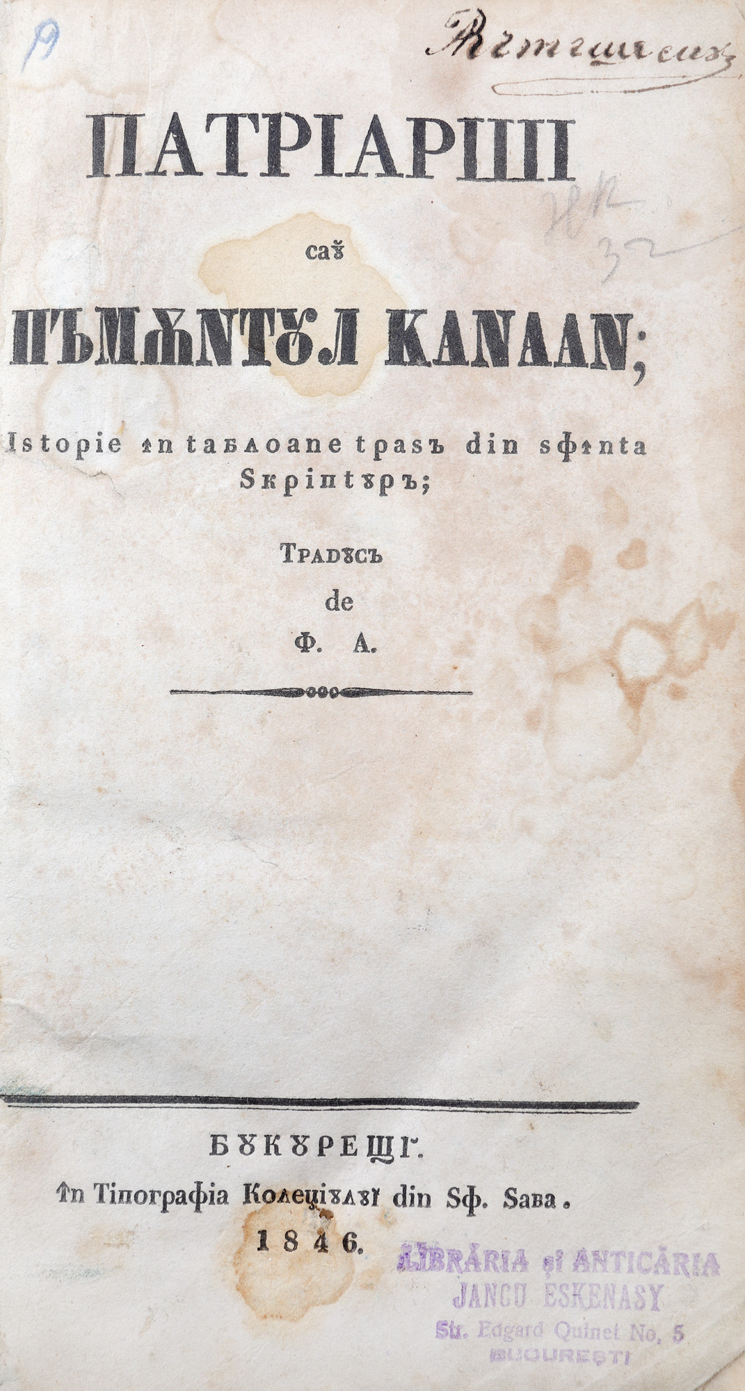 21. ”Patriarhii sau pământul Canaan”, de Florian Aaron, București, 1846
