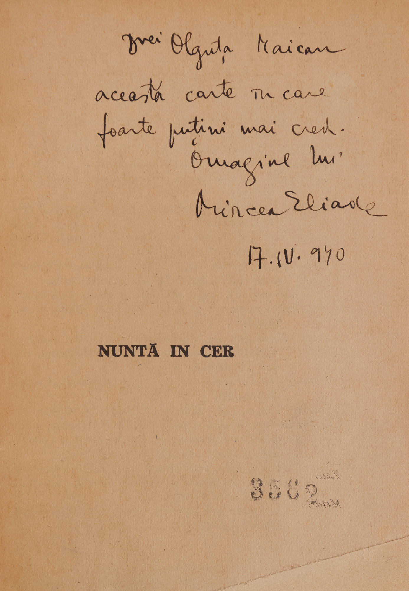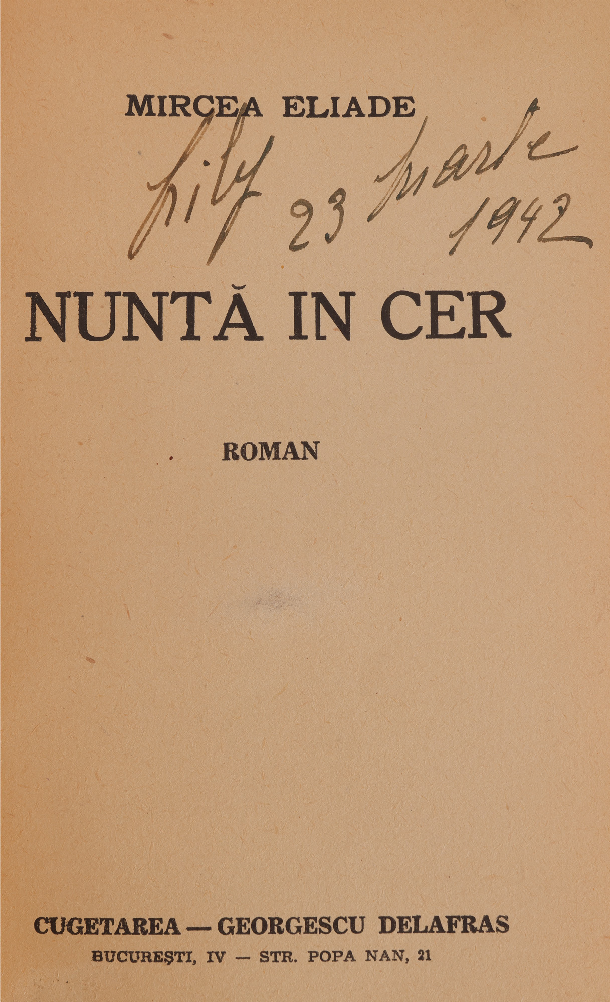 2. ”Nuntă în cer”, de Mircea Eliade, București, 1941, cu dedicația și semnătura olografă a autorului