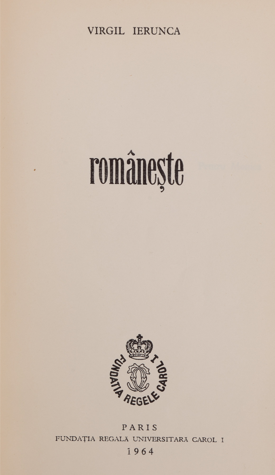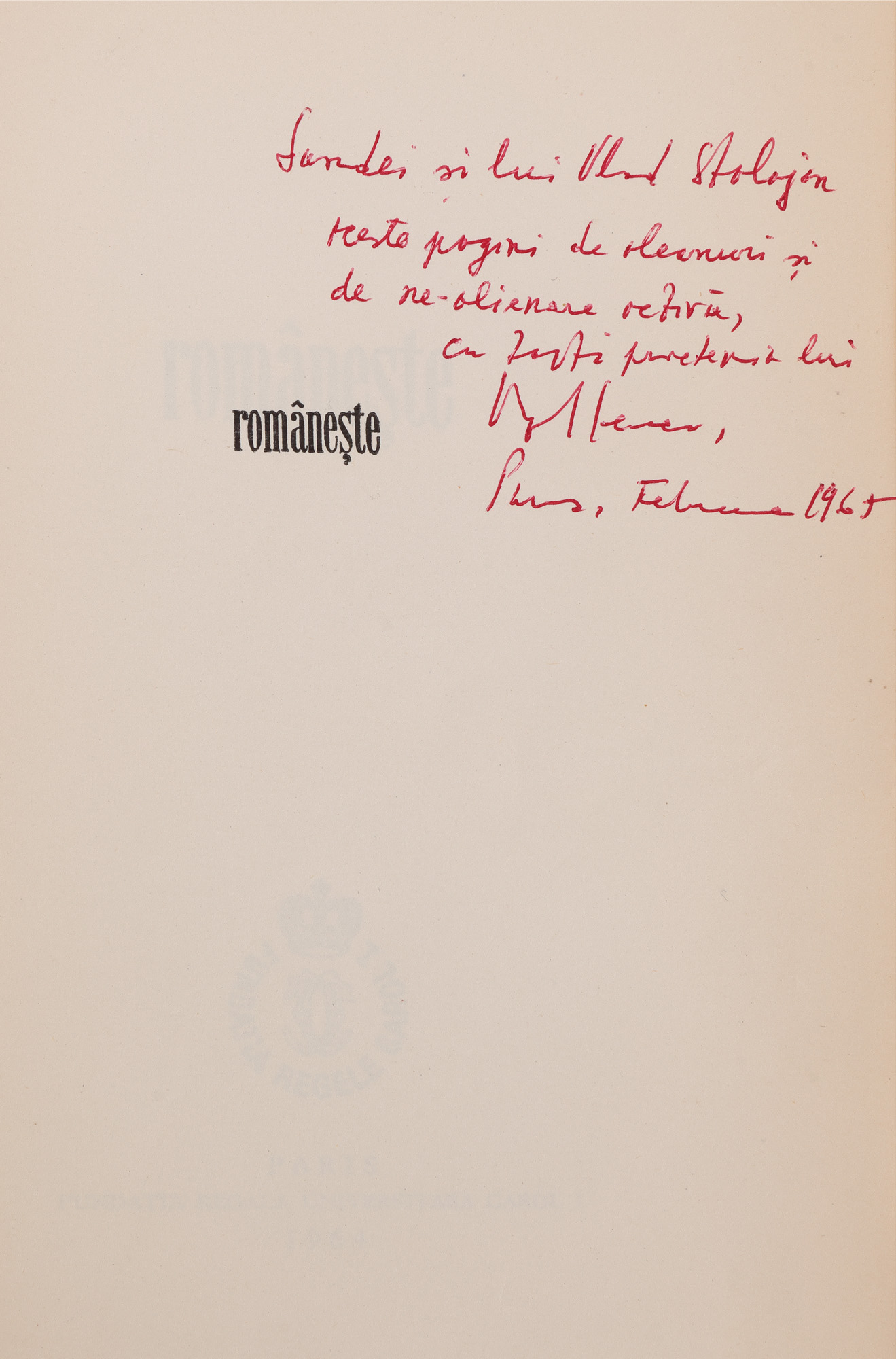 9. ”Românește”, de Virgil Ierunca, Paris, 1964, cu dedicația și semnătura olografă a autorului către familia scriitoarei Sanda Stolojan
