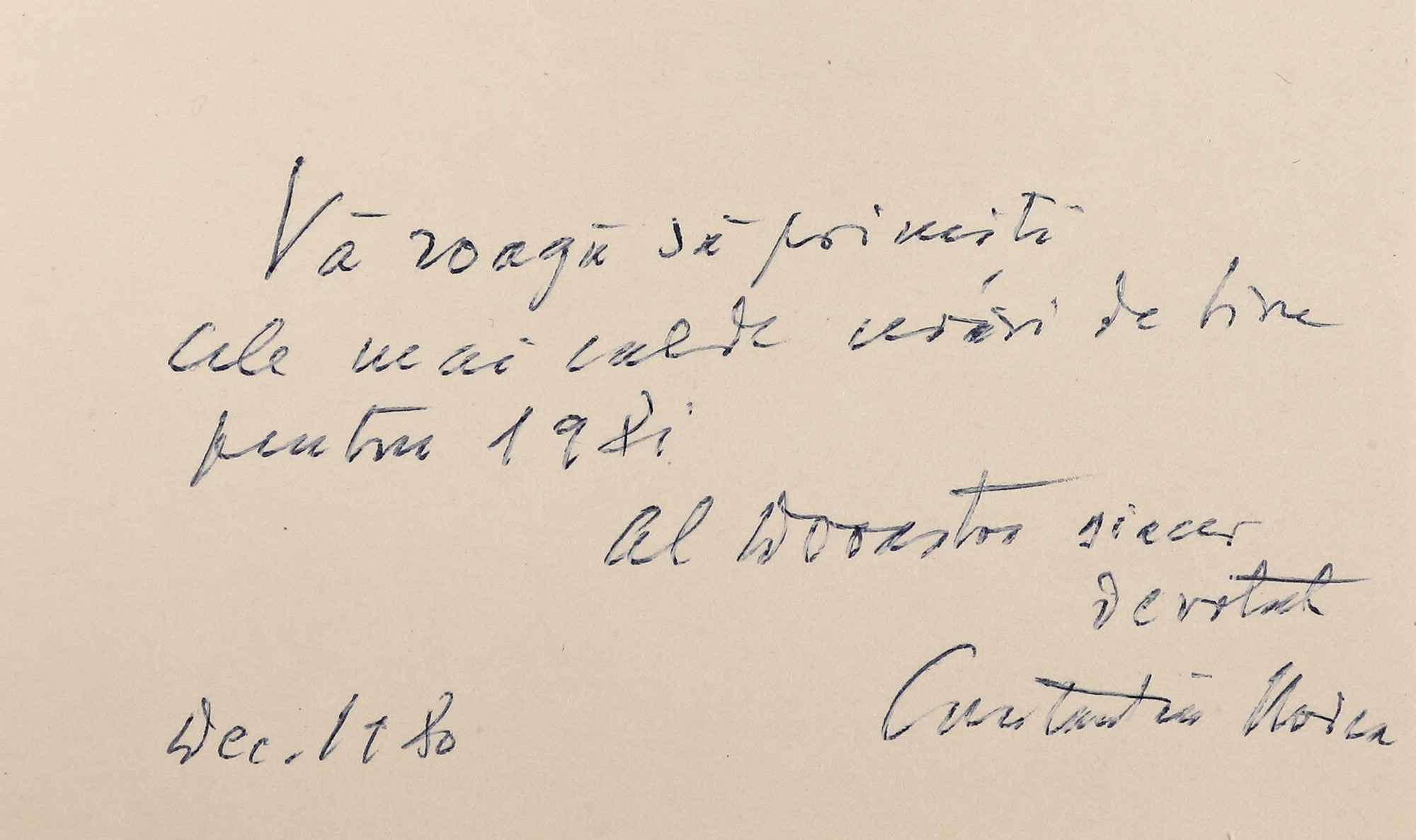 13. Carte de vizită trimisă de Constantin Noica către Zoe Dumitrescu-Bușulenga, Măldărești, decembrie 1980, cu semnătură olografă, însoțită de plic