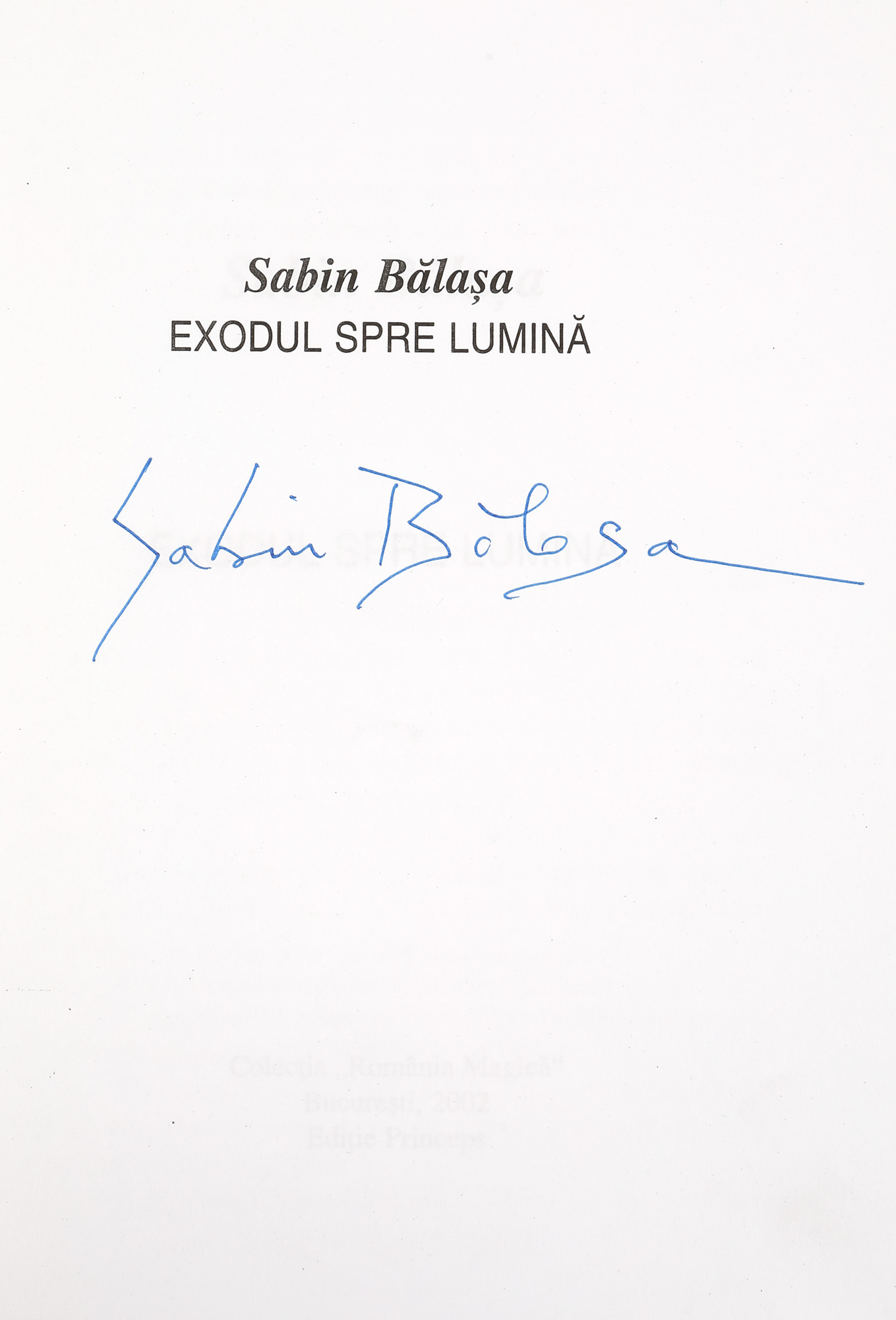 2. ”Exodul spre Lumină”, de Sabin Bălașa, ediție princeps, București, 2002, cu semnătura olografă a autorului