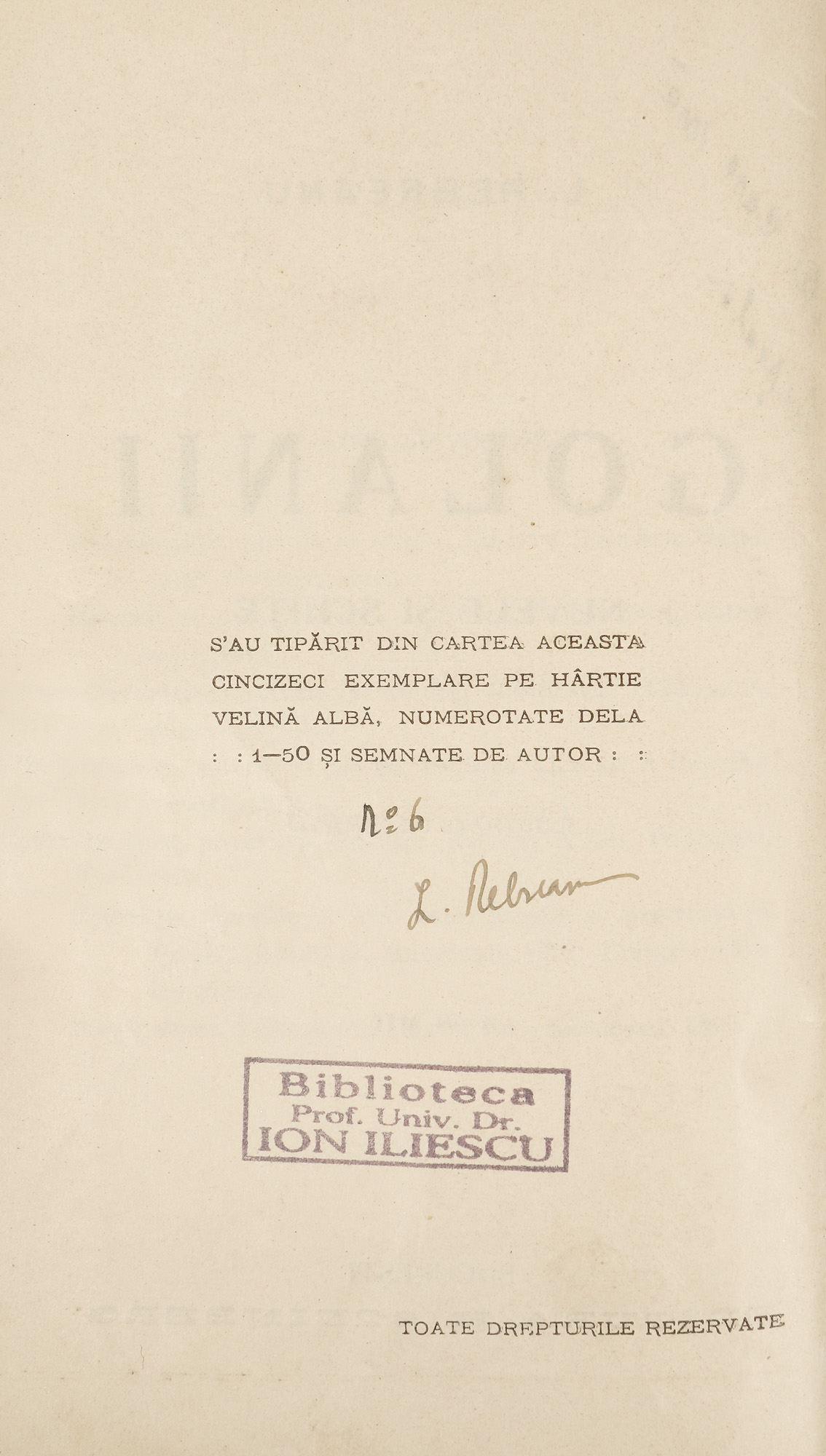 24. ”Golanii”, de Liviu Rebreanu, București, 1920, cu semnătura olografă a autorului și ilustrații de Francisc Şirato, exemplar numerotat 6 din 50