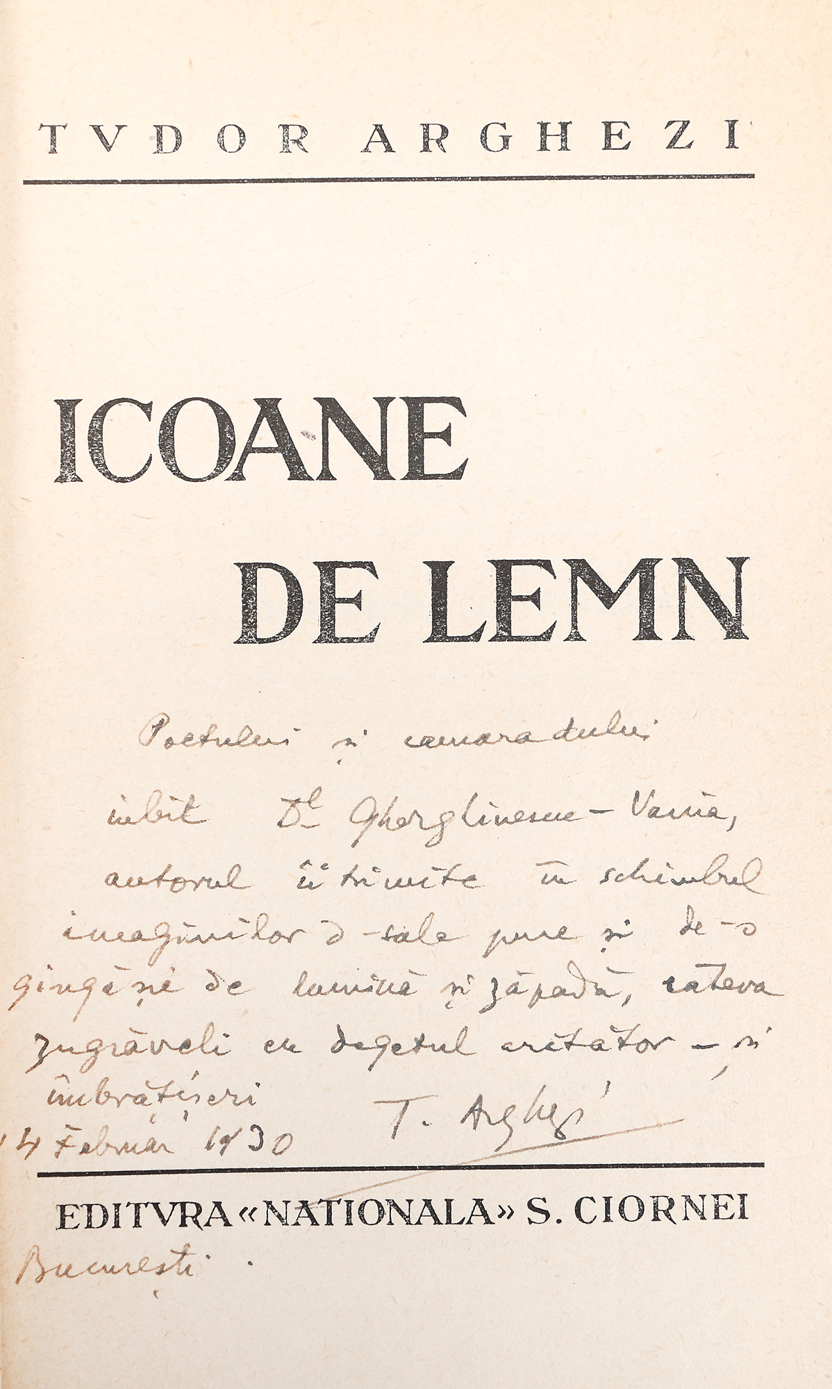 17. ”Icoane de lemn”, de Tudor Arghezi, ediție princeps, 1930, cu dedicația și semnătura olografă a autorului, provine din colecția scriitorului Vania Gherghinescu