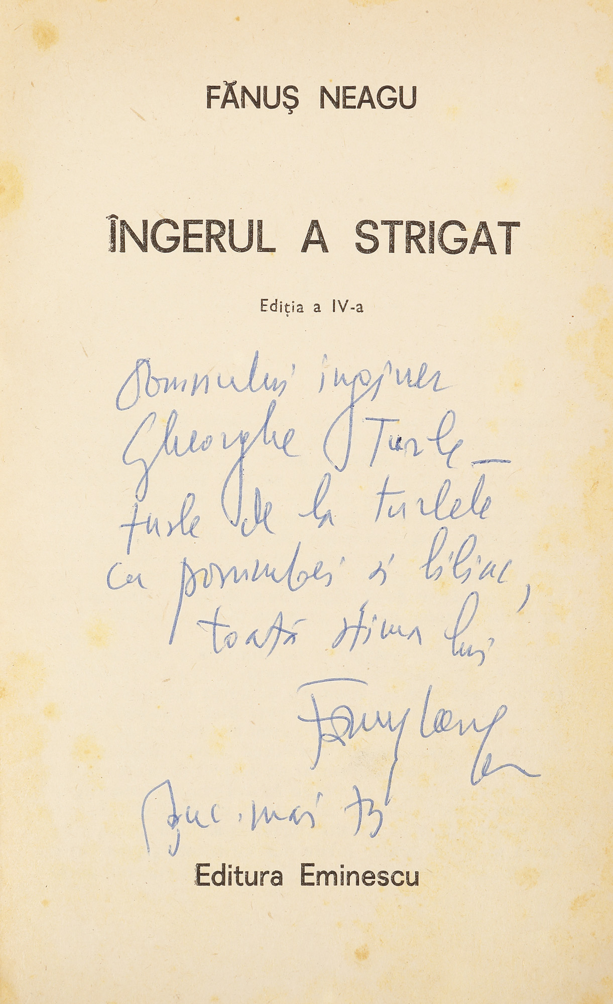 4. ”Îngerul a strigat”, Fănuș Neagu, București, 1973, cu dedicația și semnătura olografă a autorului