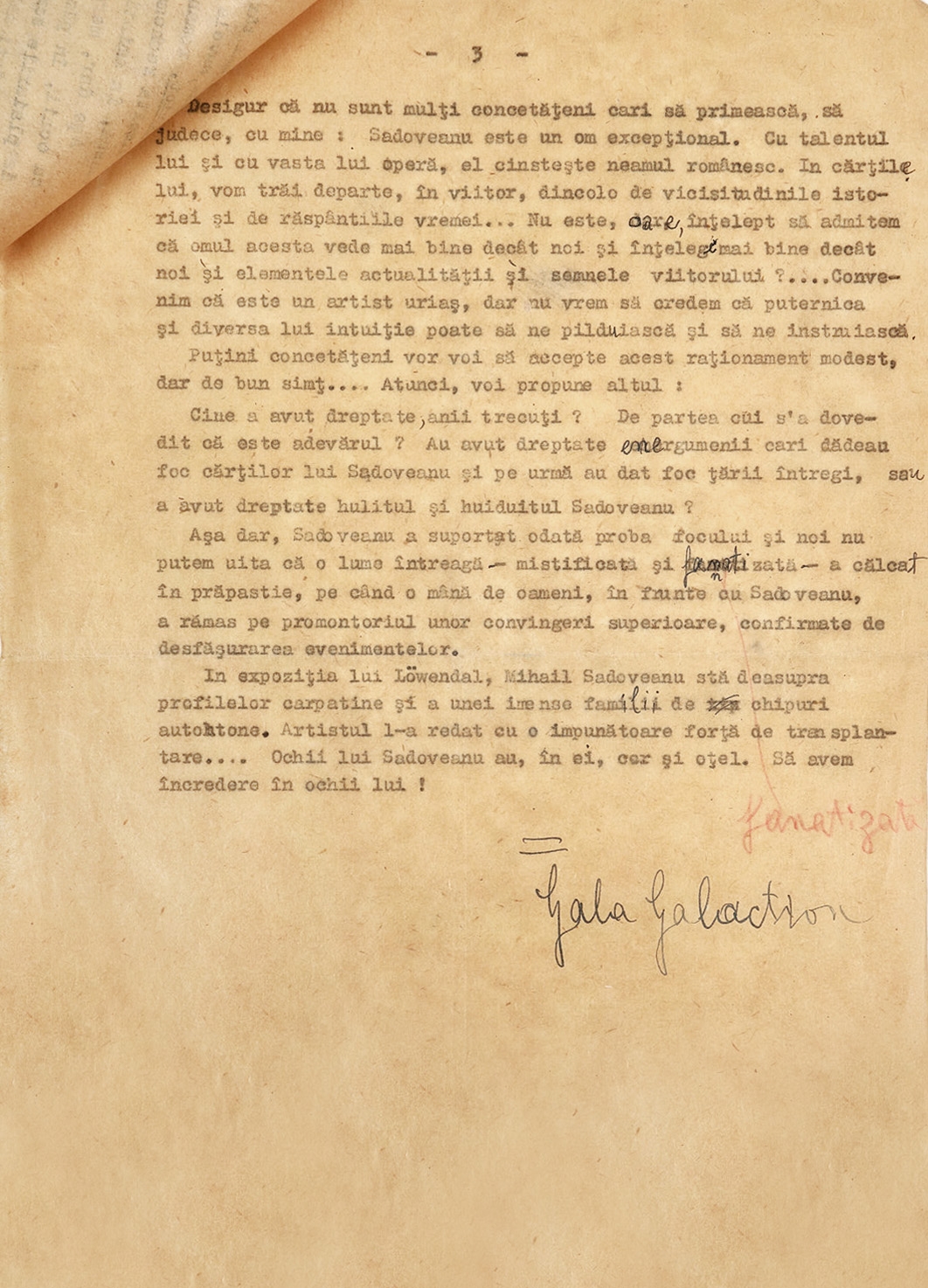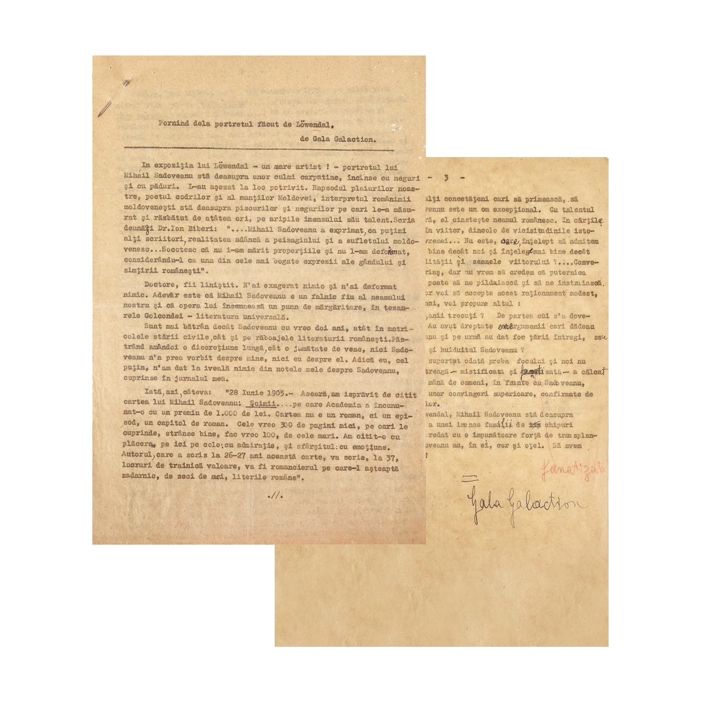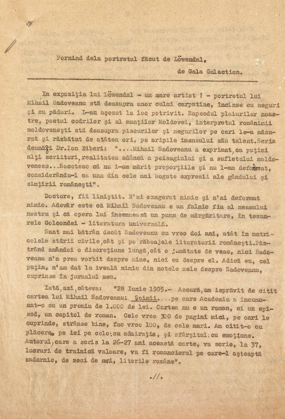 40. Manuscris dactilografiat ”Pornind de la portretul făcut de Löwendal”, de Gala Galaction, despre portretul lui Mihail Sadoveanu, cu adnotări și semnătura olografă a autorului , cca. 1910, provine din colecția istorică Șerban Țuculescu-Maria Galaction (3 file)