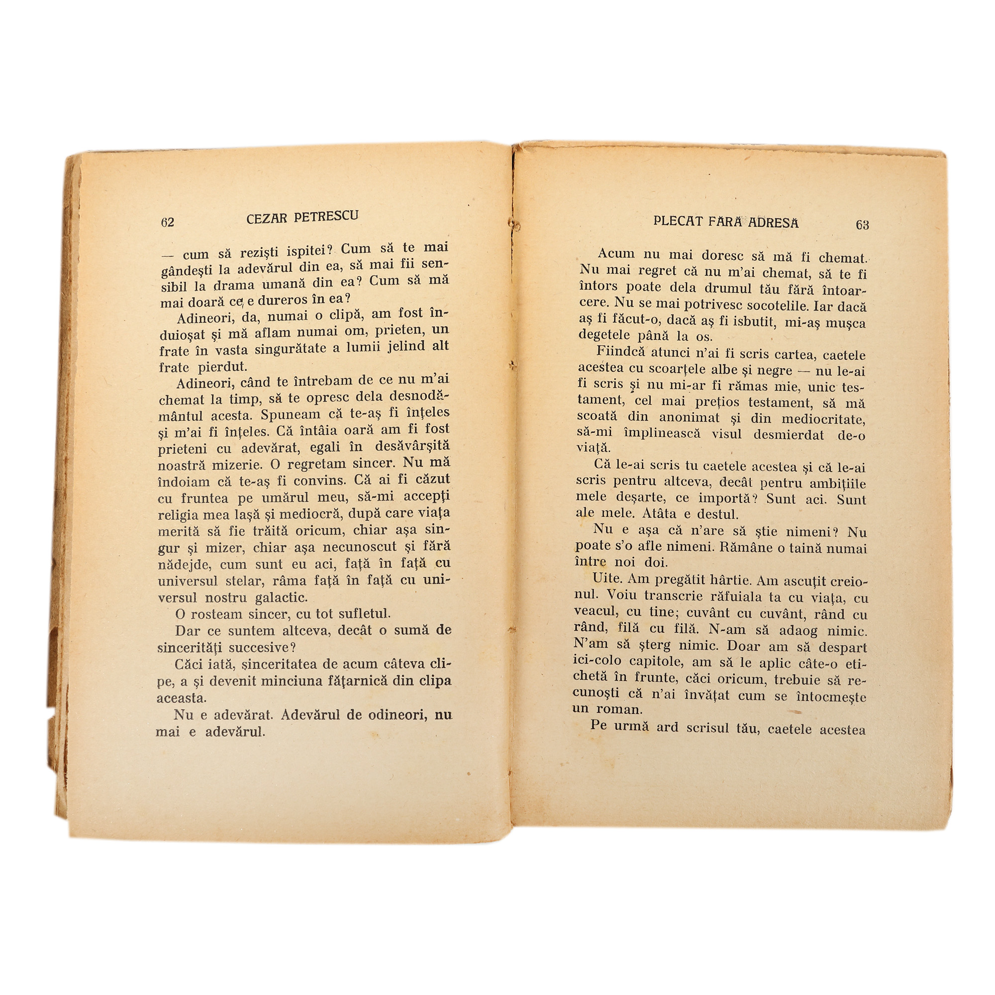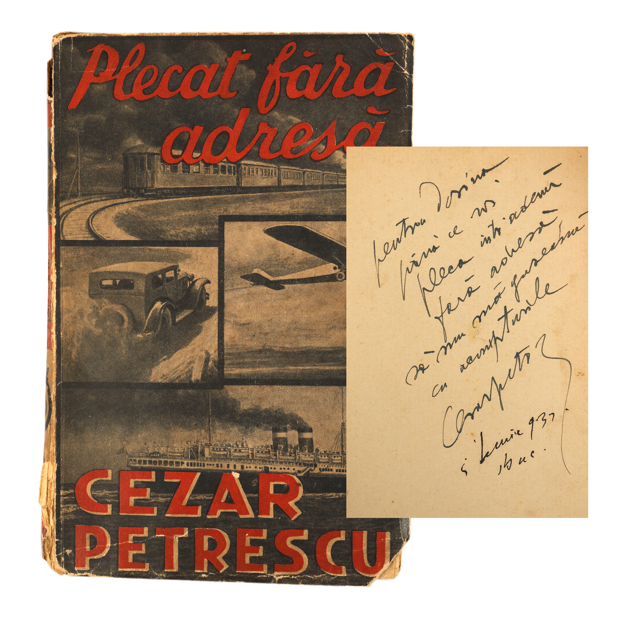 58. ”Plecat fără adresă”, de Cezar Petrescu, ediție princeps, București, 1932, cu dedicația și semnătura olografă a autorului