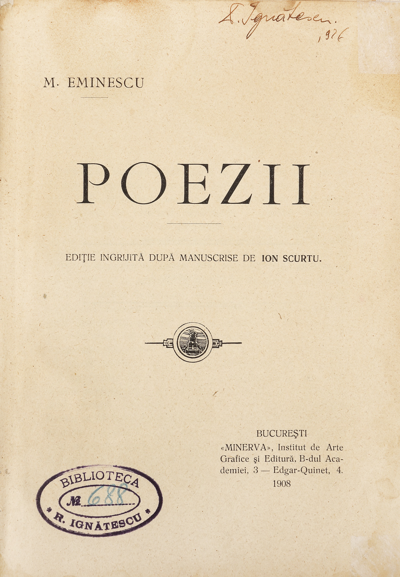 54. ”Poezii”, de Mihai Eminescu, ediție îngrijită de Ion Scurtu, București, 1908