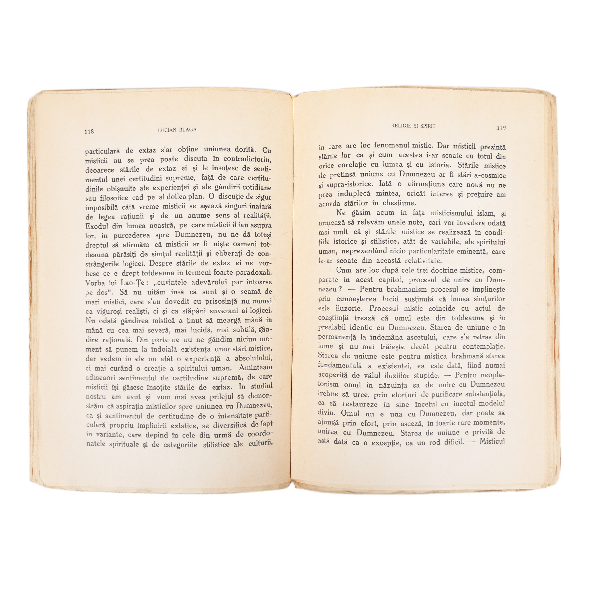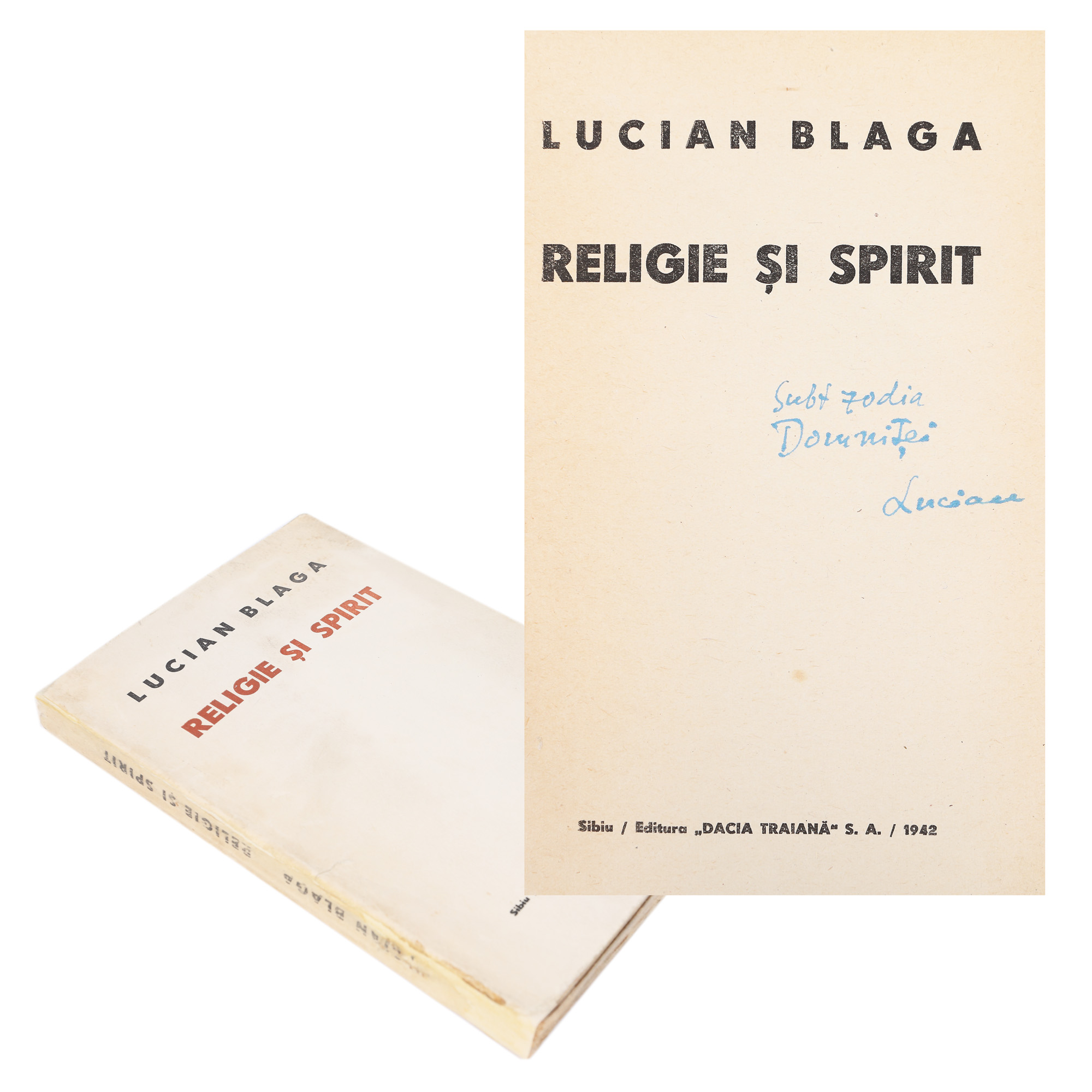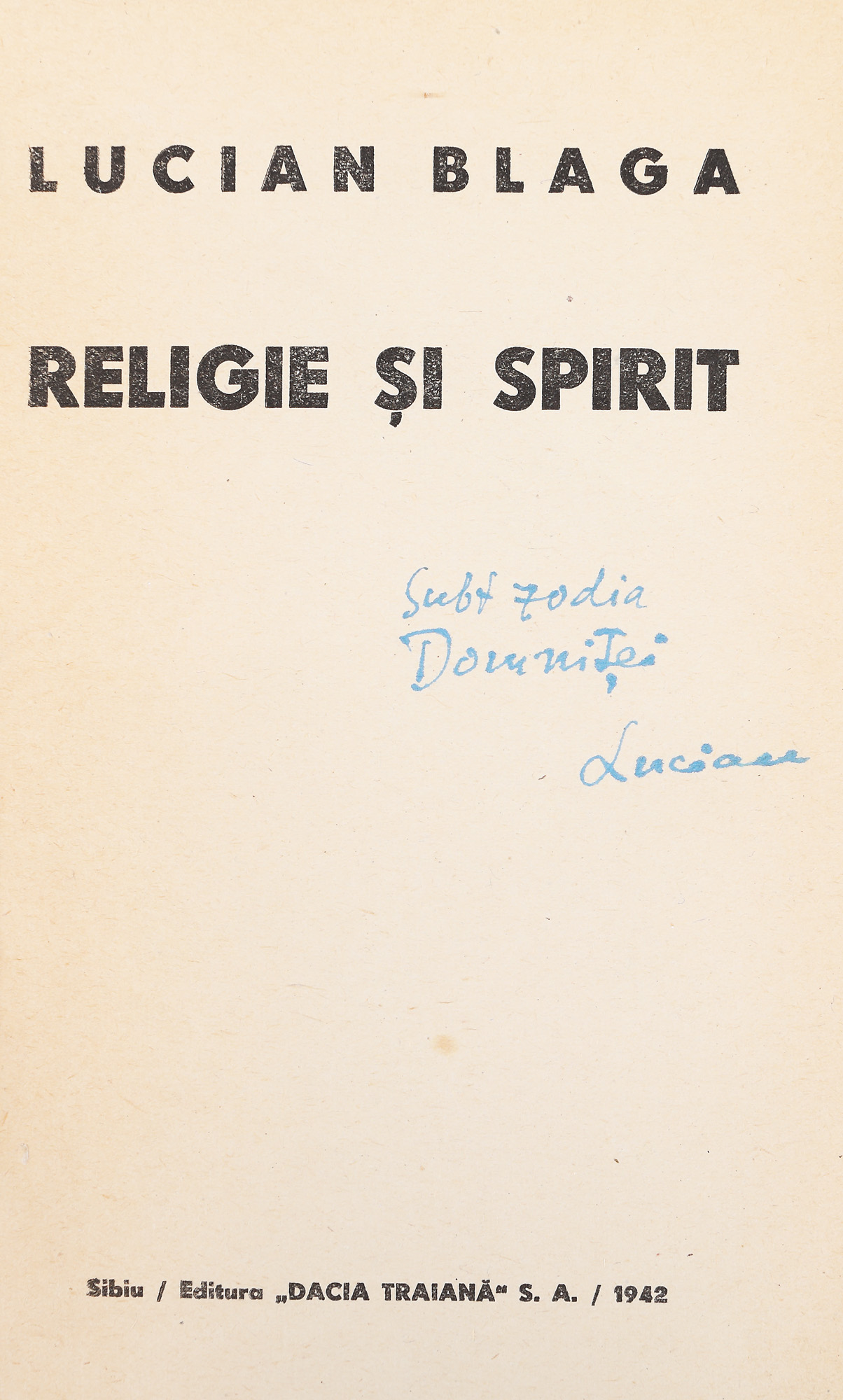 51. ”Religie și spirit”, de Lucian Blaga, ediție princeps, Sibiu, 1942, cu dedicația și semnătura olografă a autorului, provine din colecția scriitorului Vania Gherghinescu