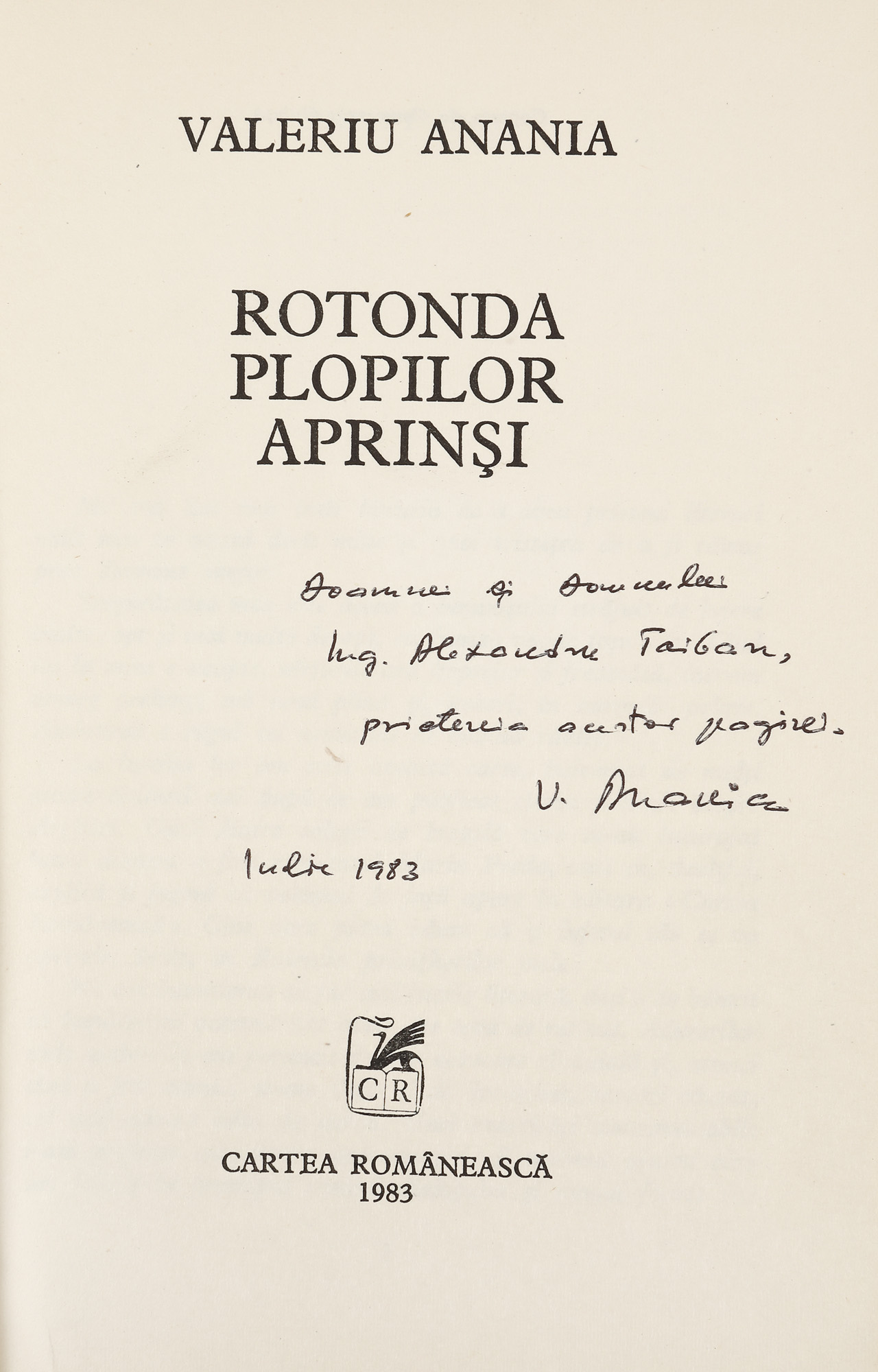 31. ”Rotonda plopilor aprinși”, de Valeriu Anania, București, 1983, cu dedicația și semnătura olografă a autorului