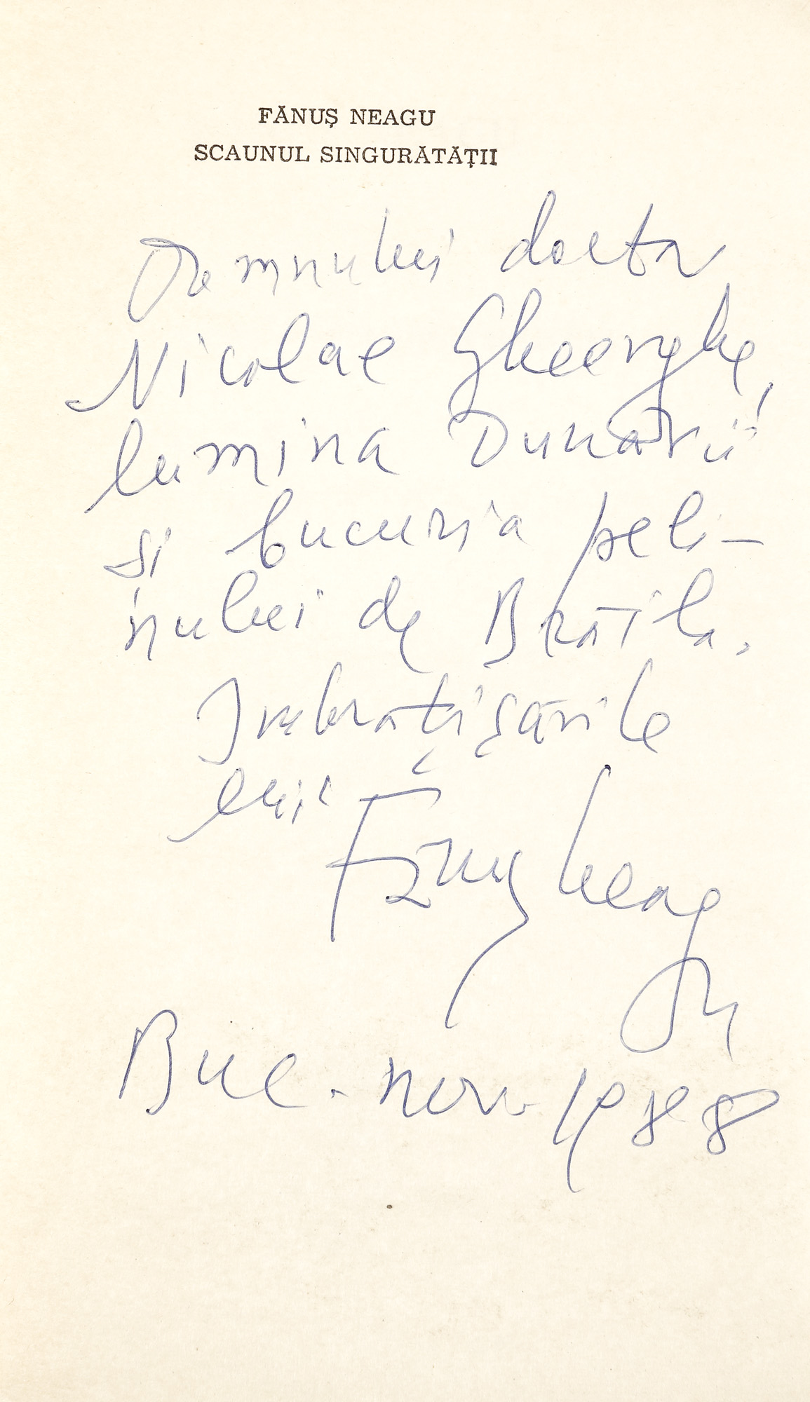 35. ”Scaunul singurătății”, de Fănuș Neagu, București, 1987, cu dedicația și semnătura olografă a autorului