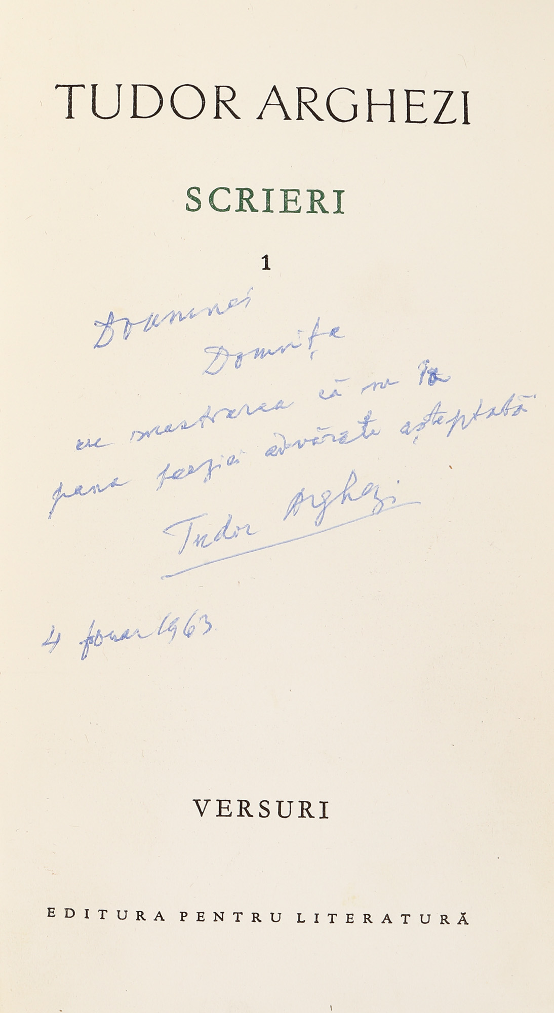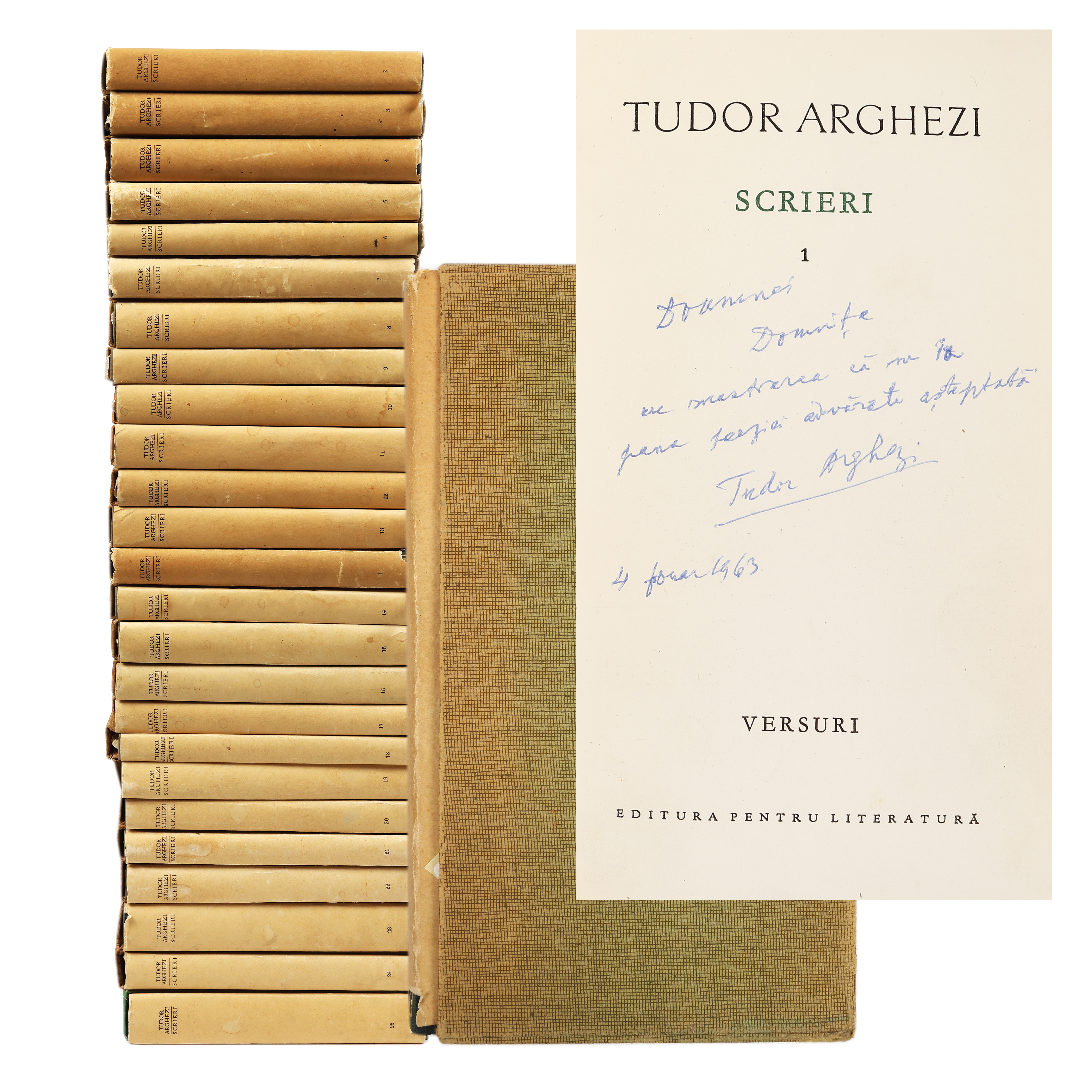 49. ”Scrieri”, de Tudor Arghezi, douăzeci și cinci de volume, București, 1962-1974, dintre care primul volum cu dedicația și semnătura autorului, cu etui, provin din colecția scriitorului Vania Gherghinescu