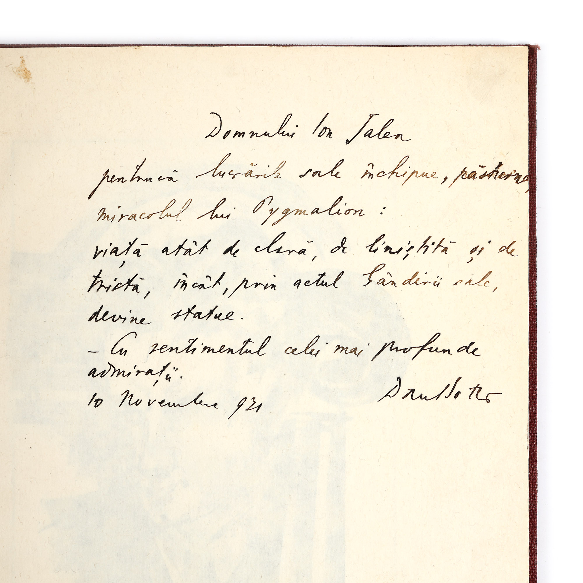 Poartă dedicația: „Domnului Ion Jalea pentrucă lucrările sale închipuie, păs[...] miracolul lui Pygmalion: viață atât de clară, de liniștită și de tristă, încât, prin actul Gândirii sale, devine statue. — Cu sentimentul celei mai profunde admirații.10 Novembre 93”. Exemplar numerotat 46 din 100, tipărit pe hârtie japon.
