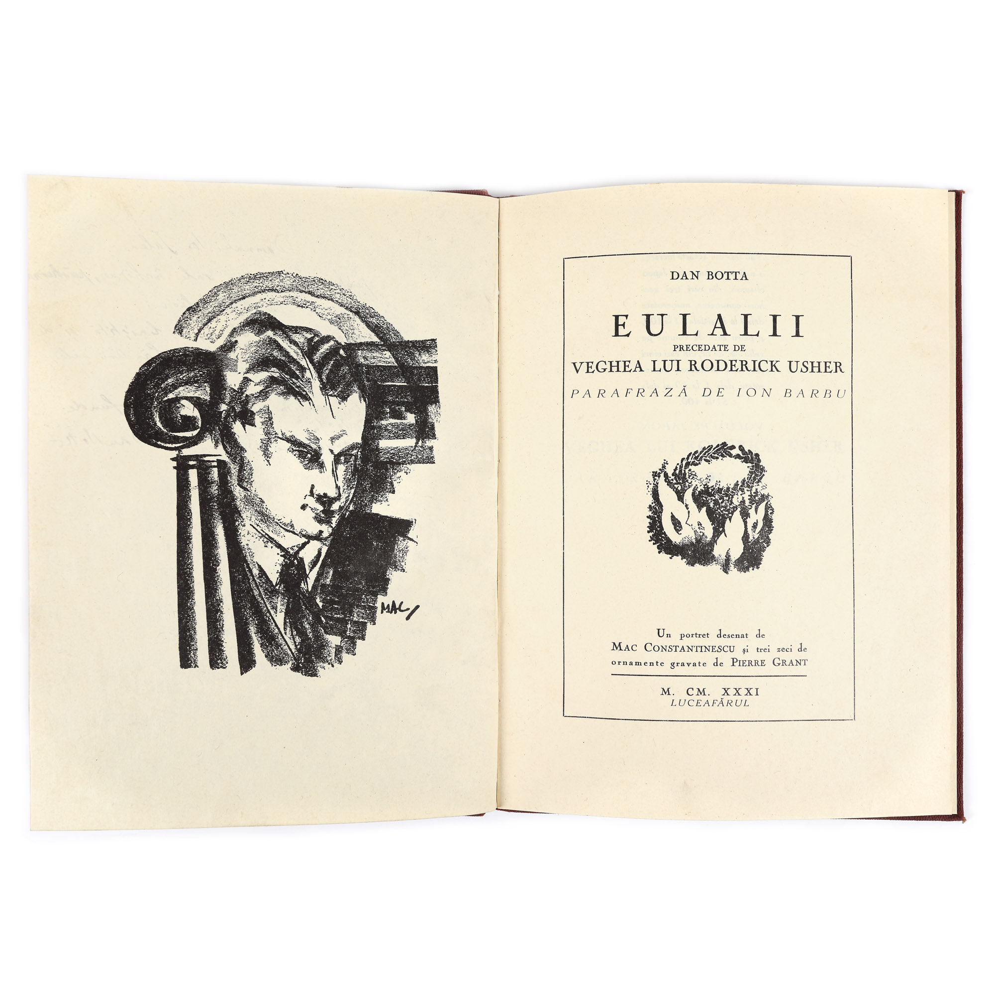 19. ”Eulalii, precedate de Veghea lui Roderick Usher”, de Dan Botta, cu o parafrază de Ion Barbu, București, 1931, cu un portret desenat de Mac Constantinescu și 30 de ornamente gravate de Petru Grant, cu dedicaţia și semnătura olografă a autorului către sculptorul Ion Jalea