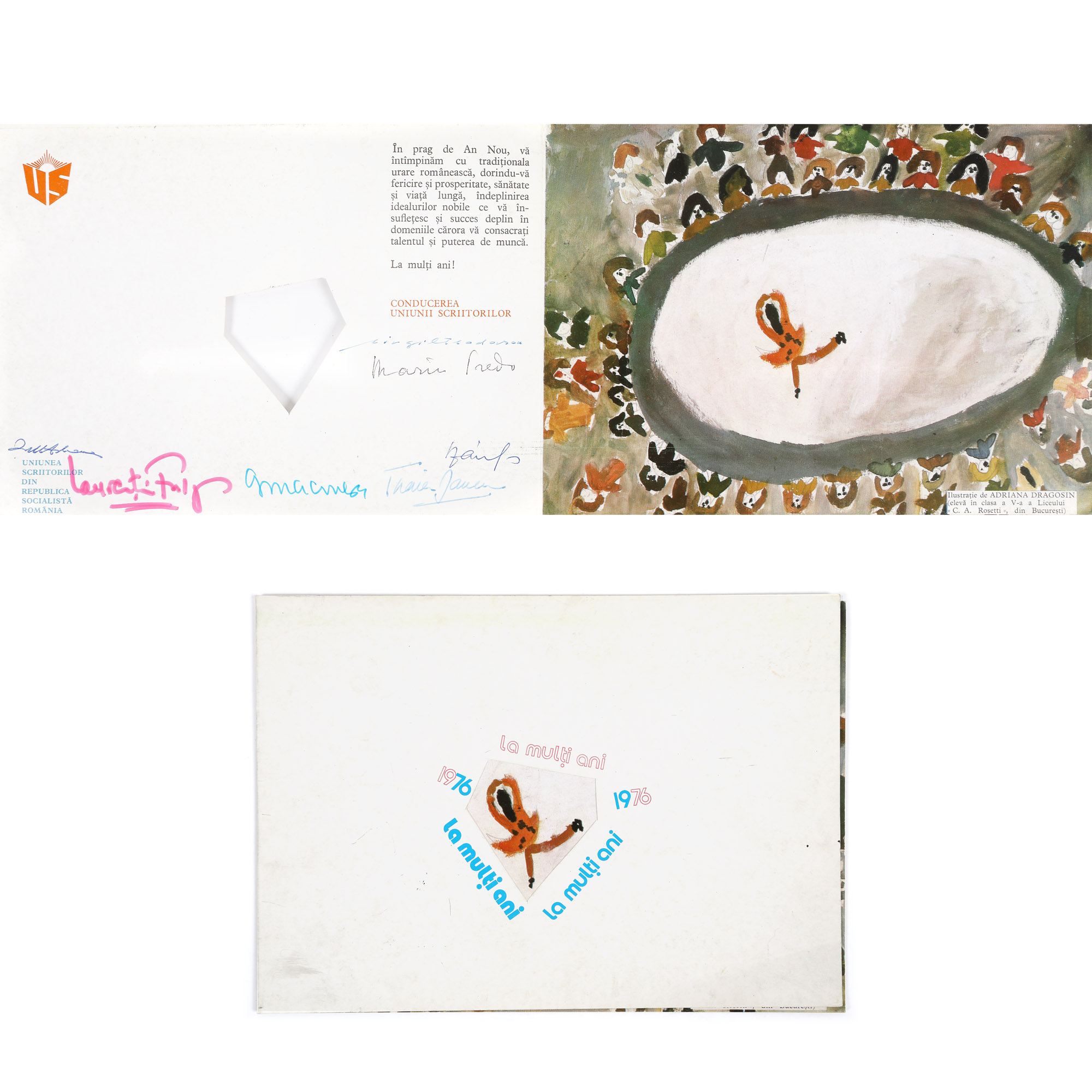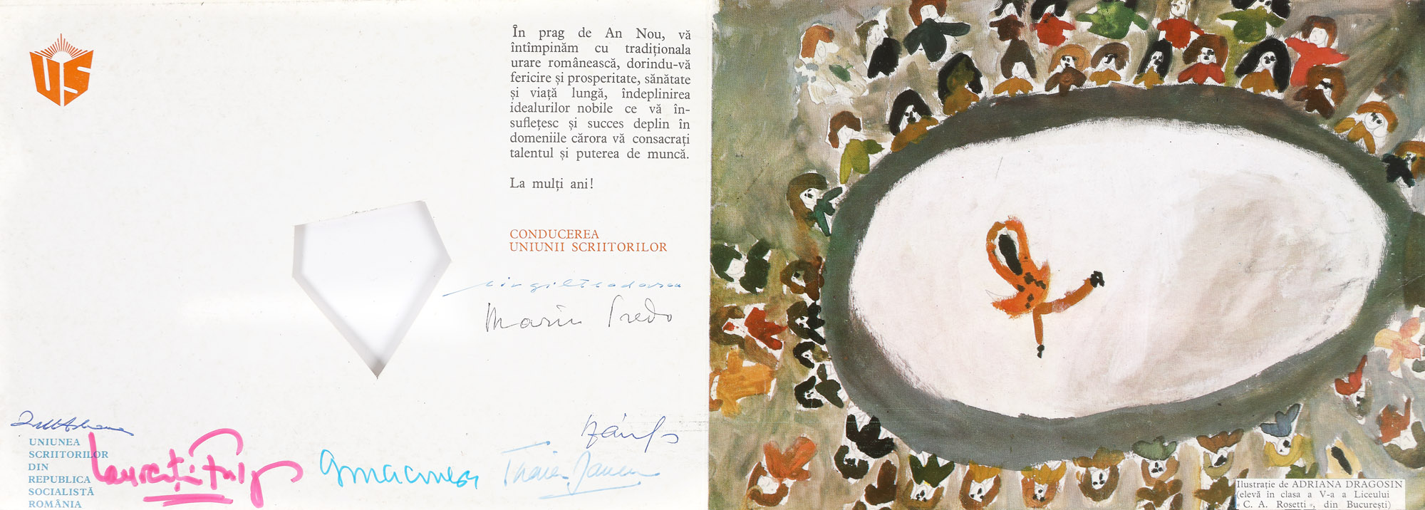 38. Felicitare cu ocazia Anului Nou, trimisă de Uniunea Scriitorilor către Sașa Pană, 1979, cu semnăturile olografe ale lui Marin Preda, Virgil Teodorescu, George Macovescu, Laurențiu Fulga, Henri Zalis și Traian Iancu