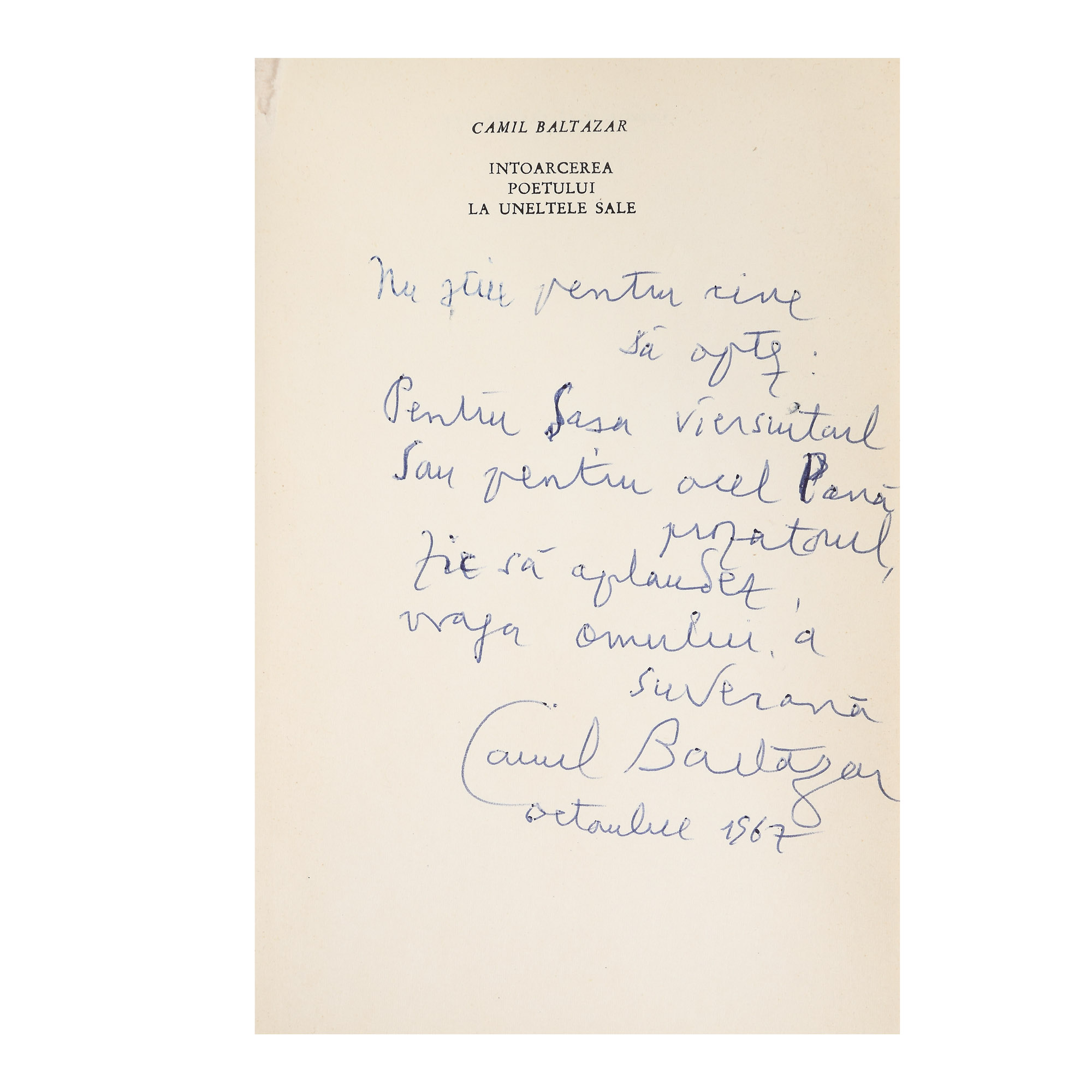 Poartă dedicația: „Nu știu pentru cine să optez: Pentru Sașa viersuitorl Sau pentru acel Pană prozatorul zic să aplaudez vraja omului, a suverană Camil Baltazar octombrie 1967”.