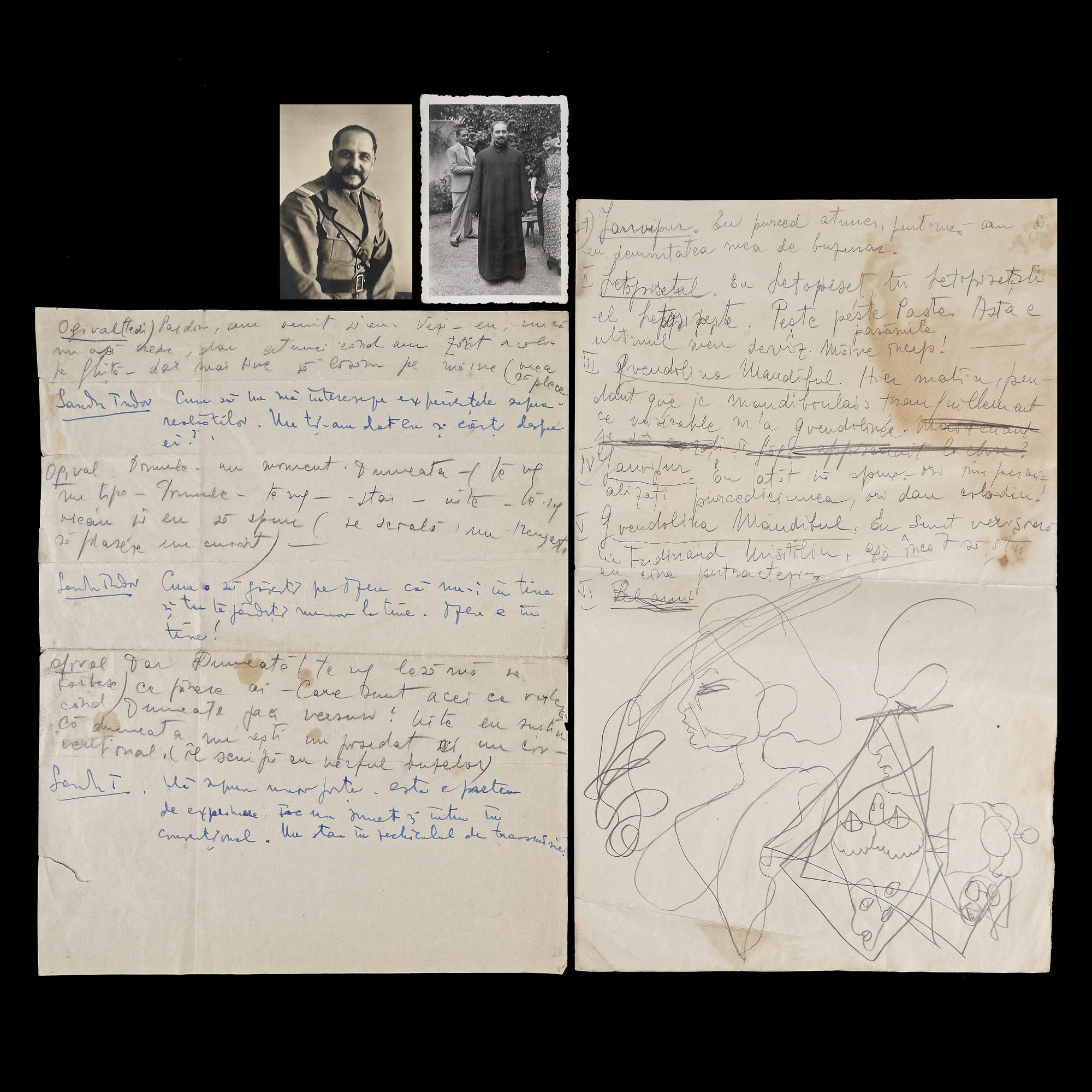 37. Lot format din două jocuri ”Cadavre exquis” între Hedda Sterne, Theodore Brauner, Medi Dinu și Sandu Tudor, precum și două fotografii ilustrându-l pe Sandu Tudor, cca. 1925, provine din colecția familiei Stephan Roll și Medi Dinu