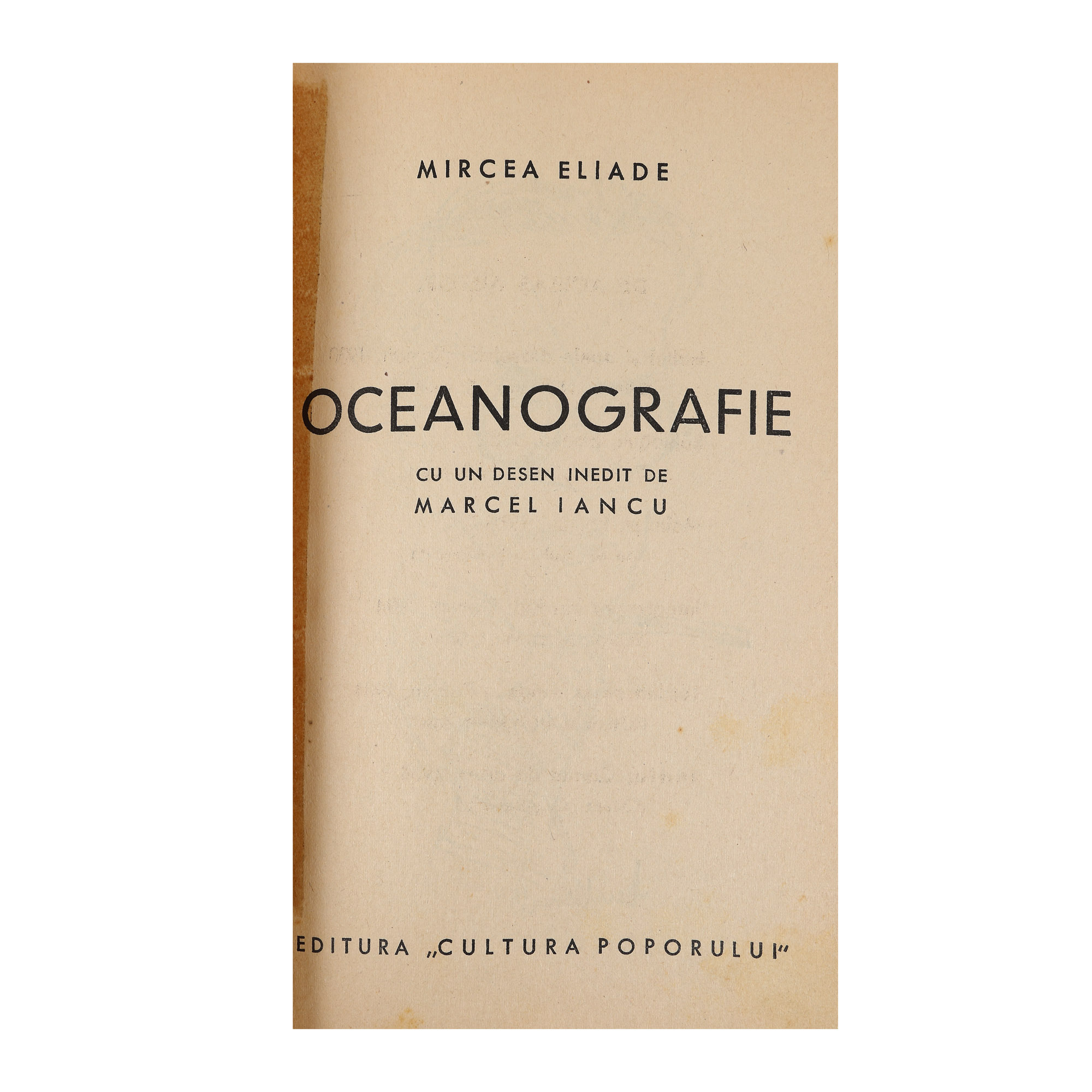 5. ”Oceanografie”, de Mircea Eliade, ediție princeps, București, 1934, cu un desen inedit de Marcel Iancu și dedicația olografă a autorului
