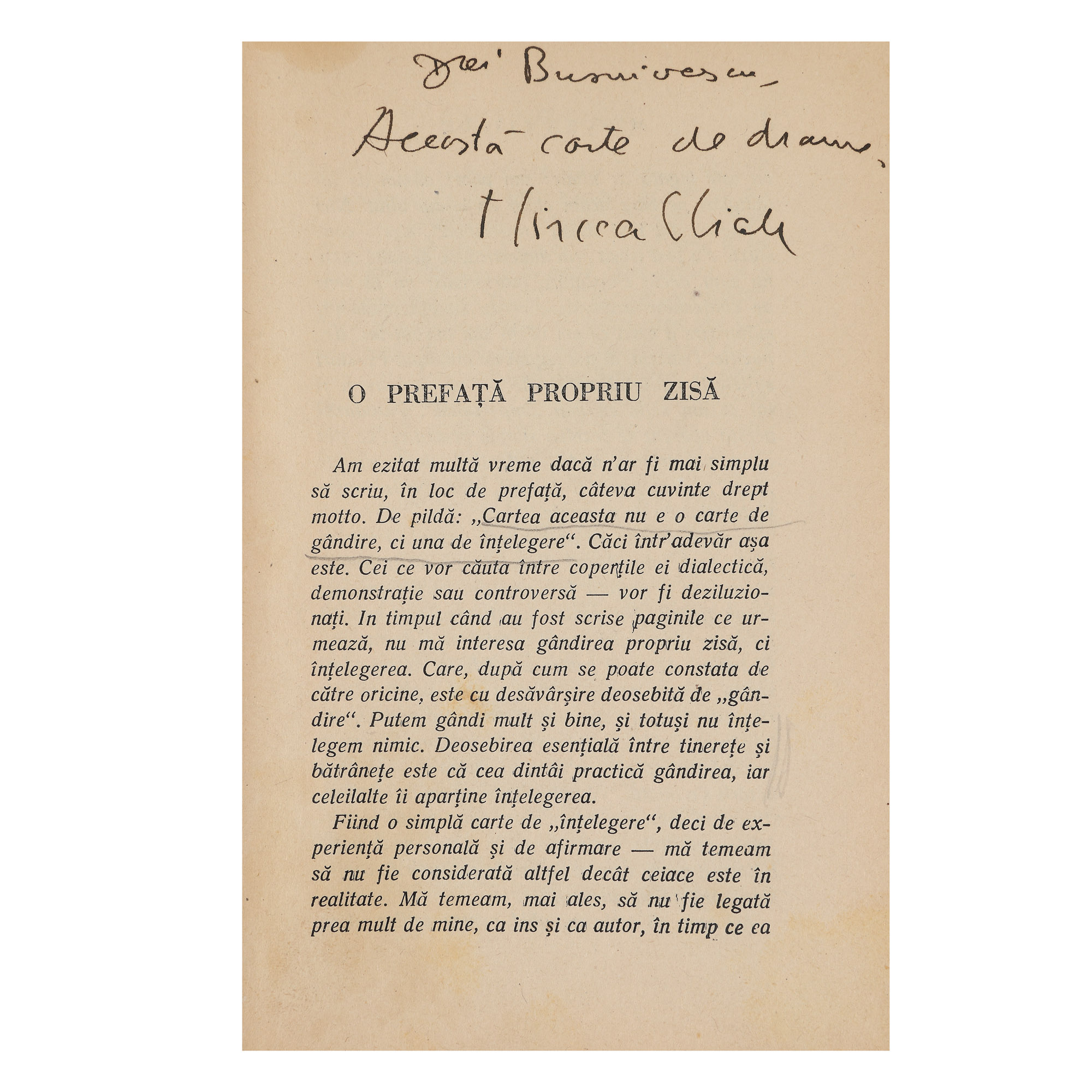 Poartă dedicația: ”Dnei Busuiocescu, Această carte de drame. Mircea Eliade”
