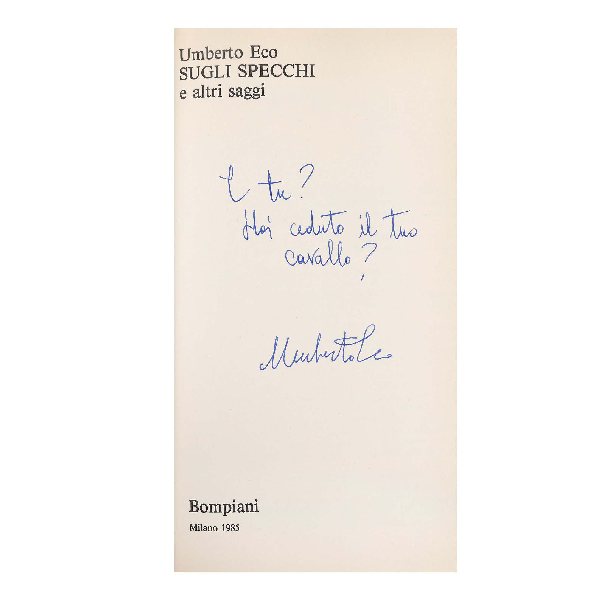 23. ”Pe oglinzi”, de Umberto Eco, ediție princeps, italiană, Milano, 1985, cu dedicația olografă a autorului