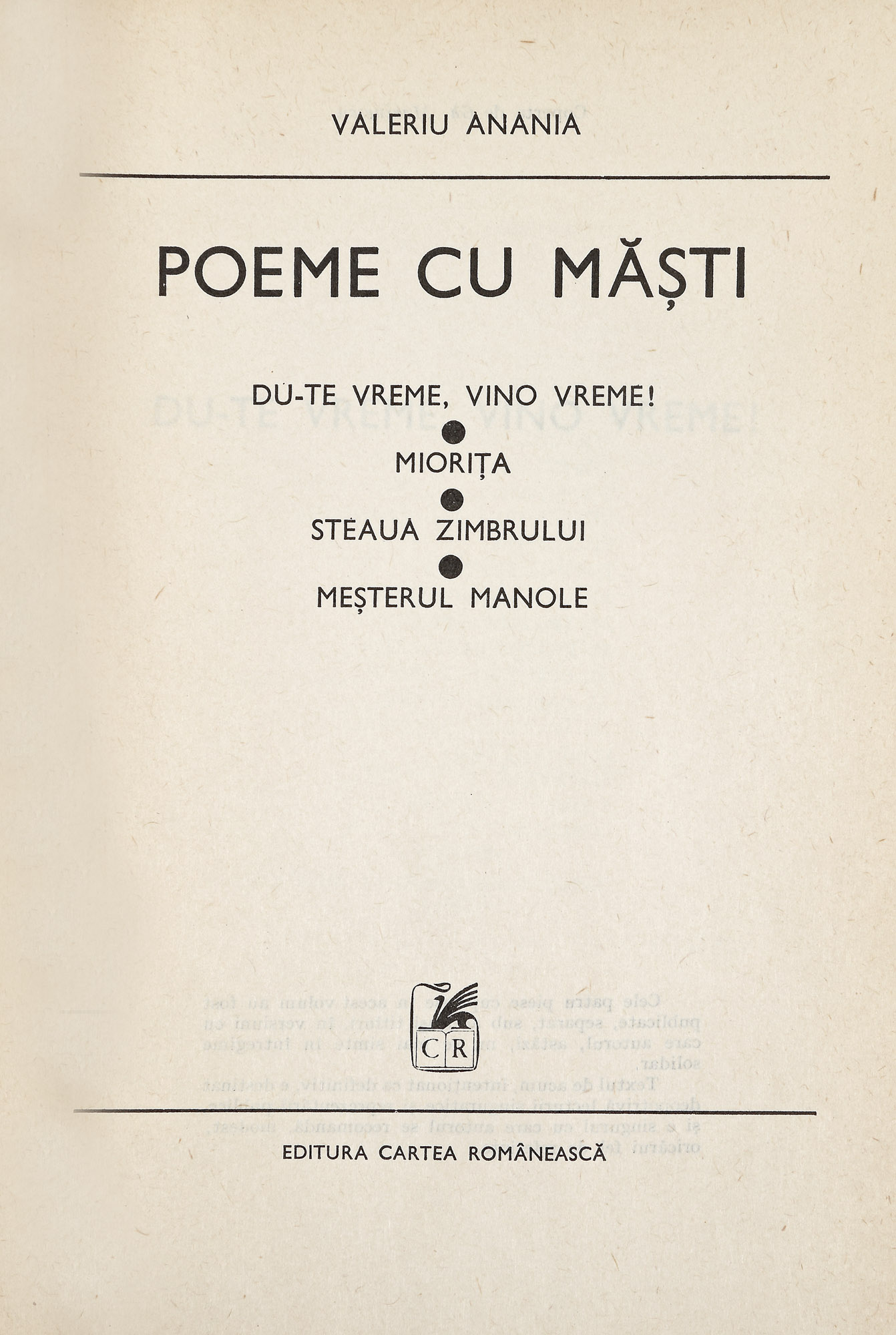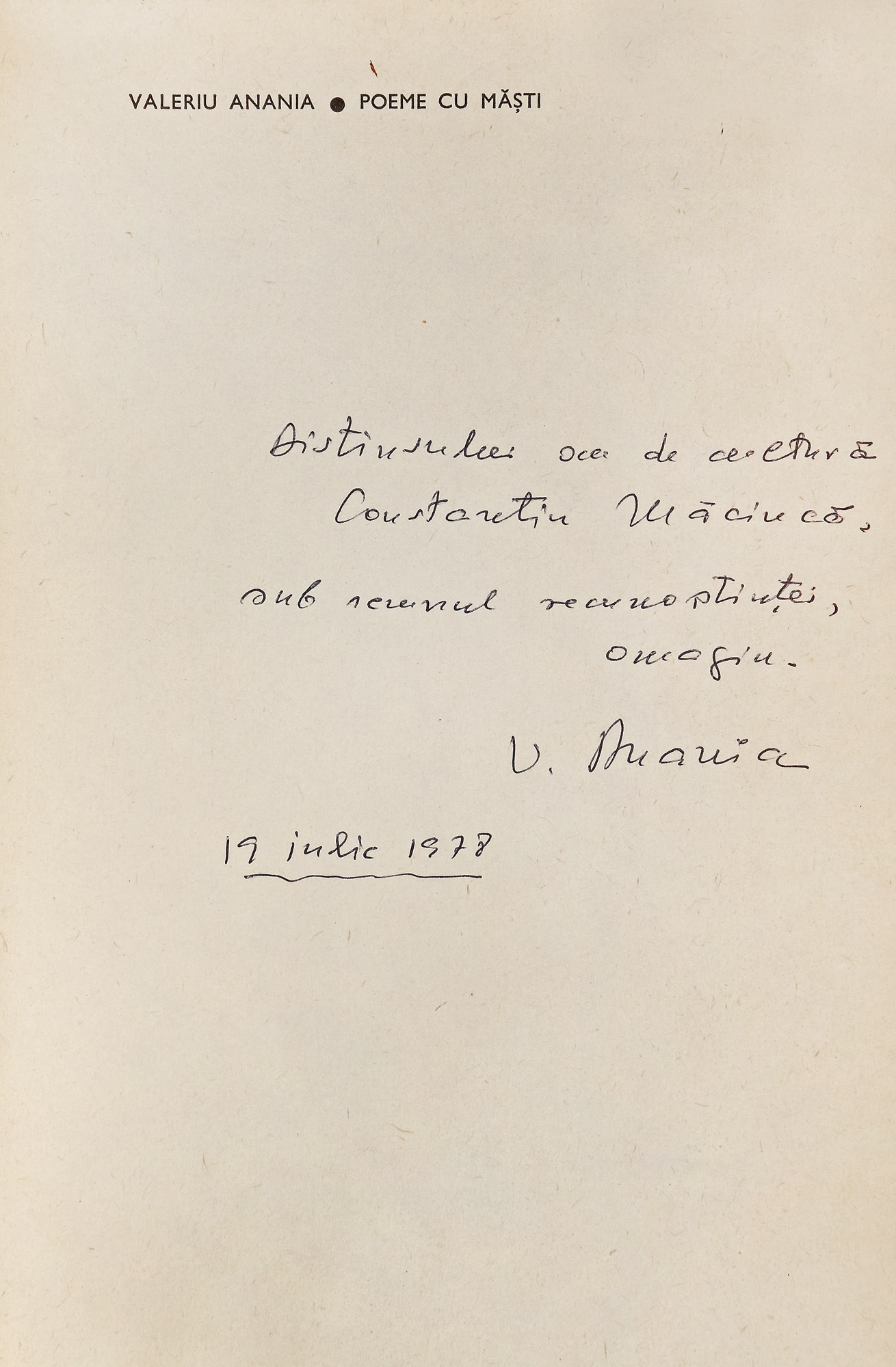 2. ”Poeme cu măști”, de Valeriu Anania (Arhiepiscop Bartolomeu Anania), București, 1972, cu dedicația autorului către istoricul Constantin Măciucă
