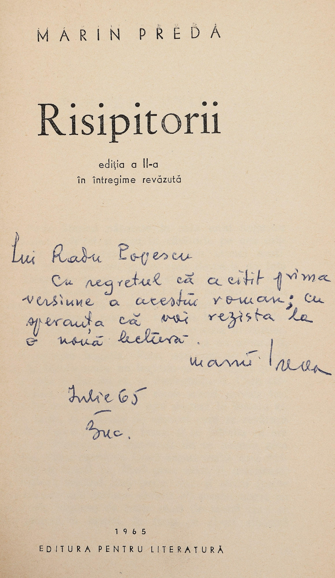 10. ”Risipitorii”, de Marin Preda, București, 1965, cu dedicația și semnătura olografă a autorului
