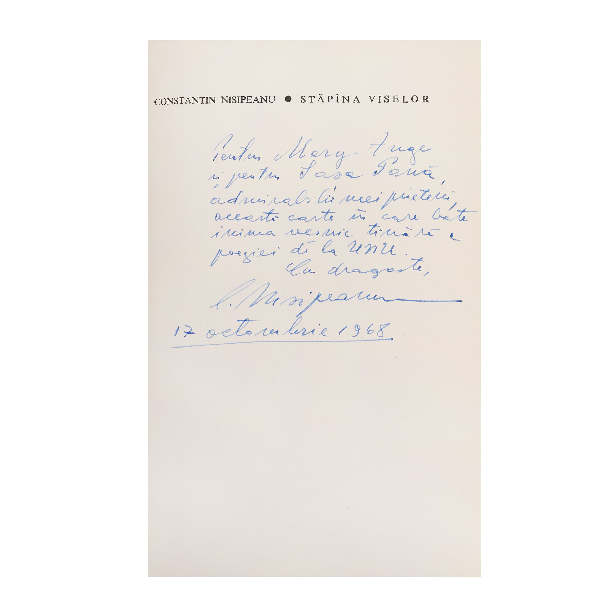 26. ”Stăpîna viselor”, de Constantin Nisipeanu, București, 1968, cu dedicația autorului către ”... inima veșnic tînără a poeziei de la UNU...” Sașa Pană și soția sa