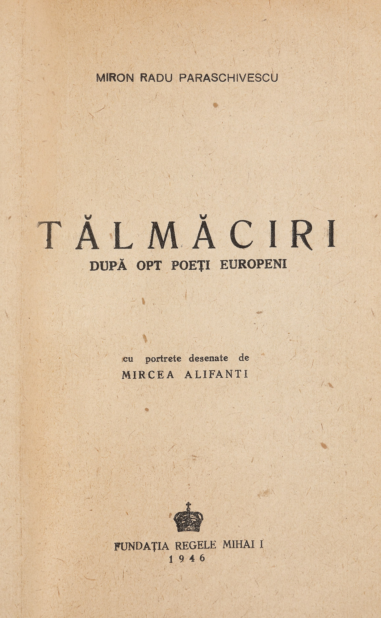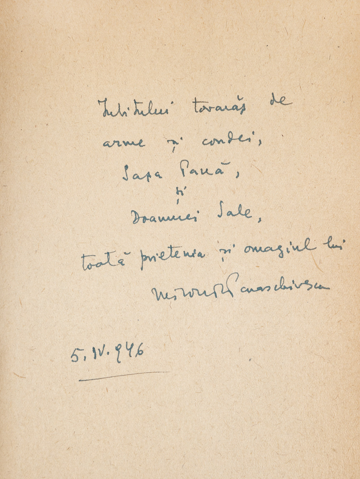32. ”Tălmăciri după opt poeți europeni”, de Miron Radu Paraschivescu, București, 1946, cu dedicația și semnătura olografă a autorului către Sașa Pană și soția sa
