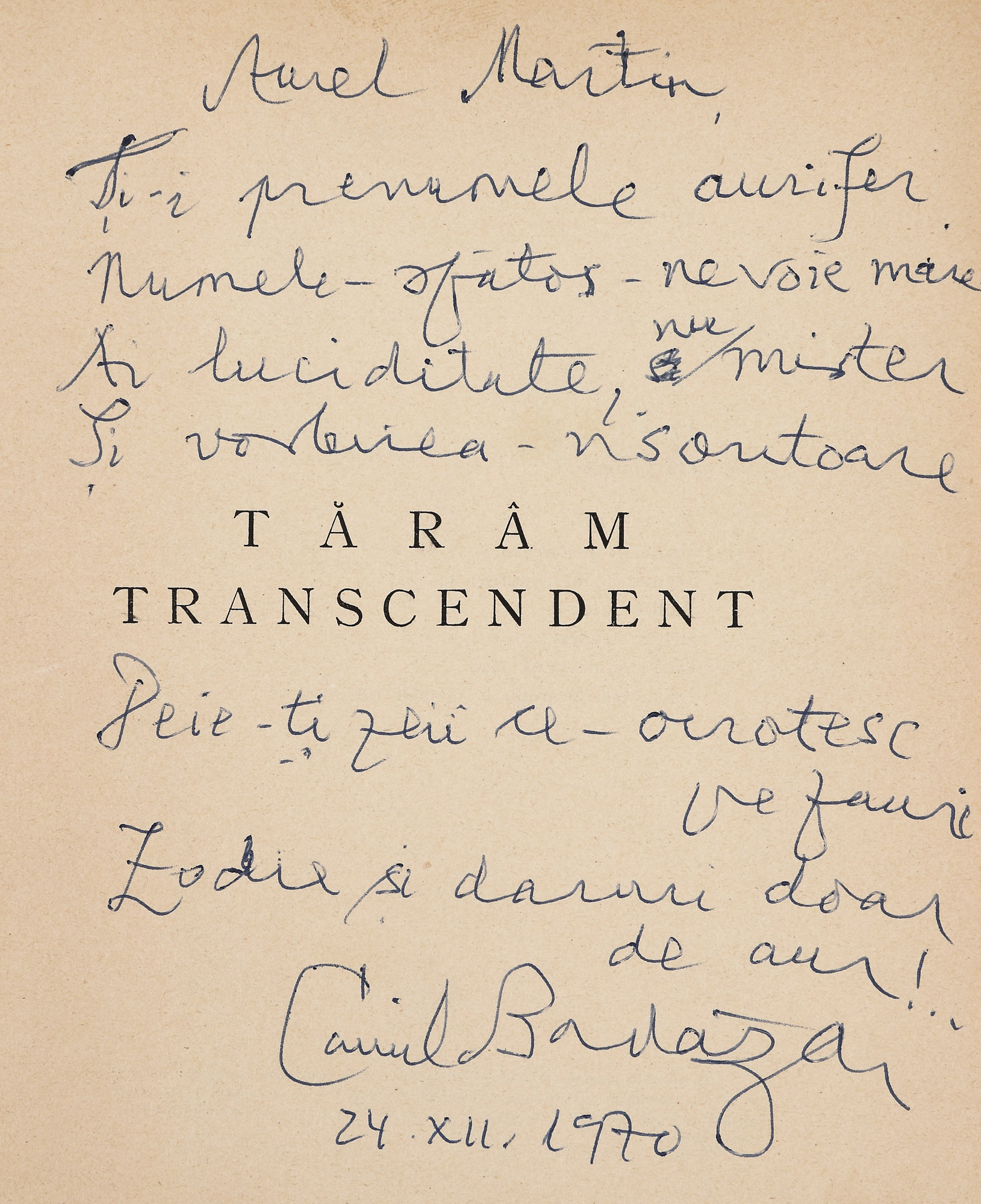Poartă epigrama: „ Aurel Martin, / Ți-i prenumele aurifer / Numele - spătos - nevoie mare / Ai luciditate, nu mister / Și vorbirea-nsoritoare / Deie-ții zei ce - ocrotesc pe fauri / Zodie și daruri doar de aur! / Camil Baldazar / 24.XII. 1970”