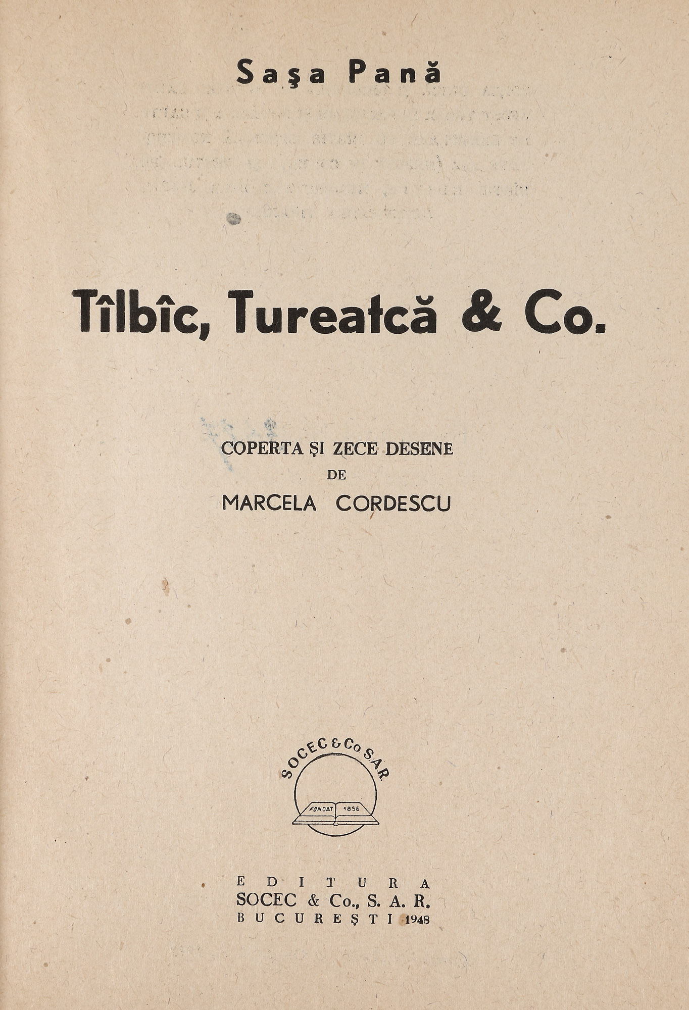 21. ”Tîlbîc, Tureatcă & Co”, de Sașa Pană, București, 1948, cu coperta și 10 desene de Marcela Cordescu, dedicația și semnătura olografă a autorului