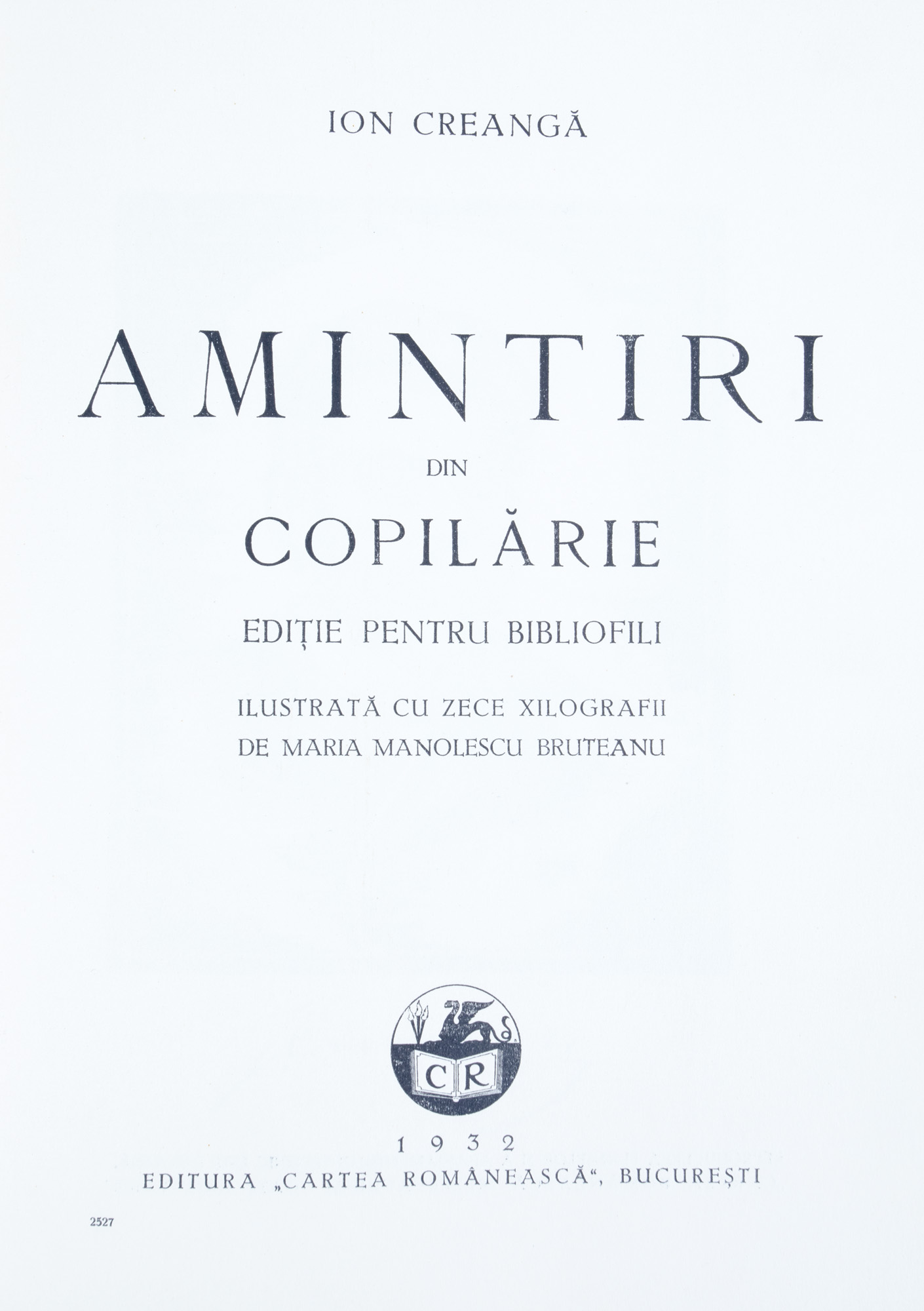 20. ”Amintiri din copilărie”; de Ion Creangă, București, 1932, ediție bibliofilă cu zece xilogravuri de Maria Manolescu Bruteanu