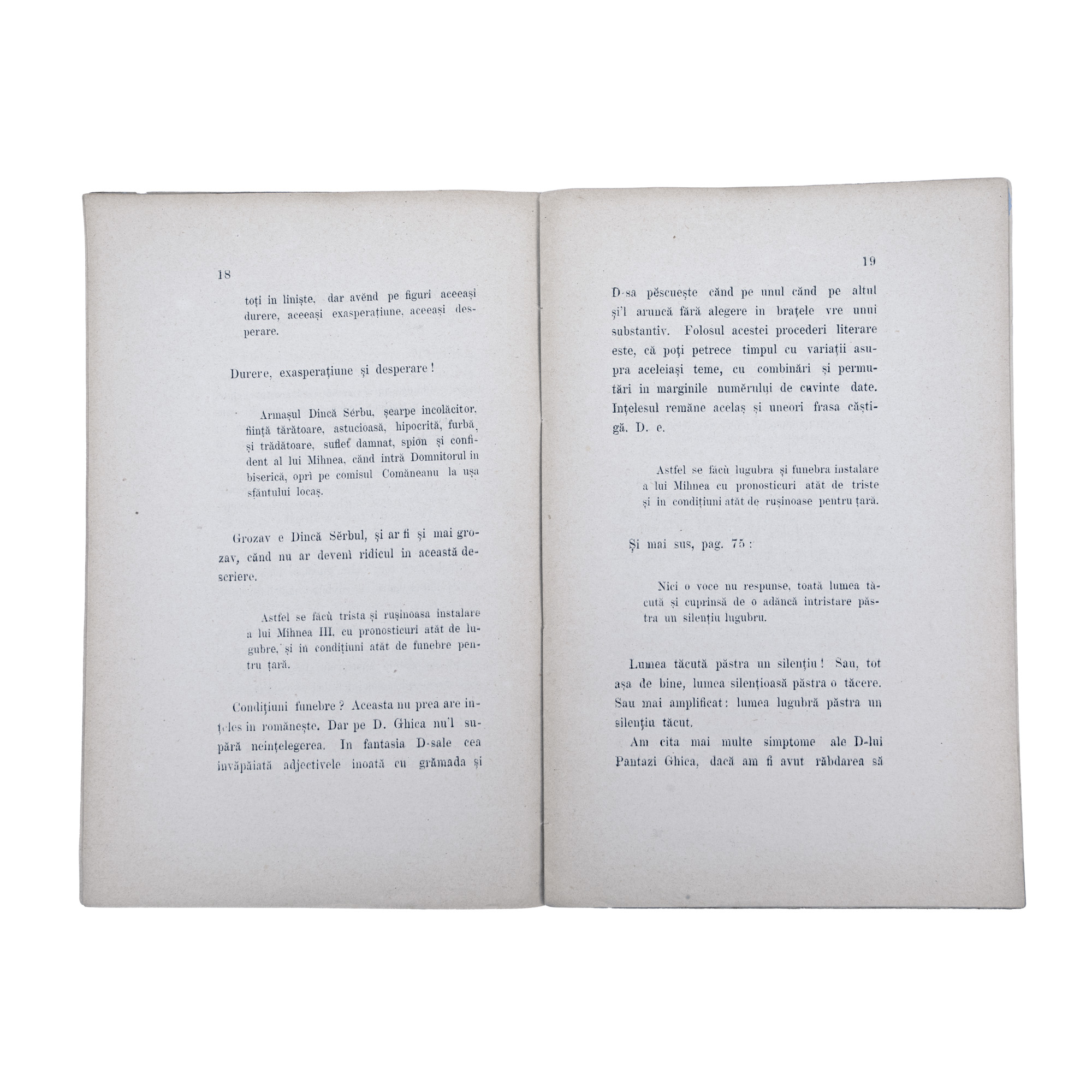 Acest celebru studiu critic conceput de Titu Maiorescu era publicat pentru prima dată în revista Societății Junimea, "Convorbiri Literare". Succesul de critică și de public al acestui text l-a determinat pe autor să îl republice într-o broșură de sine stătătoare din care face parte exemplarul de față. Coperțile sunt cele originale.