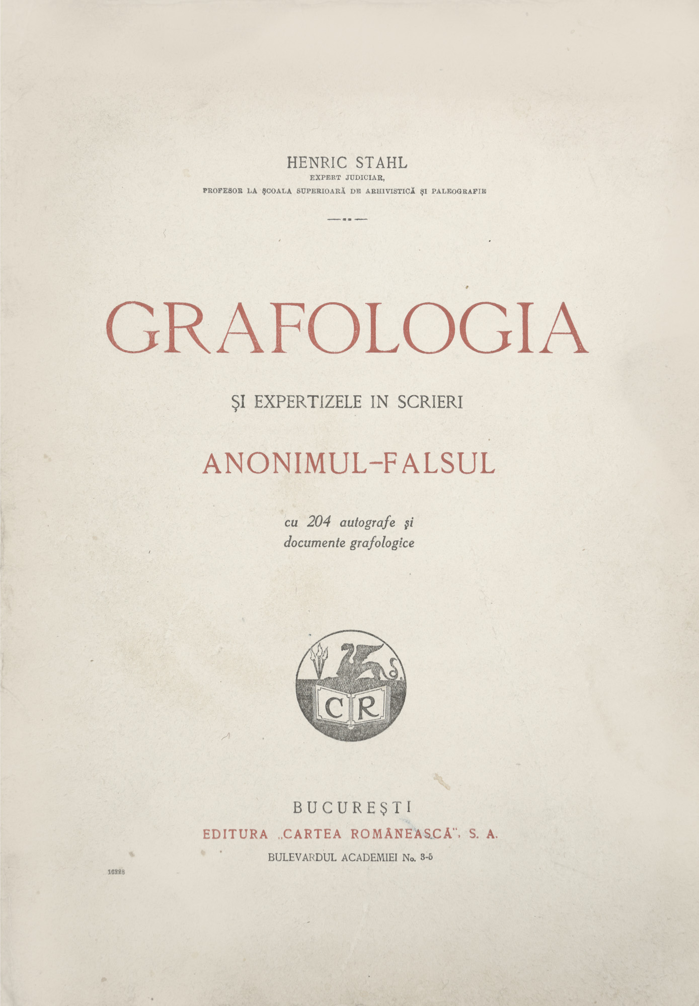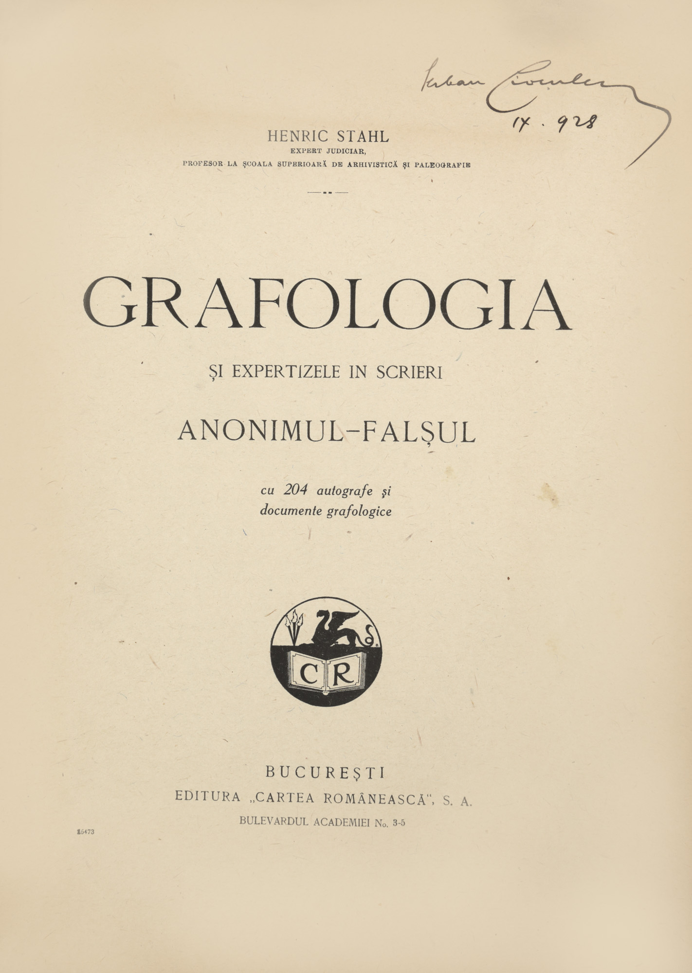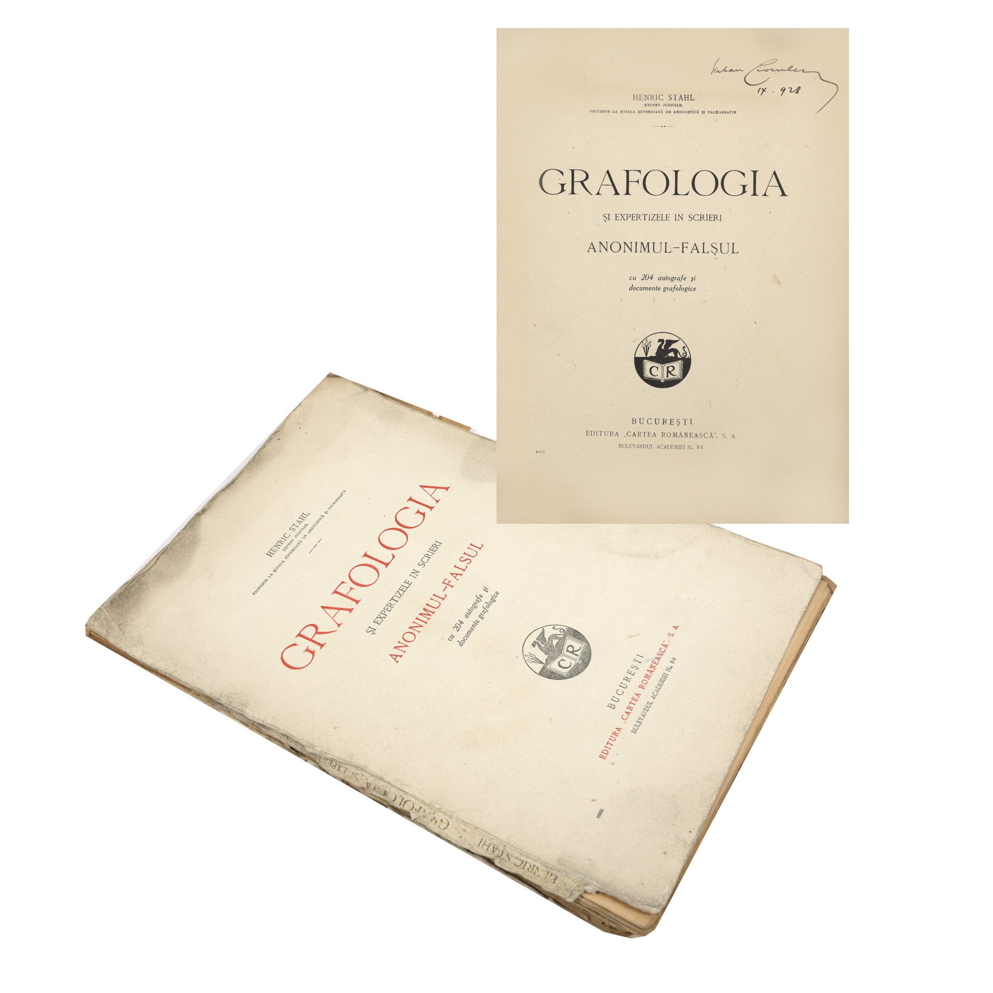 61. "Grafologia și expertizele în scrieri", de Henric Stahl, București, 1931, cu ex-libris, provine din colecția criticului literar Șerban Cioculescu