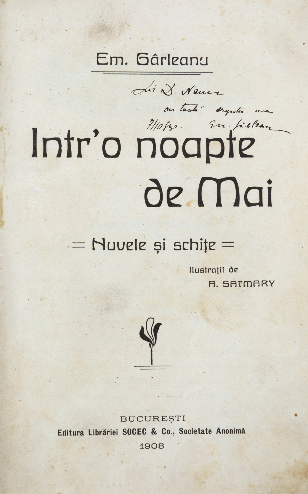 16. ”Într-o noapte de mai”, de Emil Gârleanu, ediție princeps, București, 1908, cu dedicația și semnătura olografă a autorului