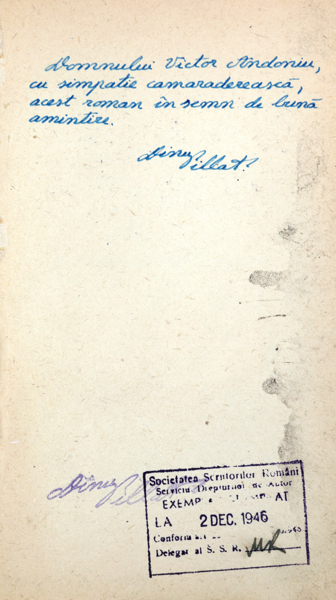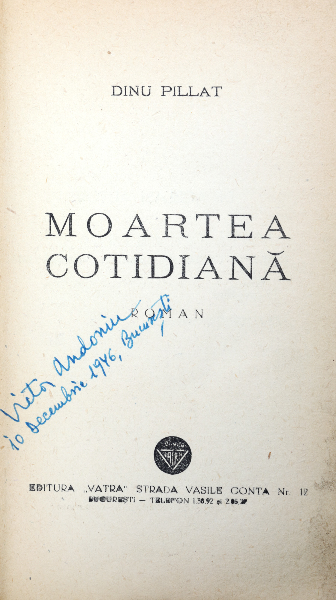 23. "Moartea cotidiană", de Dinu Pillat, București, 1946, cu semnătura olografă și dedicația autorului