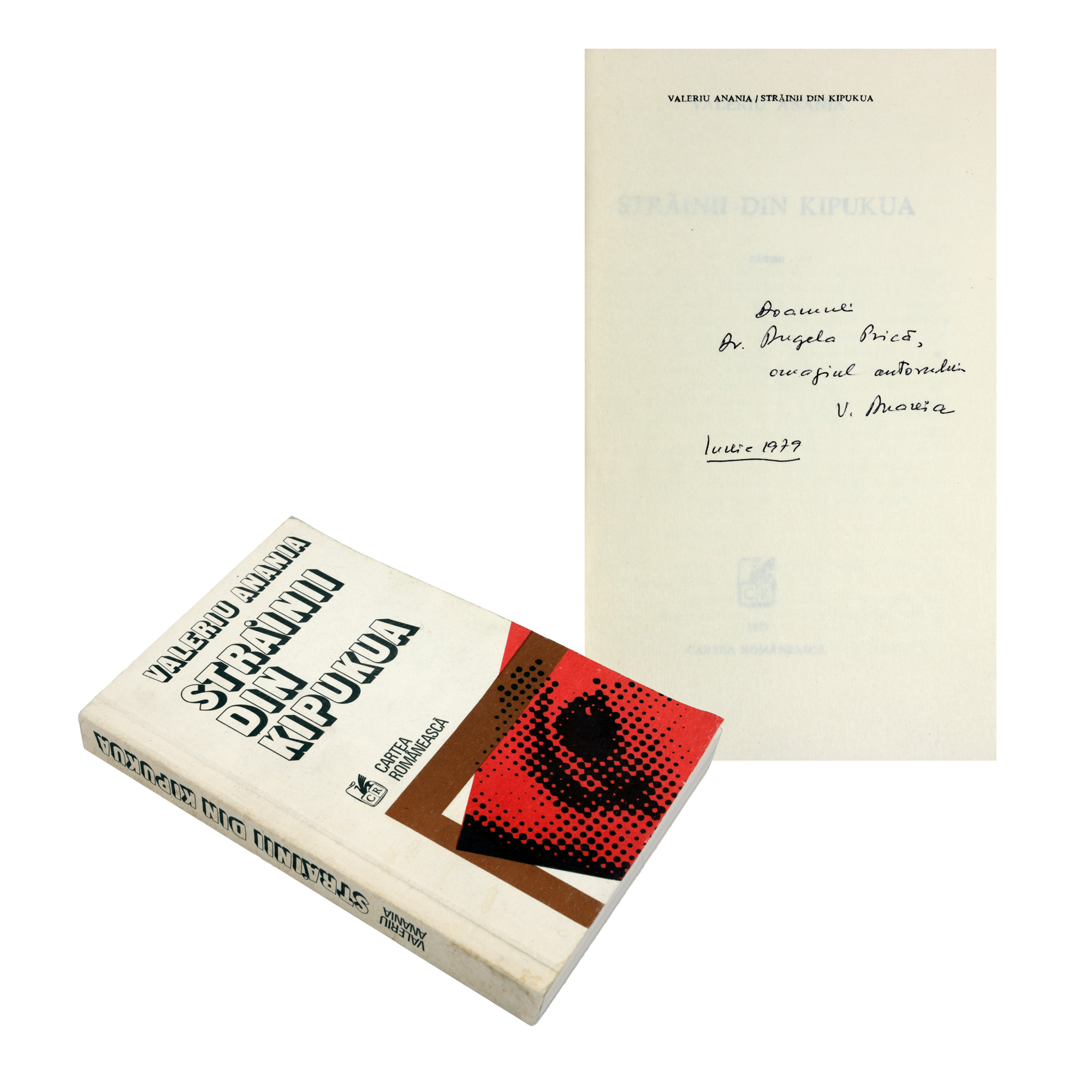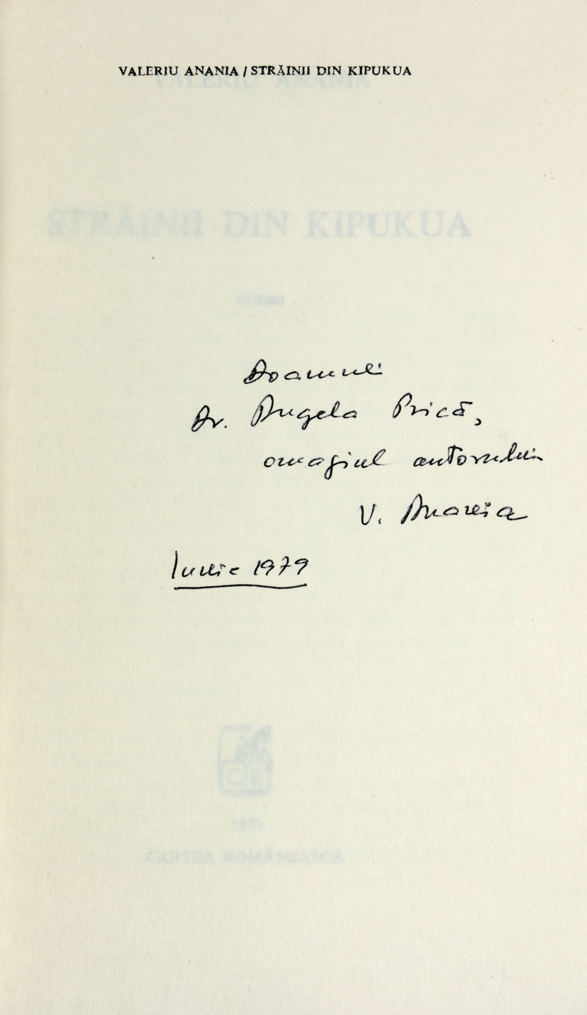 56. "Străinii din Kipukua", de Valeriu Anania, București, 1979, cu semnătura olografă și dedicația autorului