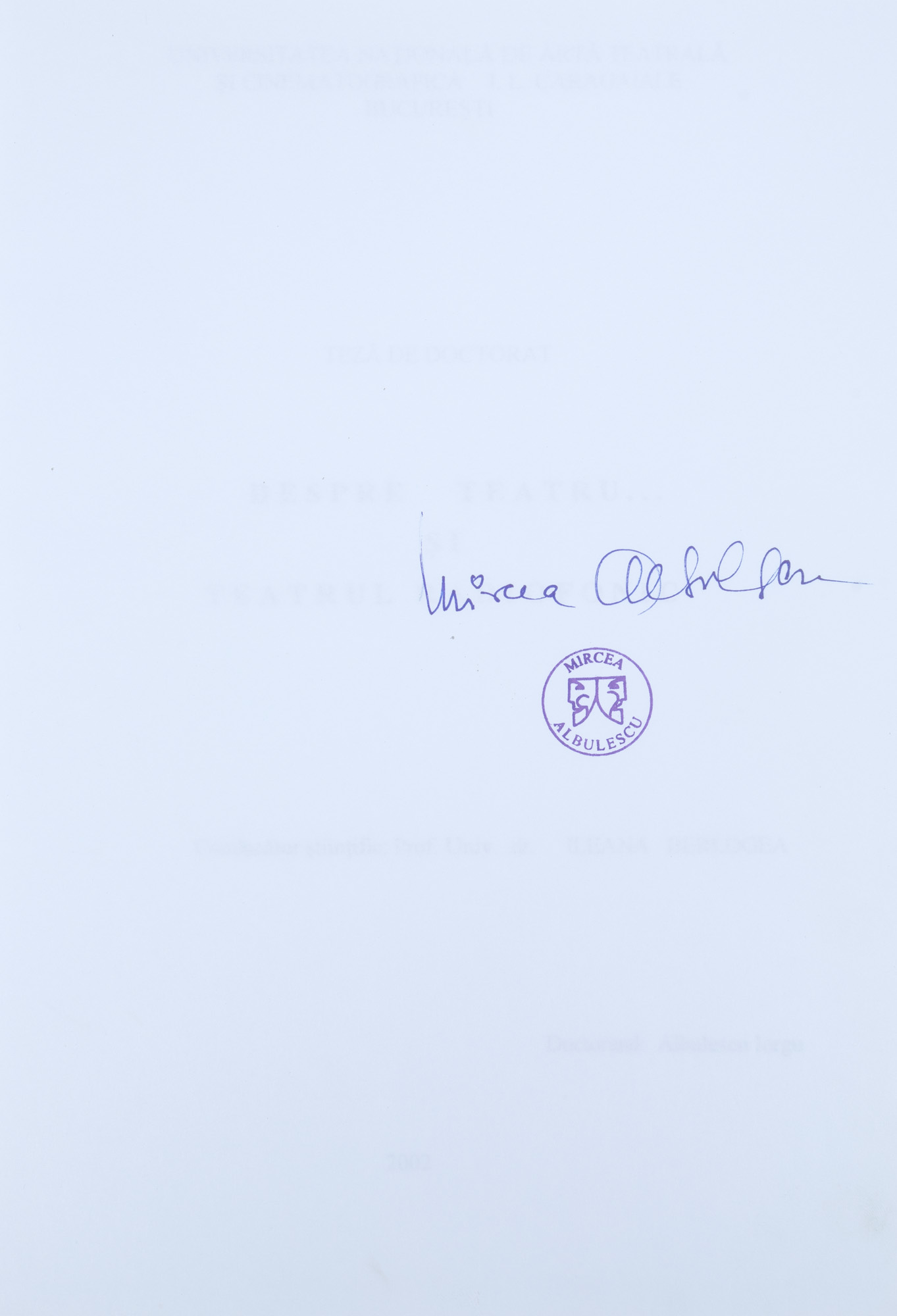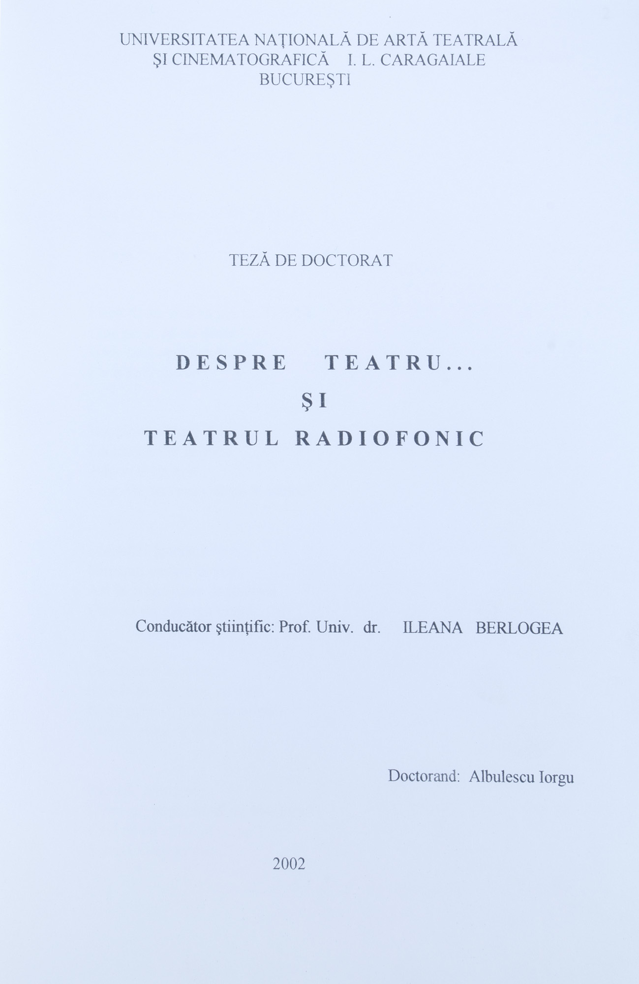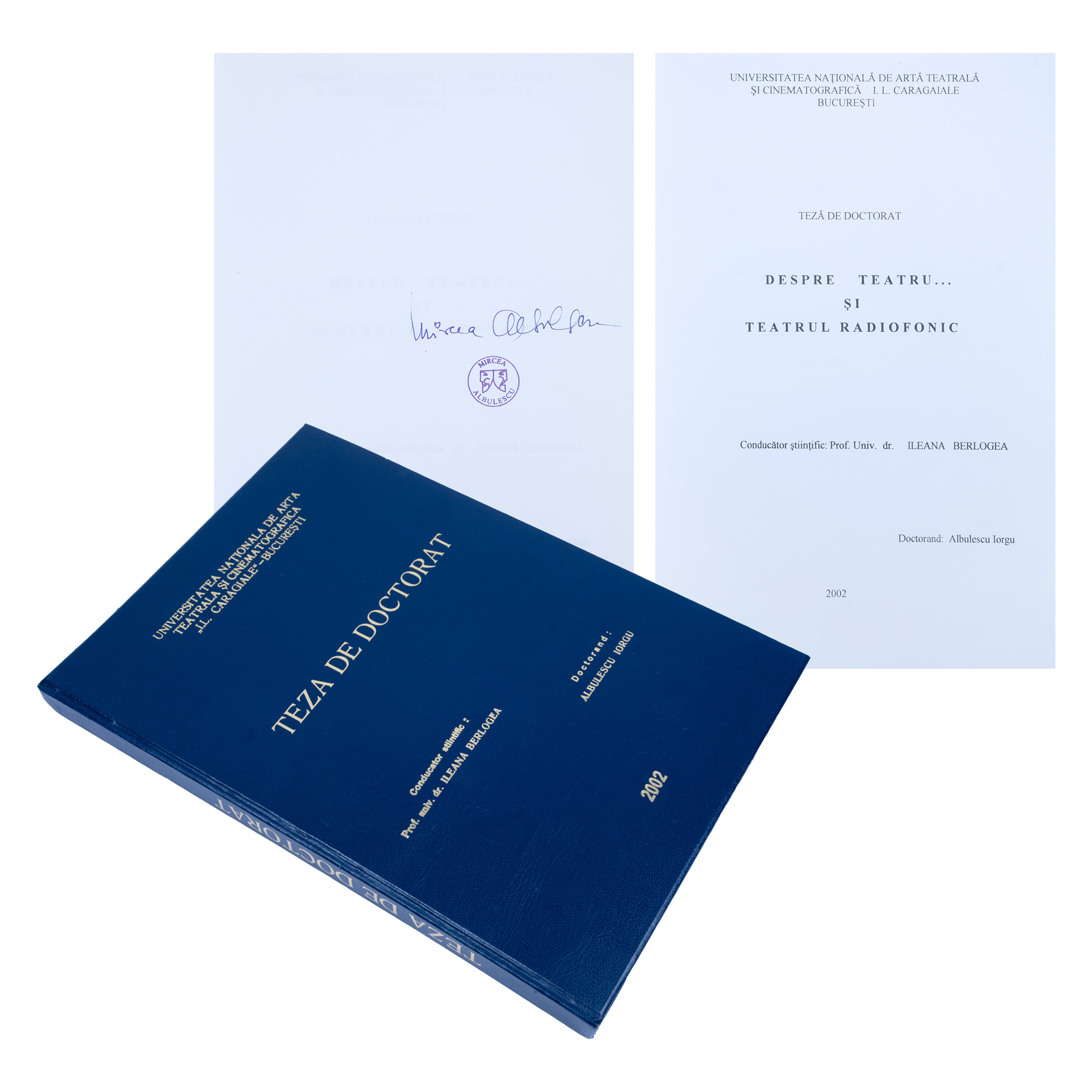 58. Teza de doctorat a lui Mircea Albulescu, ”Despre teatru... şi teatru radiofonic”, 2002, exemplarul autorului