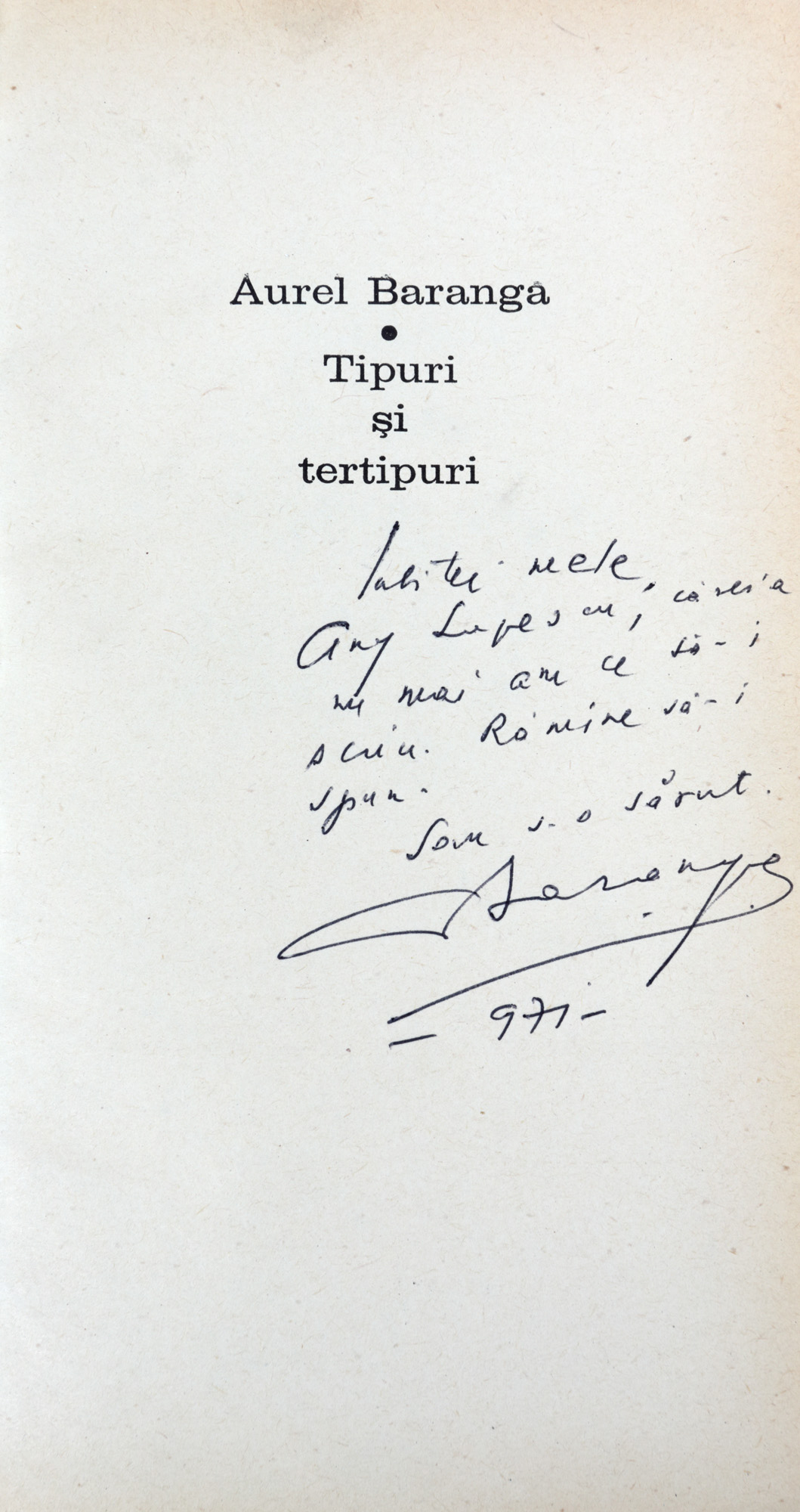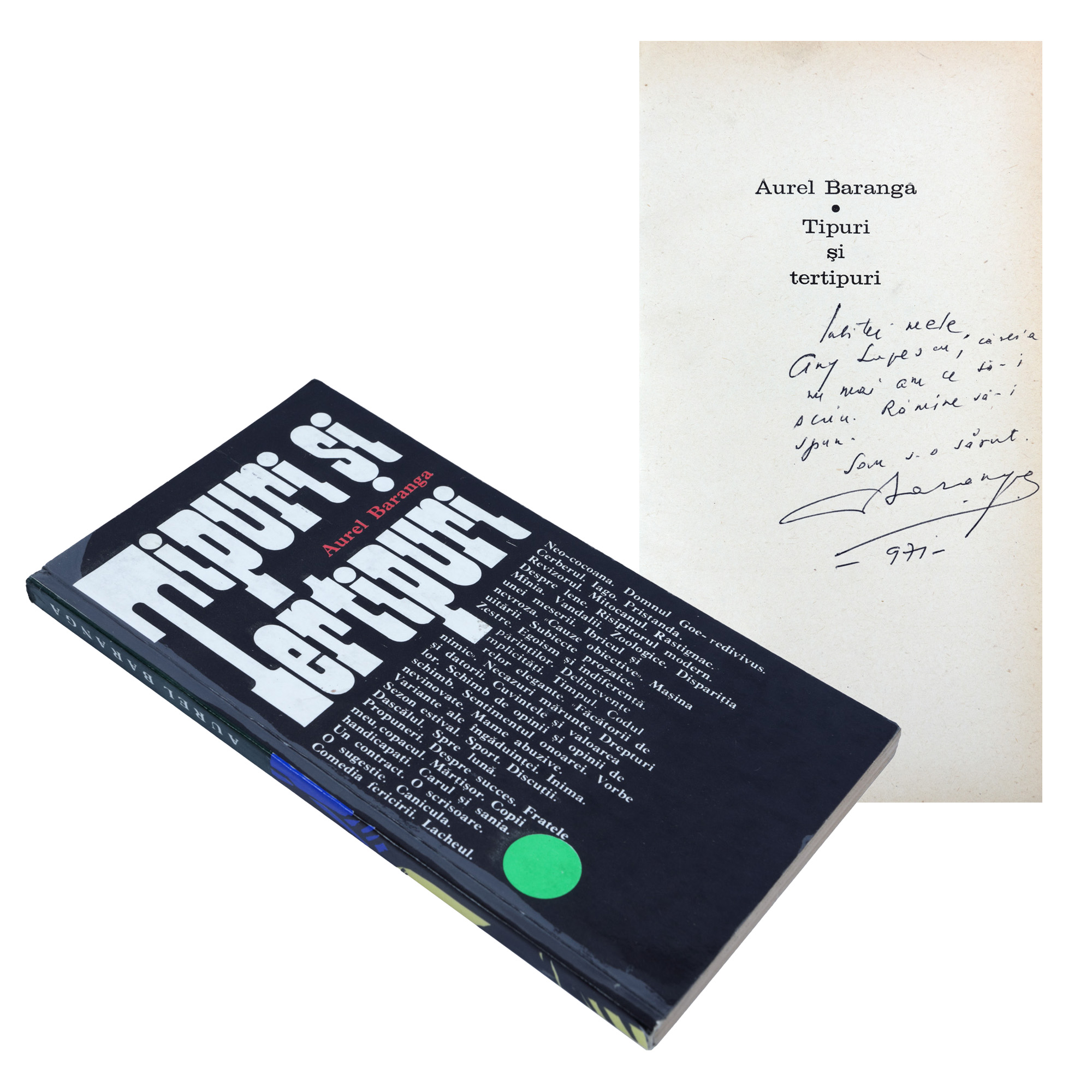 40. "Timpuri și tertipuri", de Aurel Baranga, București, 1971, cu semnătura olografă și dedicația autorului