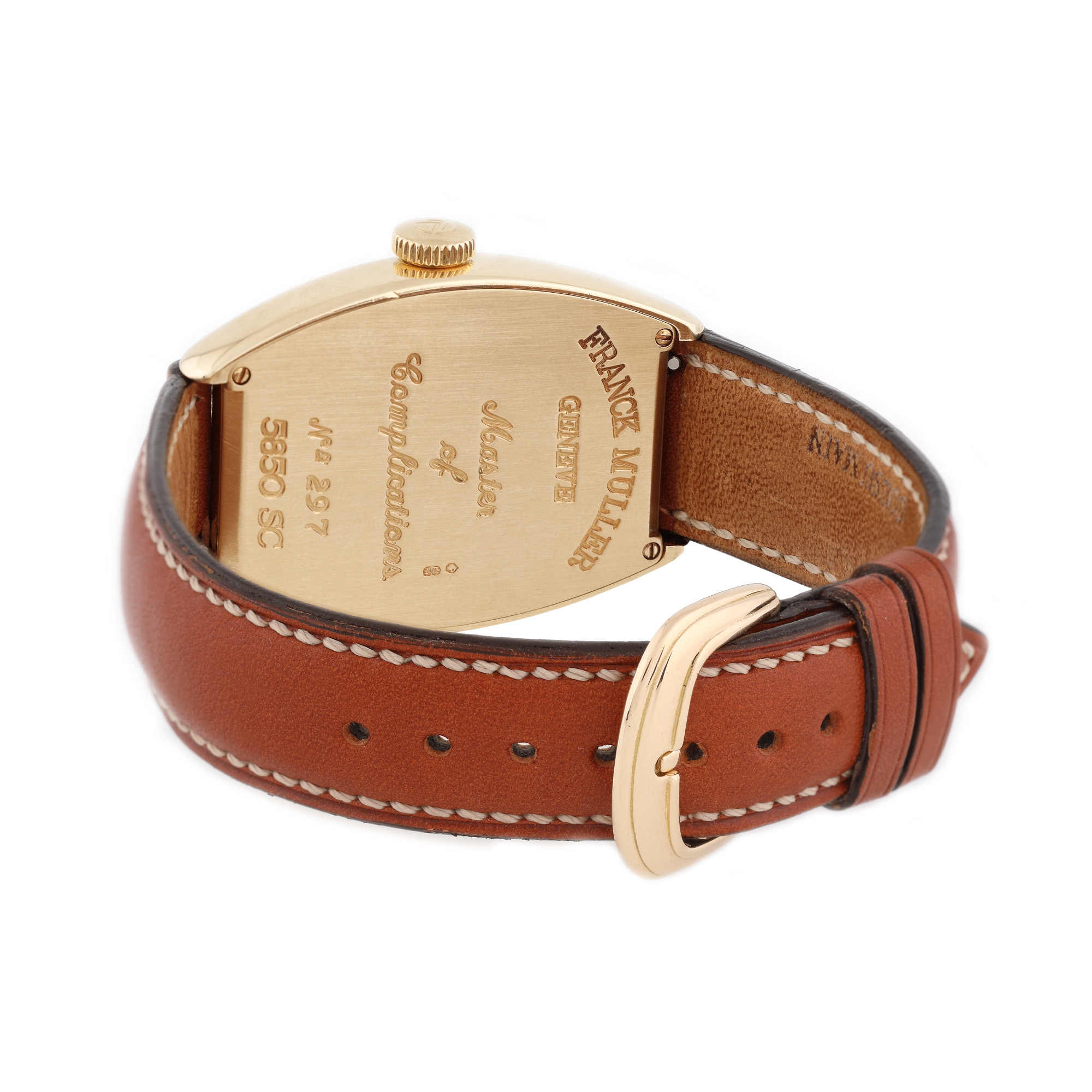 Ceas Franck Muller Casablanca, din aur, de mână, bărbătesc, referință 5850 sc, mecanism automatic. Cadran de culoare crem, decorat în tehnica guilloché, cu cifre arabe. Curea din piele de aligator și cataramă din aur, originale. Ceasul vine însoțit de actele de proveniență.