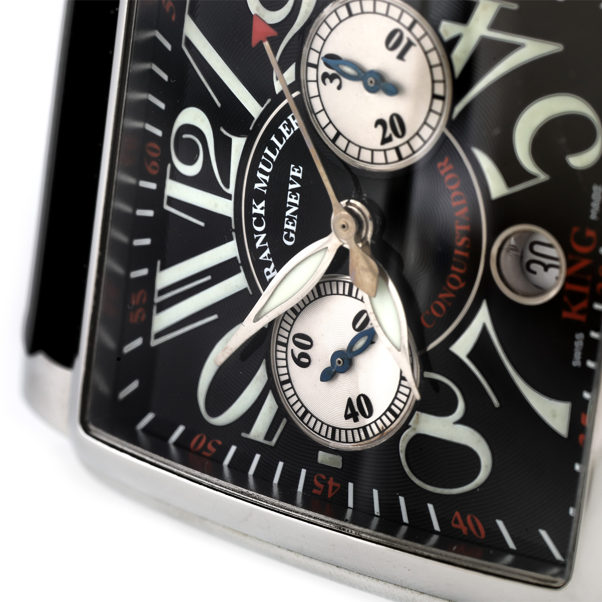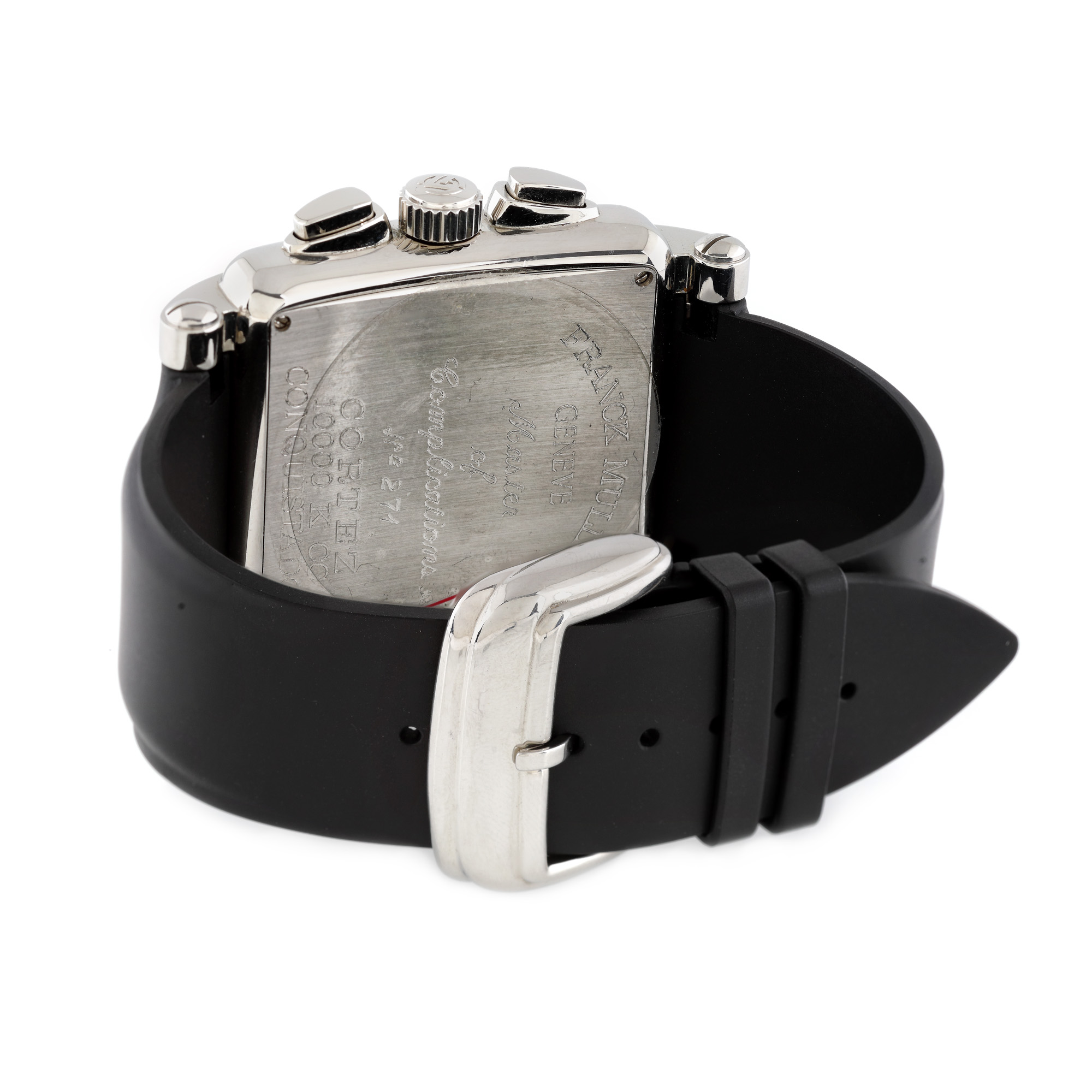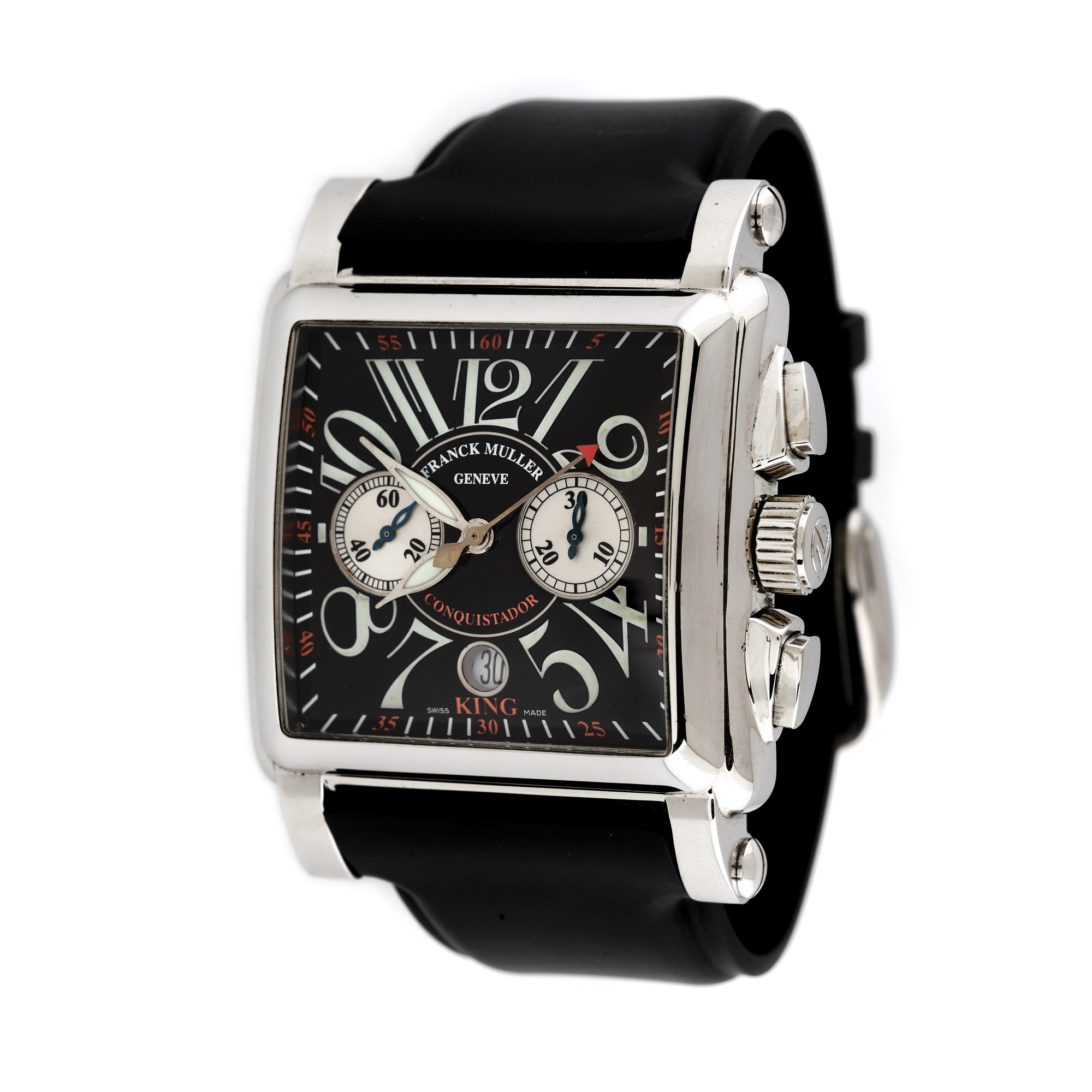 Ceas Franck Muller Conquistador, de mână, bărbătesc, referința 10000K CC, mecanism automatic. Cadran de culoare negru, numerale arabe, două registre și dată în dreptul orei 6. Curea din cauciuc, de culoare neagră și cataramă din oțel inoxidabil, originale. Ceasul vine însoțit de actele de proveniență.