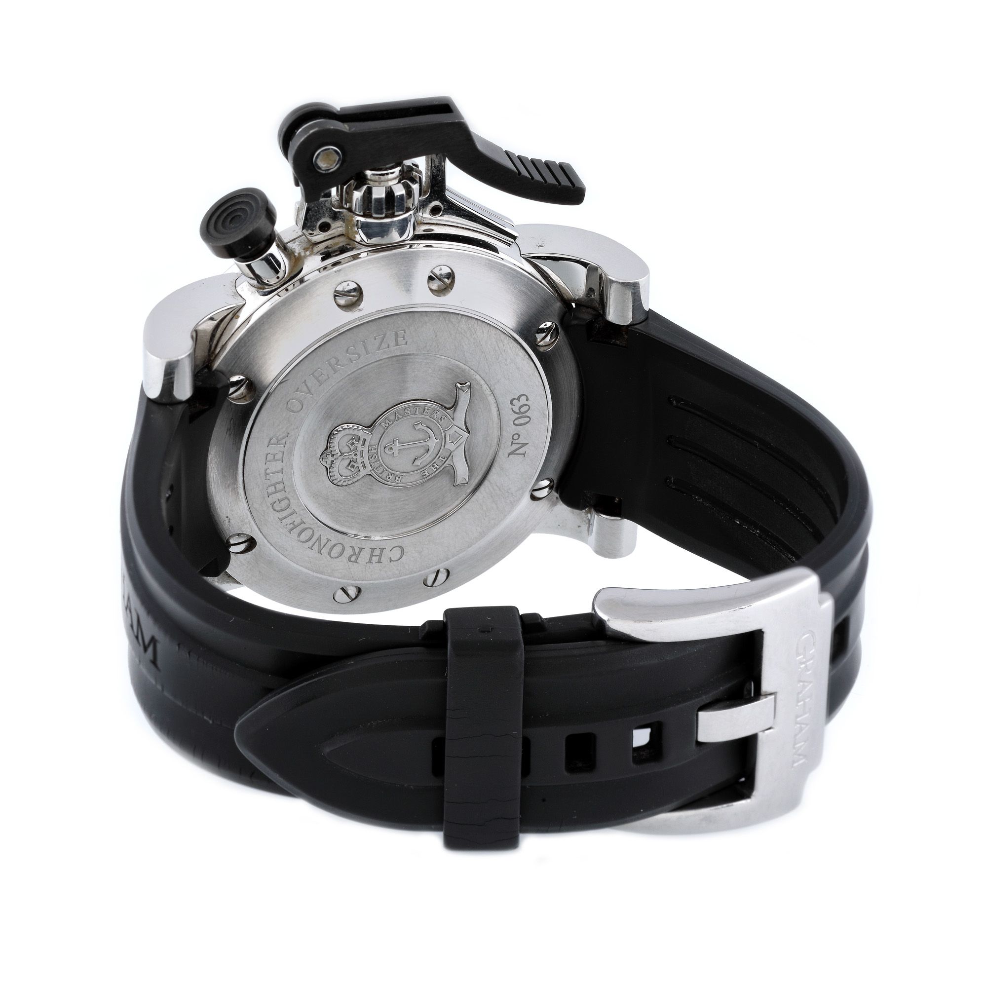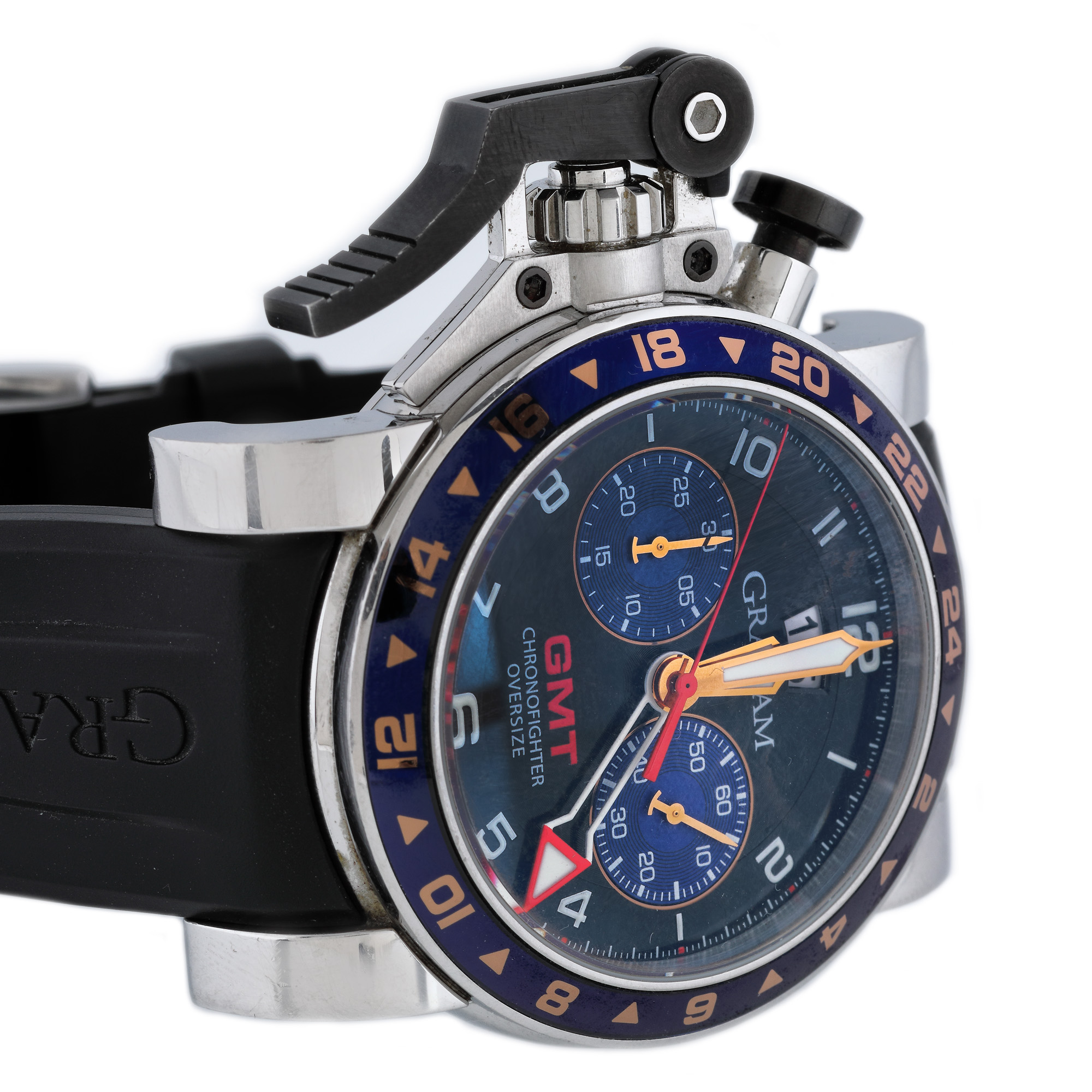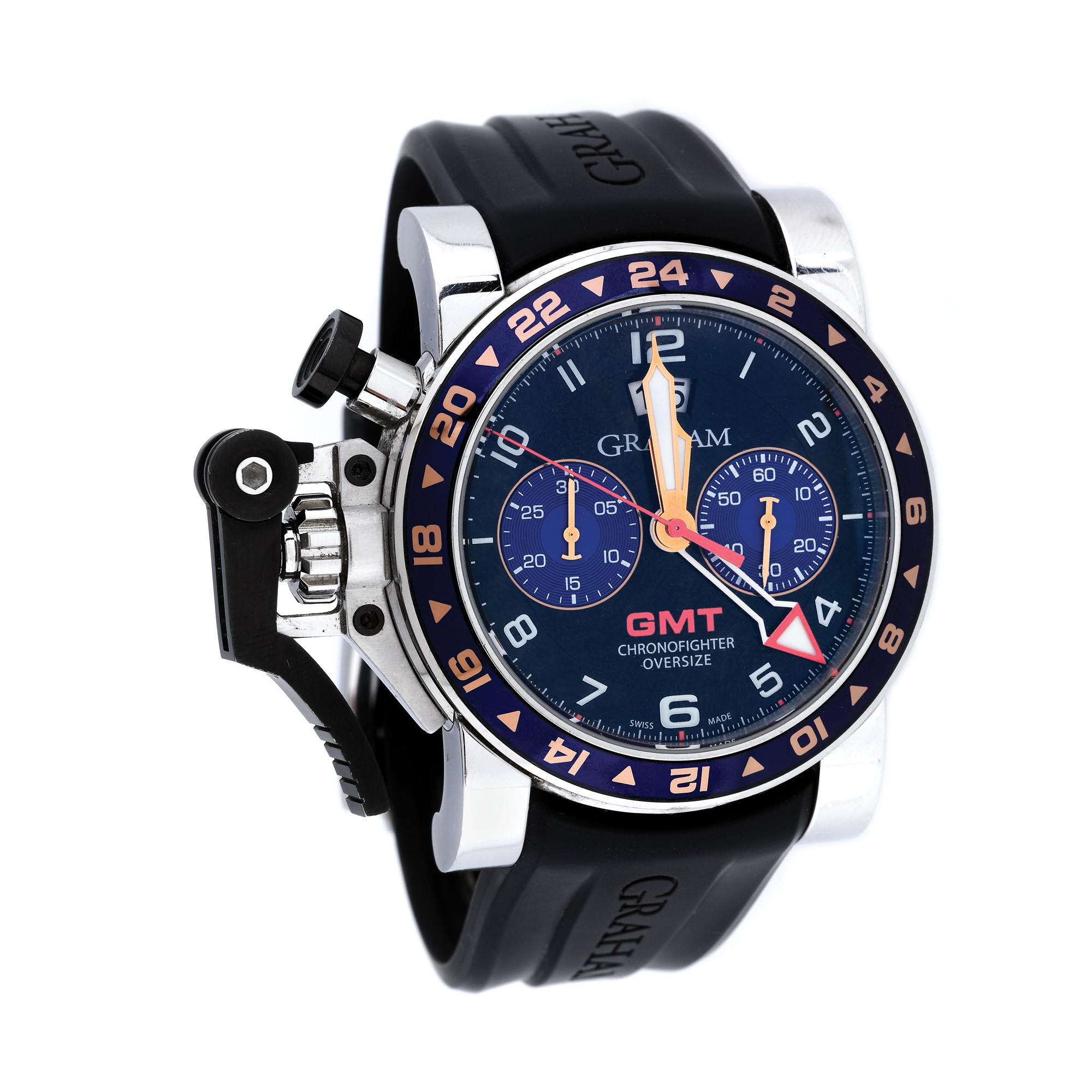 Ceas Graham Chronofighter, de mână, bărbătesc, referință 20vgs.b26a, mecanism automatic. Cadran de culoare negru, cu numerale arabe, două registre și dată în dreptul orei 12. Curea din cauciuc, de culoare neagră și închizătoare originală. Ceasul vine însoțit de actele de proveniență.