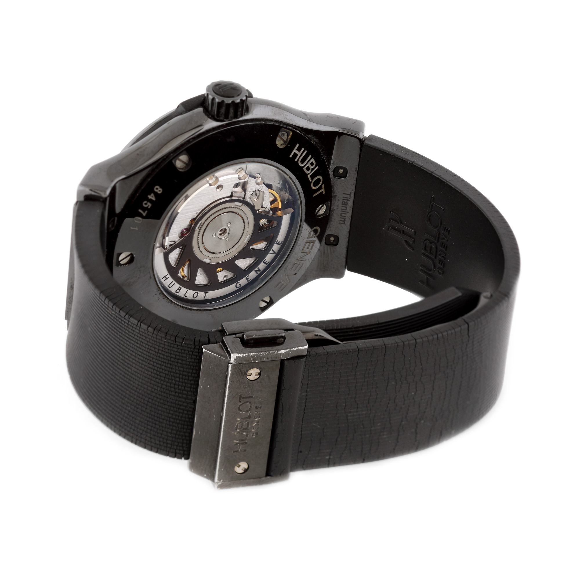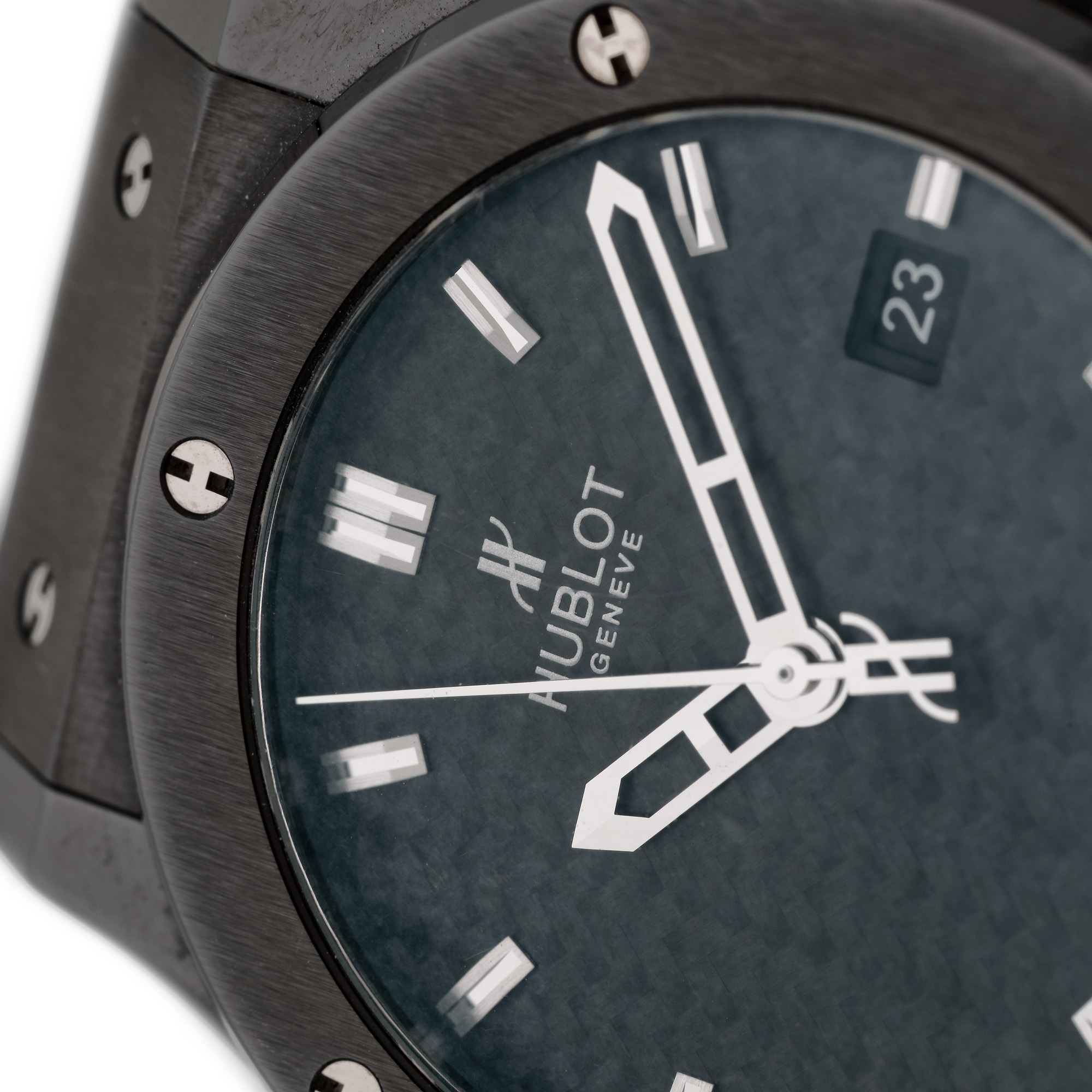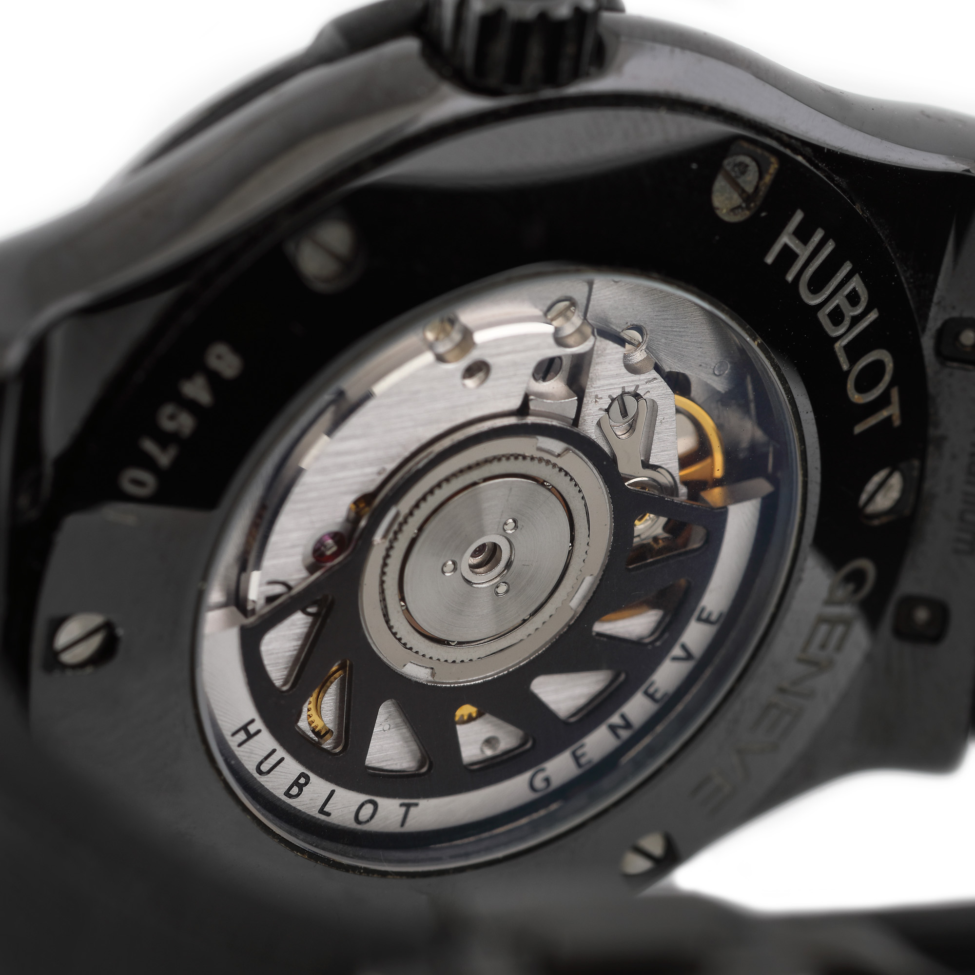 Ceas Hublot Classic Fusion Black, din ceramică, de mână. bărbătesc, referinţă 542.CM.1771.RX mecanism automatic, anterior vitrat. Cadran de culoare negru, decorat în tehnica guilloché, cu dată în dreptul orei 3. Curea din cauciuc si închizătoare de tip deployant, originale.