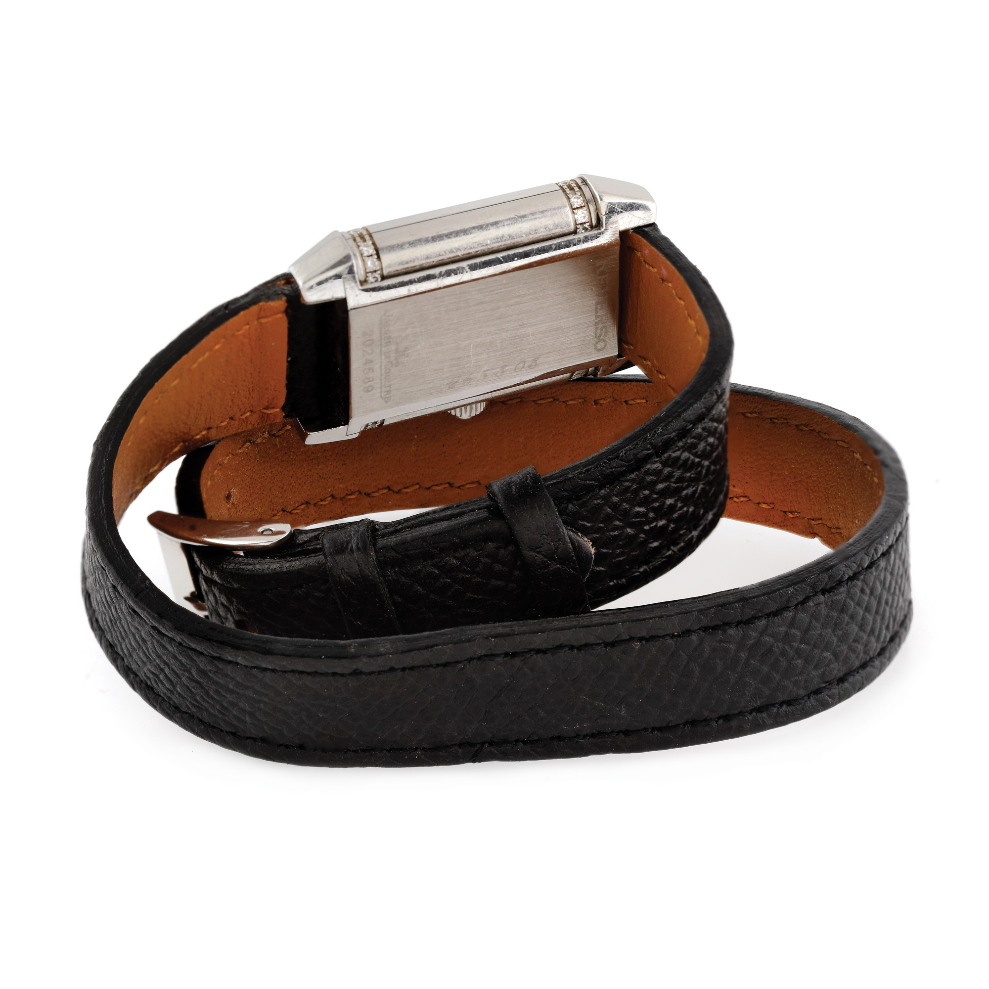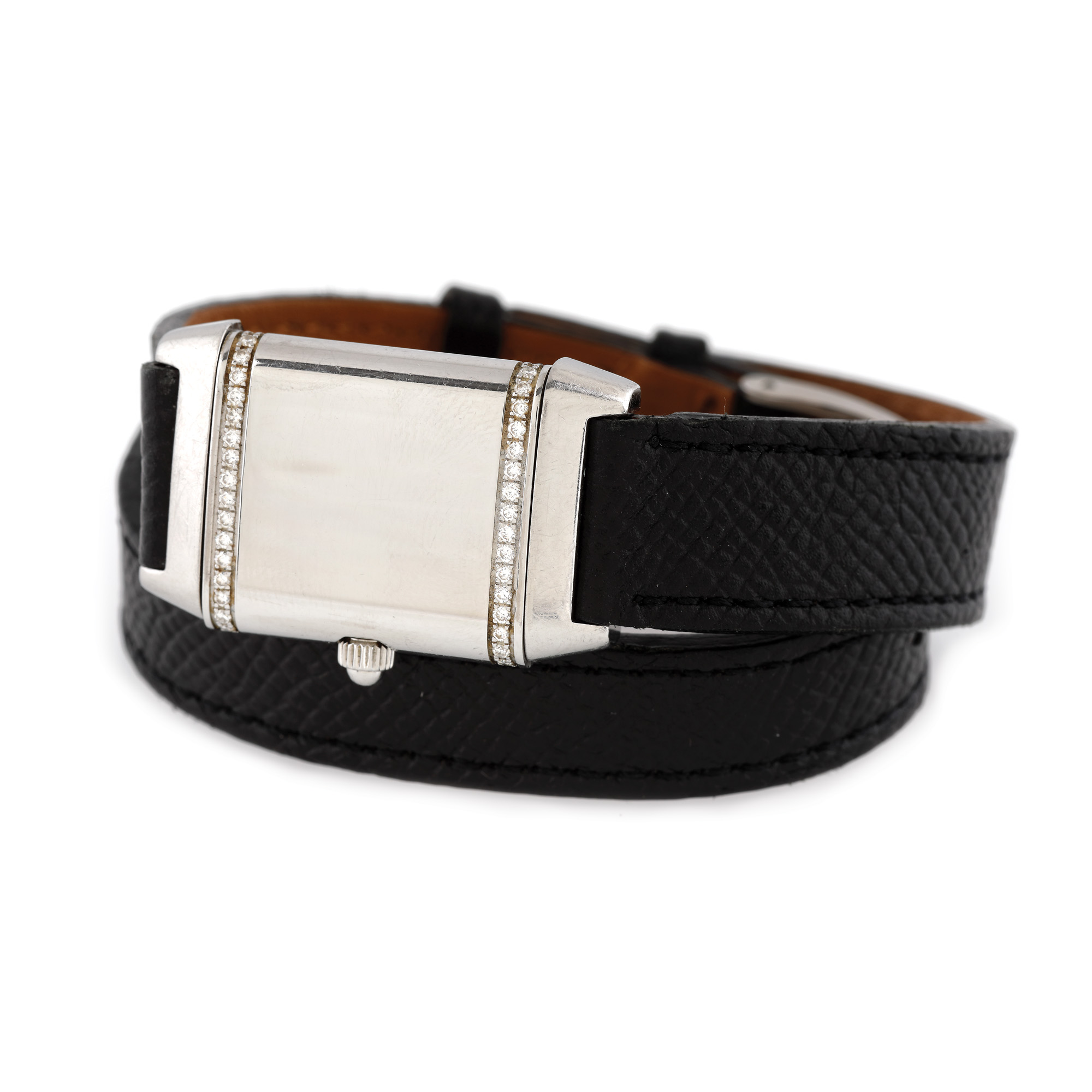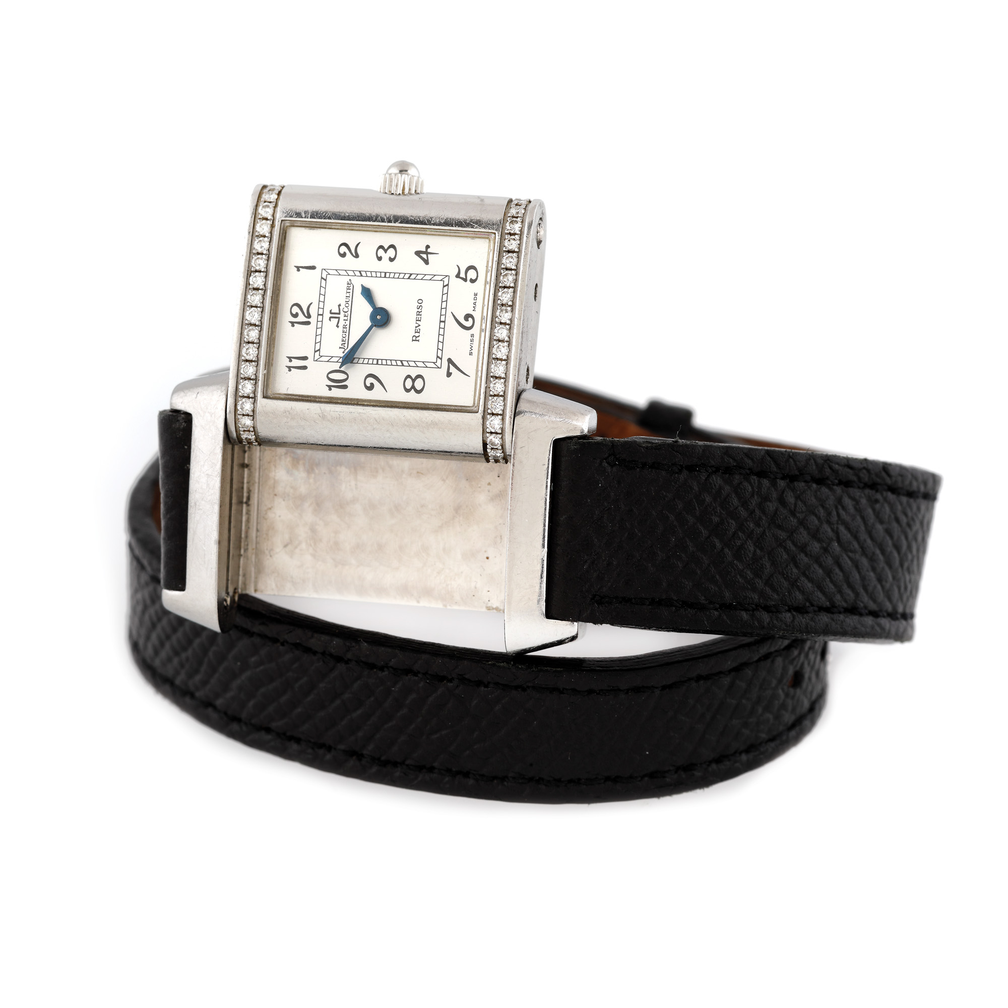 Ceas Jaeger-LeCoultre Reverso, de mână, de damă, decorat cu diamante, referință 265.8.08, mecanism quartz. Cadran silver cu numerale arabe. Curea din piele, de culoare neagră și cataramă, adăugate aftermarket. Ceasul vine însoțit de cutia originală.