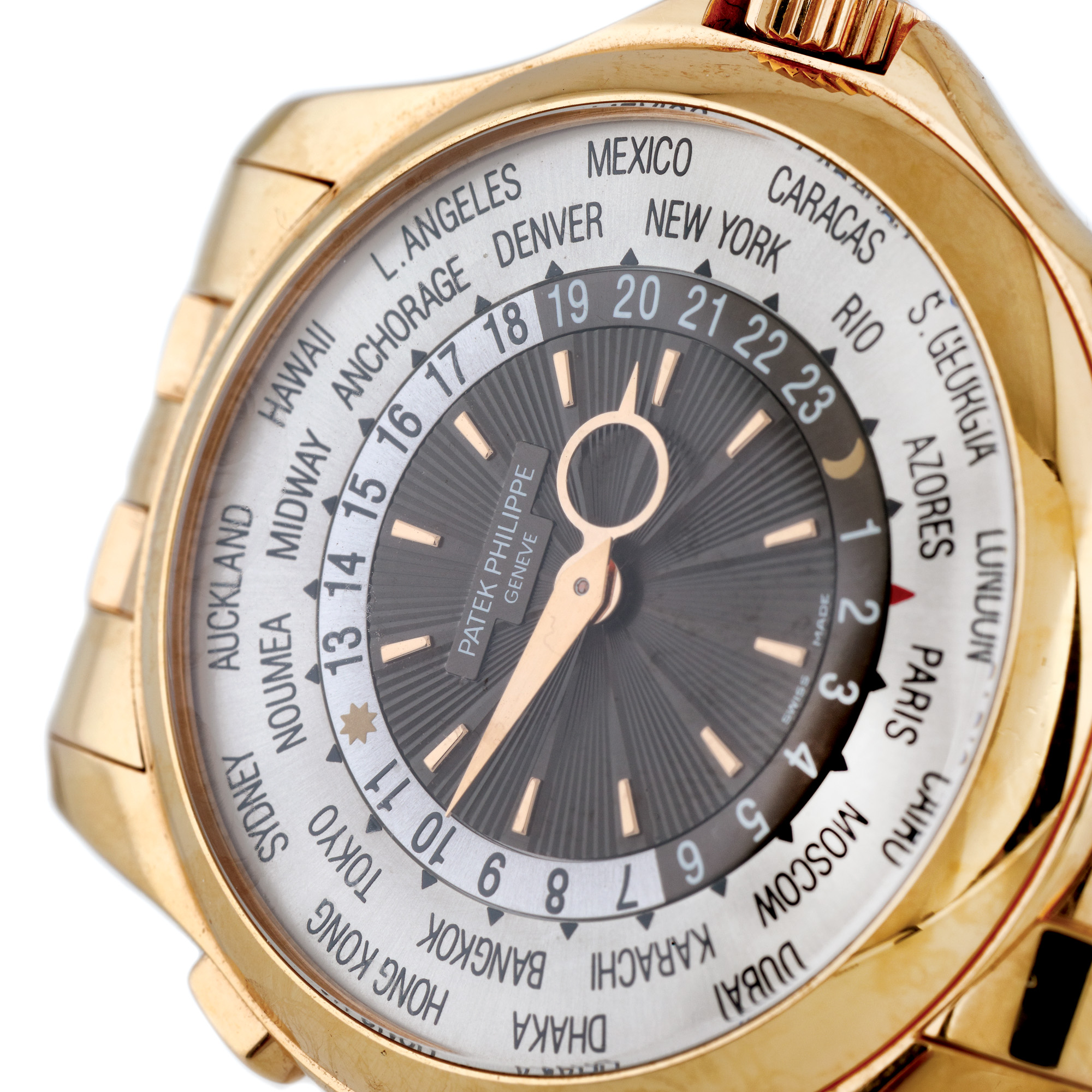 20. Ceas Patek Phillipe World Time, din aur, de mână, bărbătesc, vine însoțit de actele de proveniență și de cutia originală
