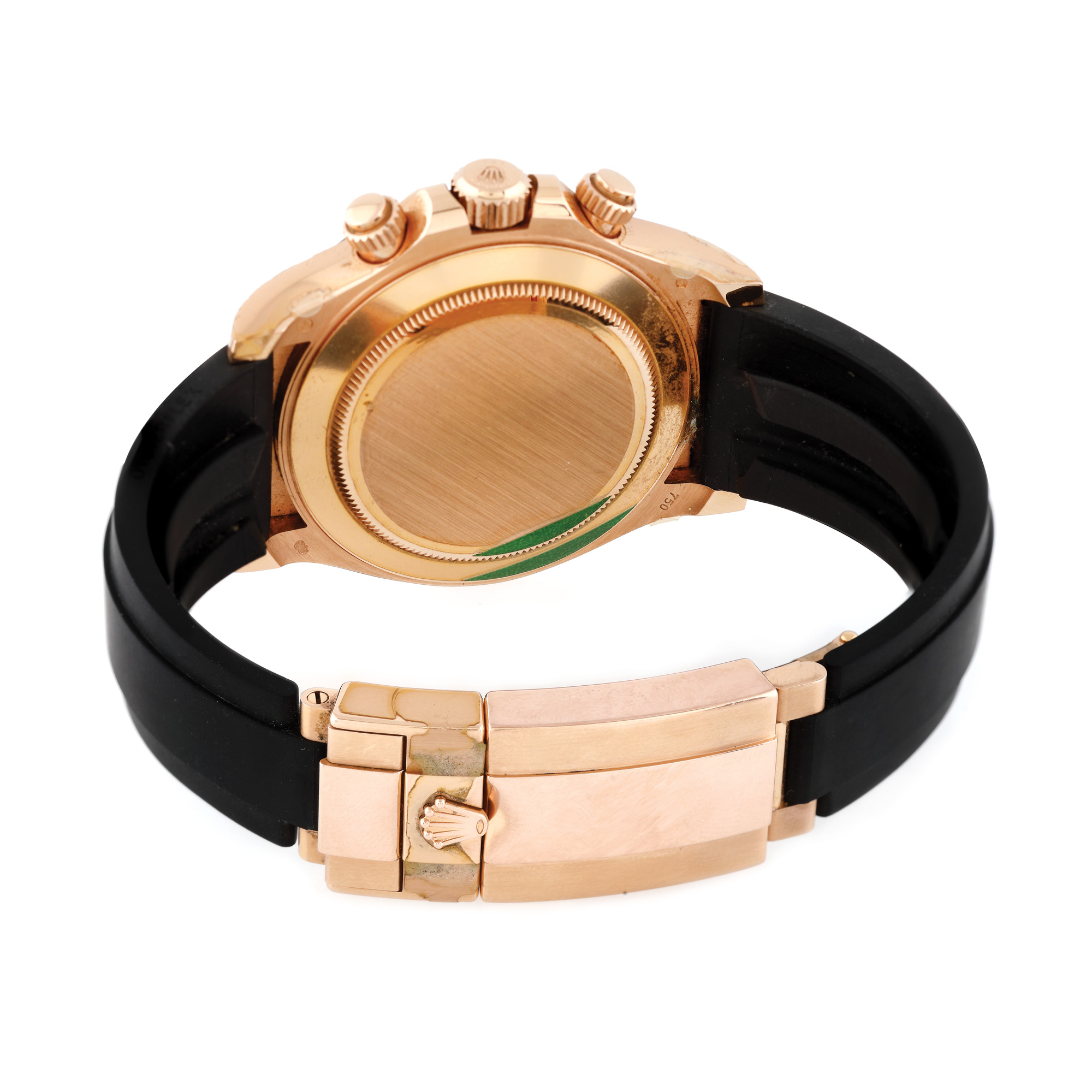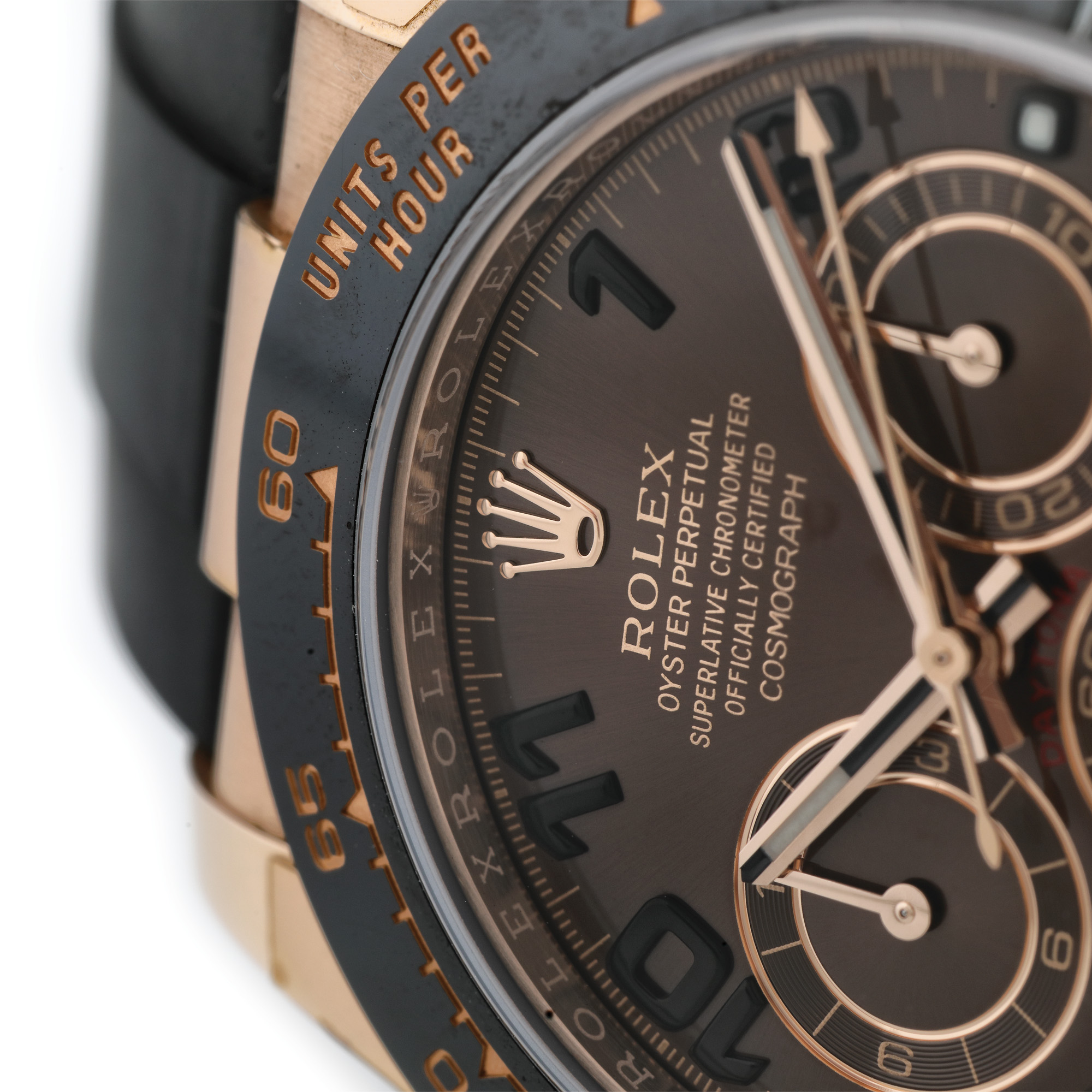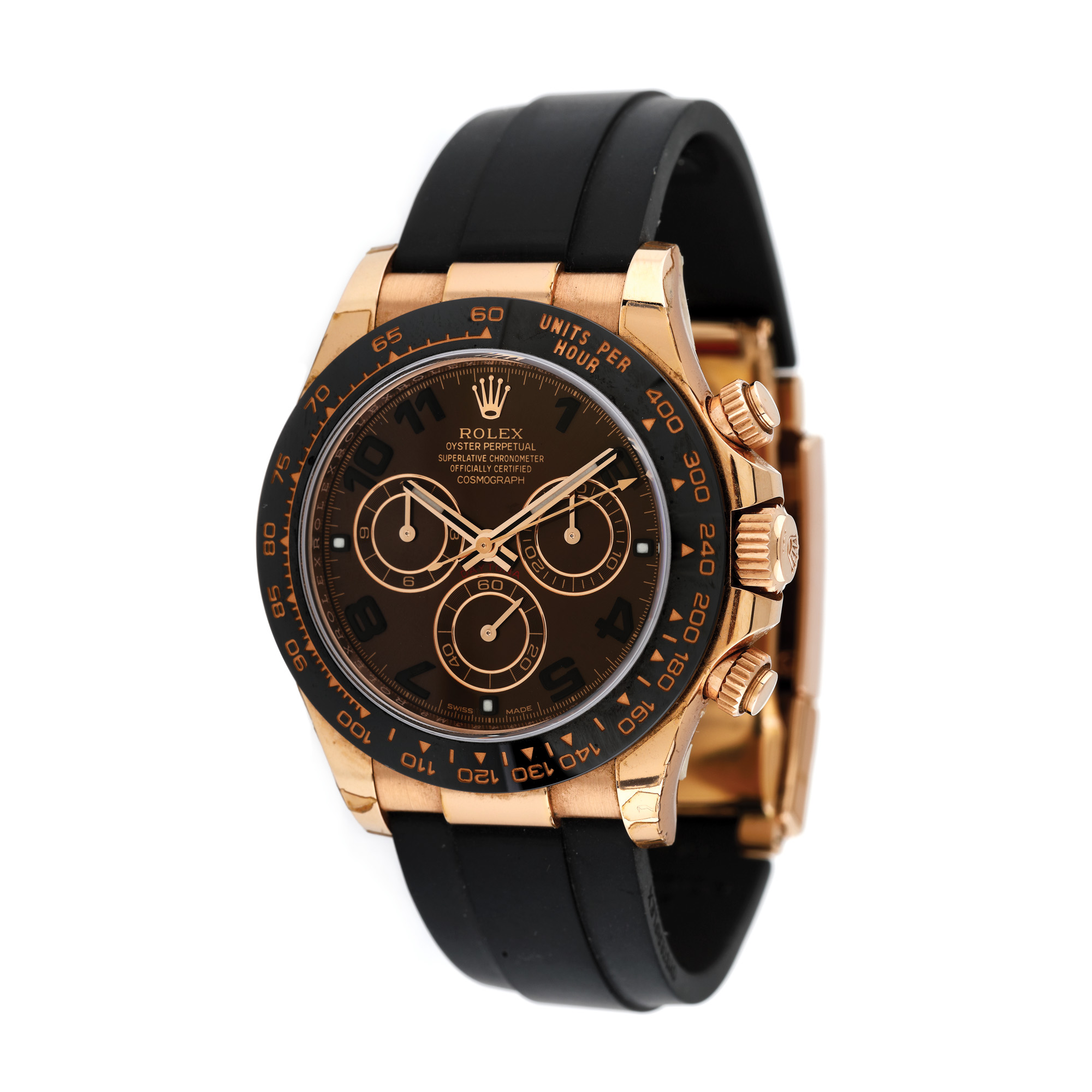 Ceas Rolex Daytona, din aur roz, de mână, bărbătesc, referința 116515-LNBR, mecanism automatic. Cadran "chocolate", cifre arabe și trei registre. Curea din cauciuc, de culoare neagră și sistem de închidere tip deployant, din aur, originale.
