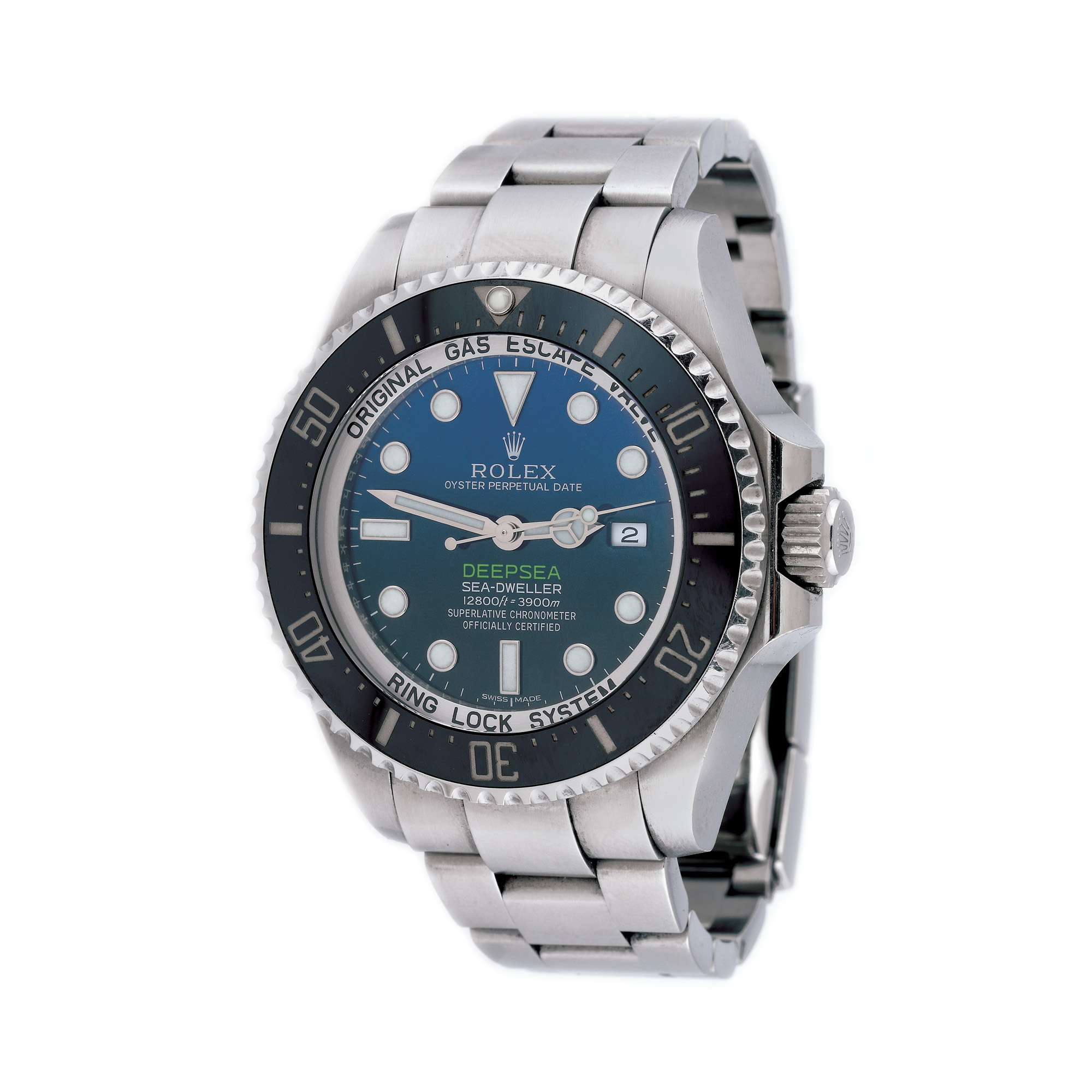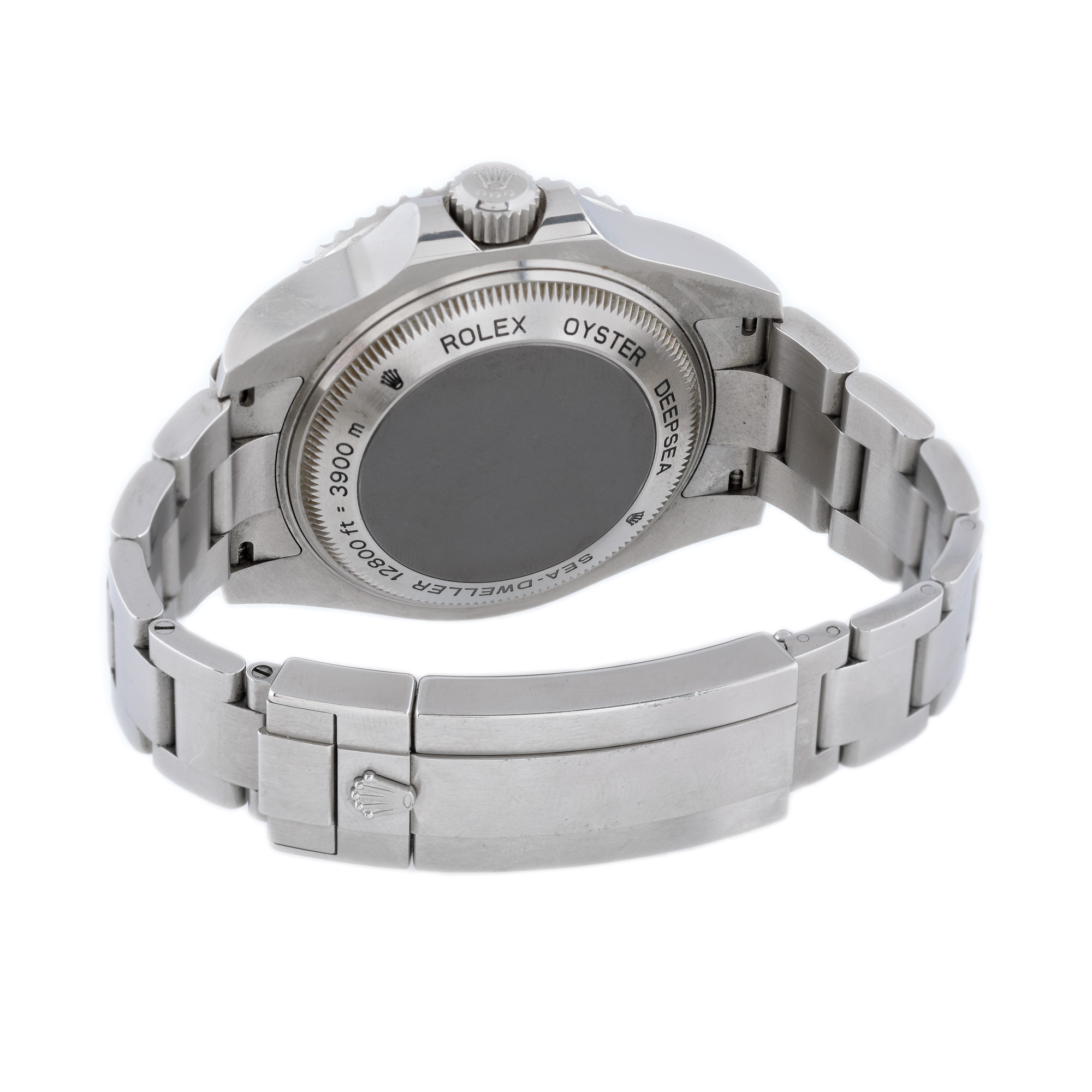 Ceas Rolex Deepsea Sea-Dweller, de mână, bărbătesc, referință 116660, mecanism automatic, calibru 3135, carcasă rezistentă la adâncimi de până la 3,900 m. Cadran colorat în degradé, de culoare albastru, cu indecși orari luminiscenți, dată în dreptul orei 3, bezel rotativ unidirecțional. Brățară și închizătoare tip deployant, originale. Ceasul vine însoțit de actele de proveniență și de cutia originală.