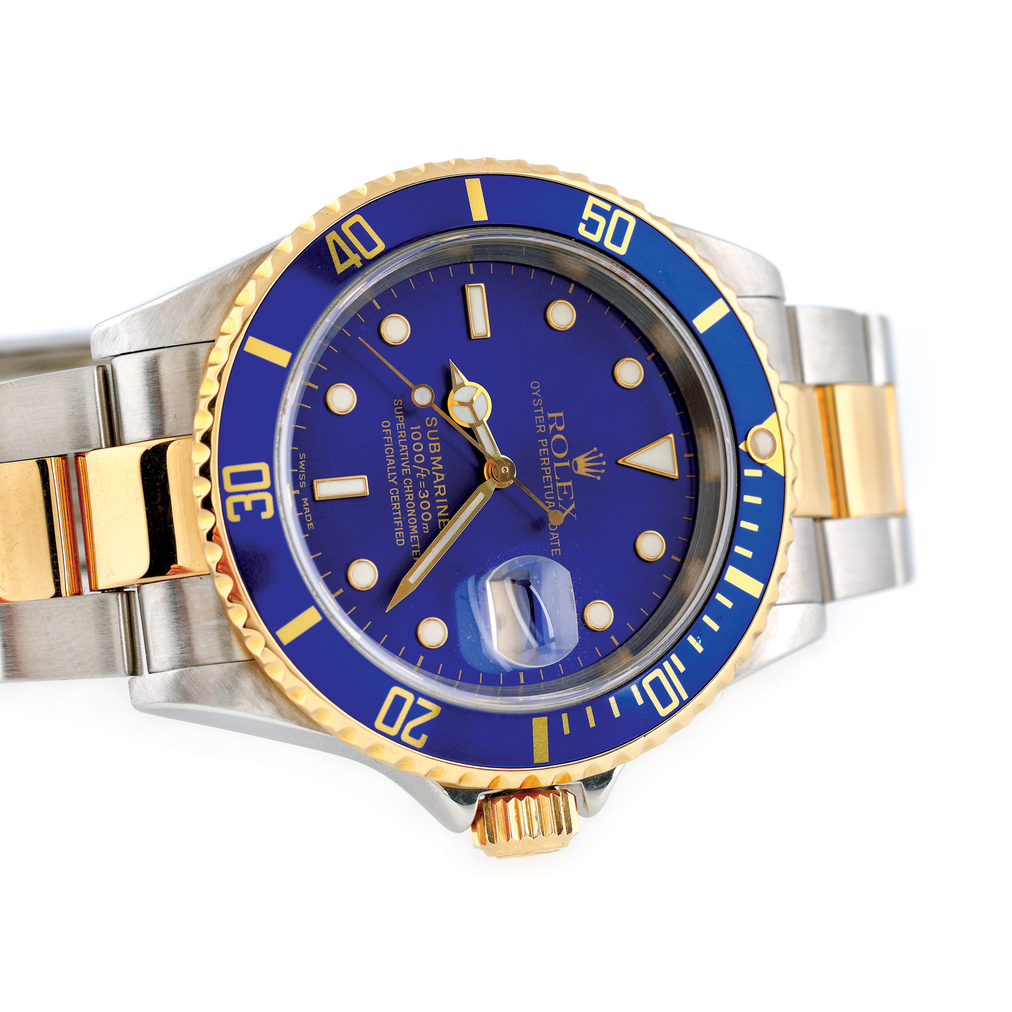 Ceas Rolex Submariner din aur și oțel, referință 16613, mecanism automatic, calibru 3135, cu rezervă de timp 40 h. Cadran de culoare albastru, indecși orari luminiscenți, bezel rotativ unidirecțional, gravat cu numerale arabe și dată cu lupă la ora 3. Brățară și sistem de închidere tip deployant, originale.