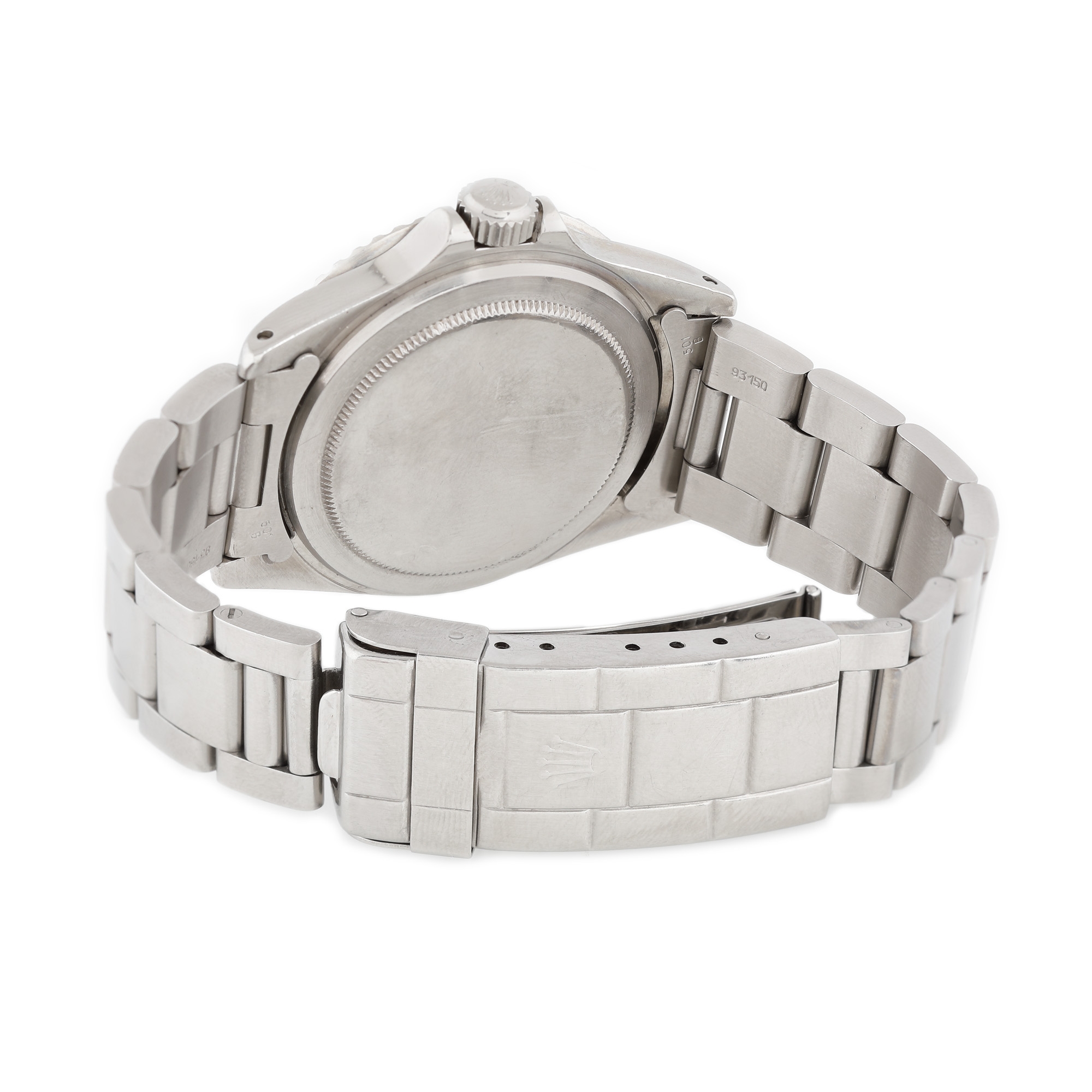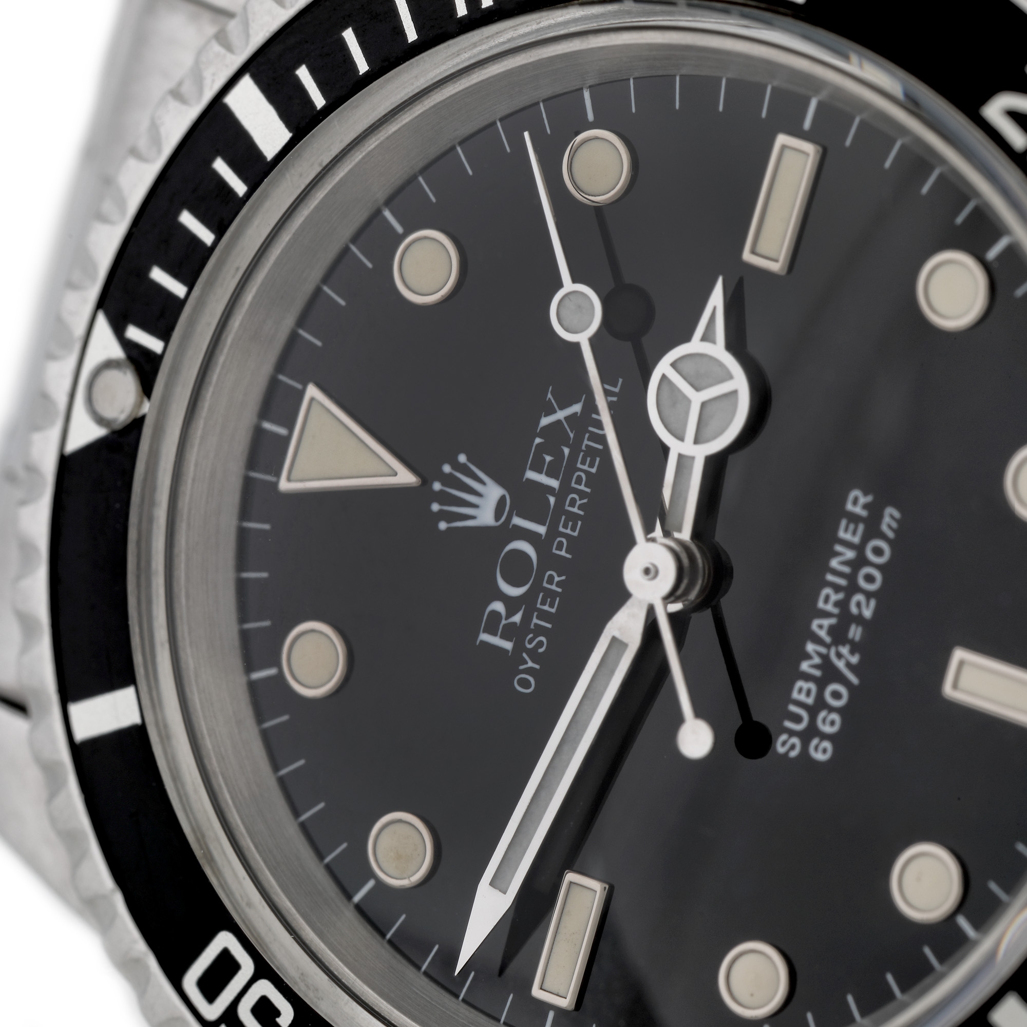 Ceas Rolex Submariner vintage, de mână, bărbătesc, referință 5513, mecanism automatic. Cadran negru, cu indecși orari luminiscenți și bezel rotativ unidirecțional. Brățară și sistem de închidere tip deployant, originale.