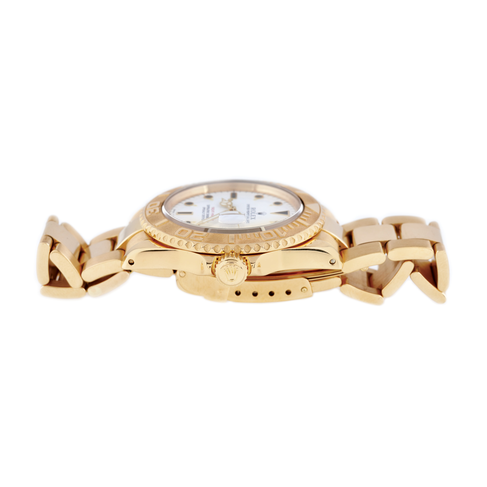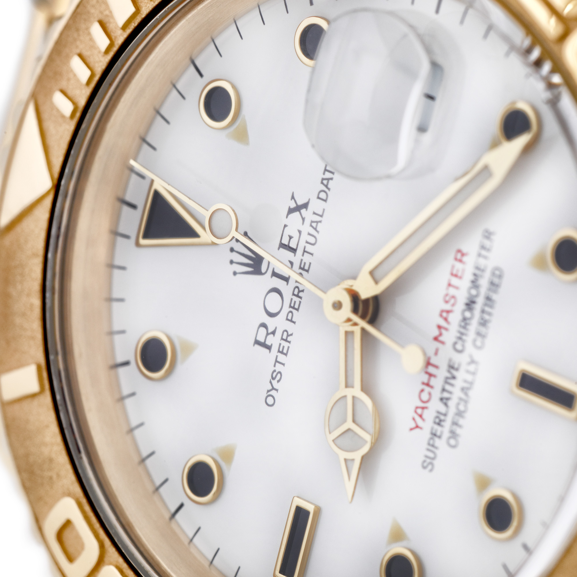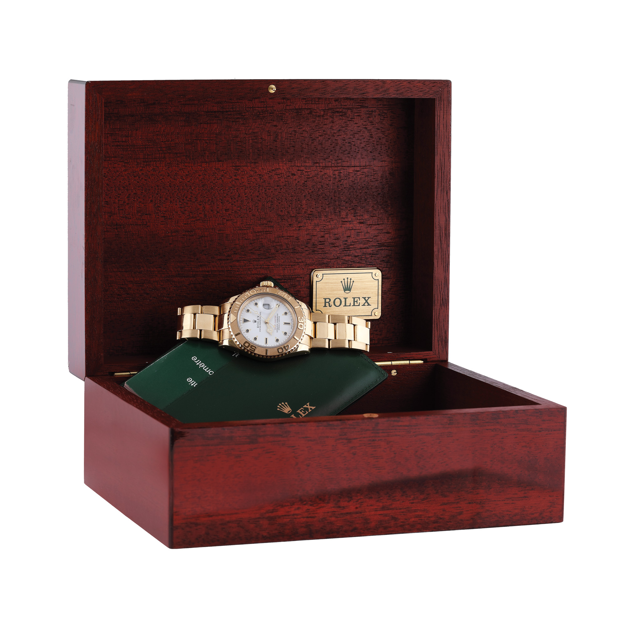 Ceas Rolex Yacht Master, din aur, de mână, bărbătesc, referință 16628, mecanism automatic, calibru 3135. Cadran de culoare alb, bezelul marcat cu numerale arabe și dată cu lupă în dreptul orei 3. Brățară și sistem de închidere tip deployant, din aur, originale. Ceasul vine însoțit de manualul de utilizare și cutie Rolex din lemn, originală.